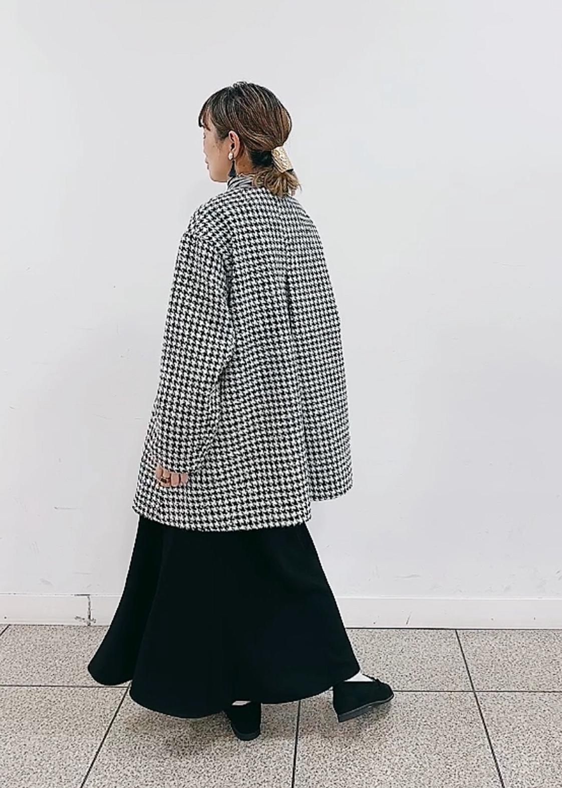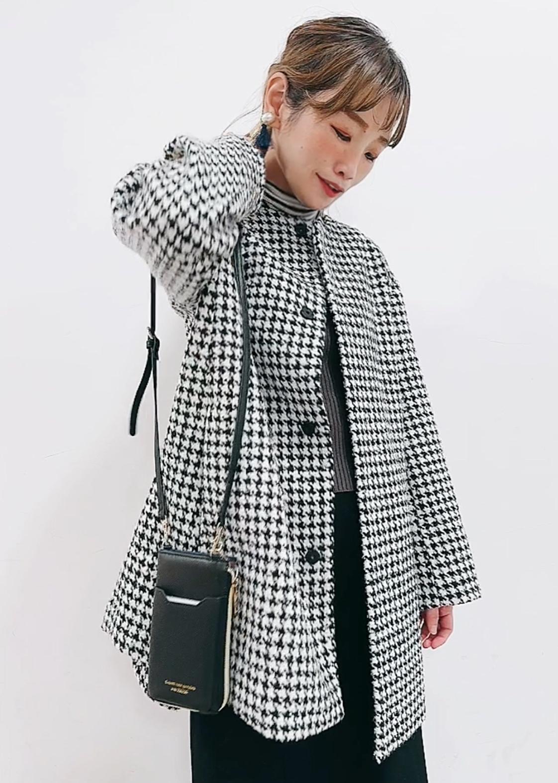千鳥柄がレトロな印象のノーカラーコートのコーデです。