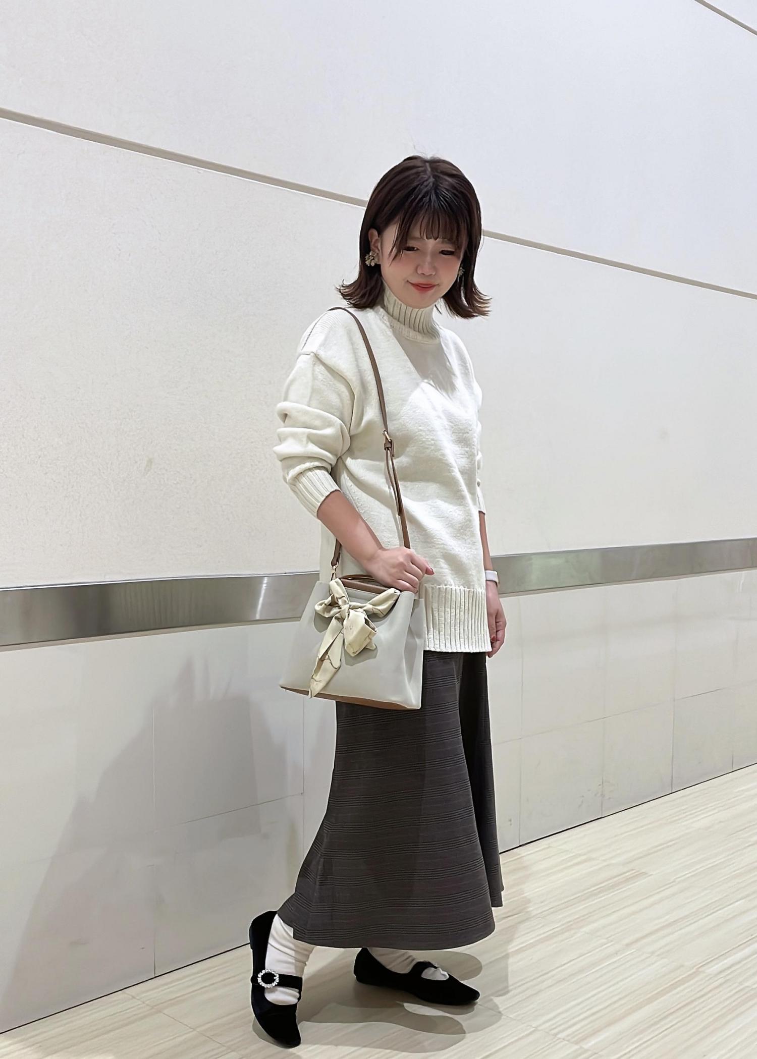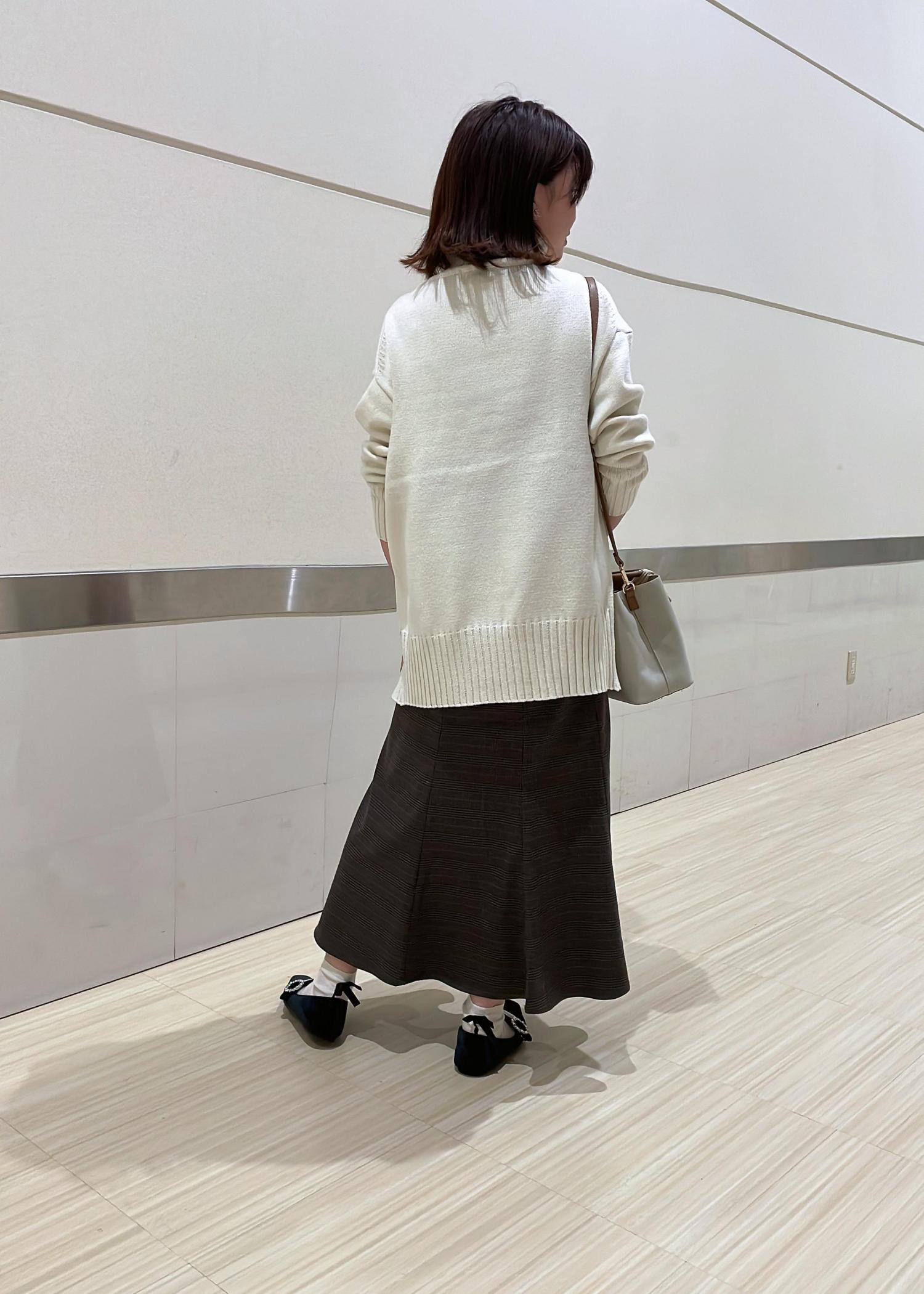 人気のニットにマーメイドスカートを合わせて、お出かけコーディネートにしてみました! マーメイドスカートはフェミニンさが出るのでデートコーディネートにもオススメです。 ニットは長さがあるので、シルエットも綺麗ですよ!