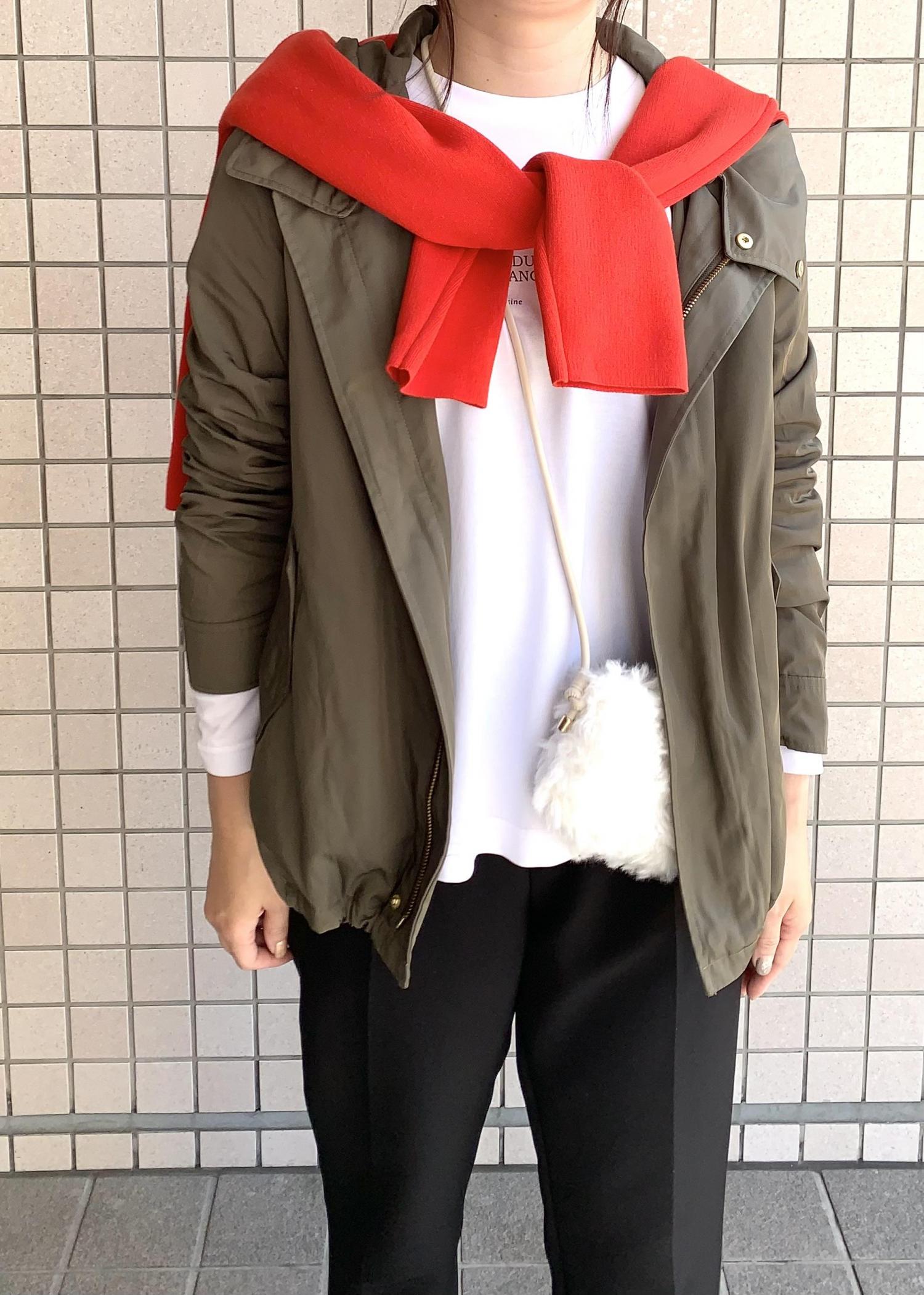 赤のカーディガンを差し色で入れるとオシャレ感がより出ます♪