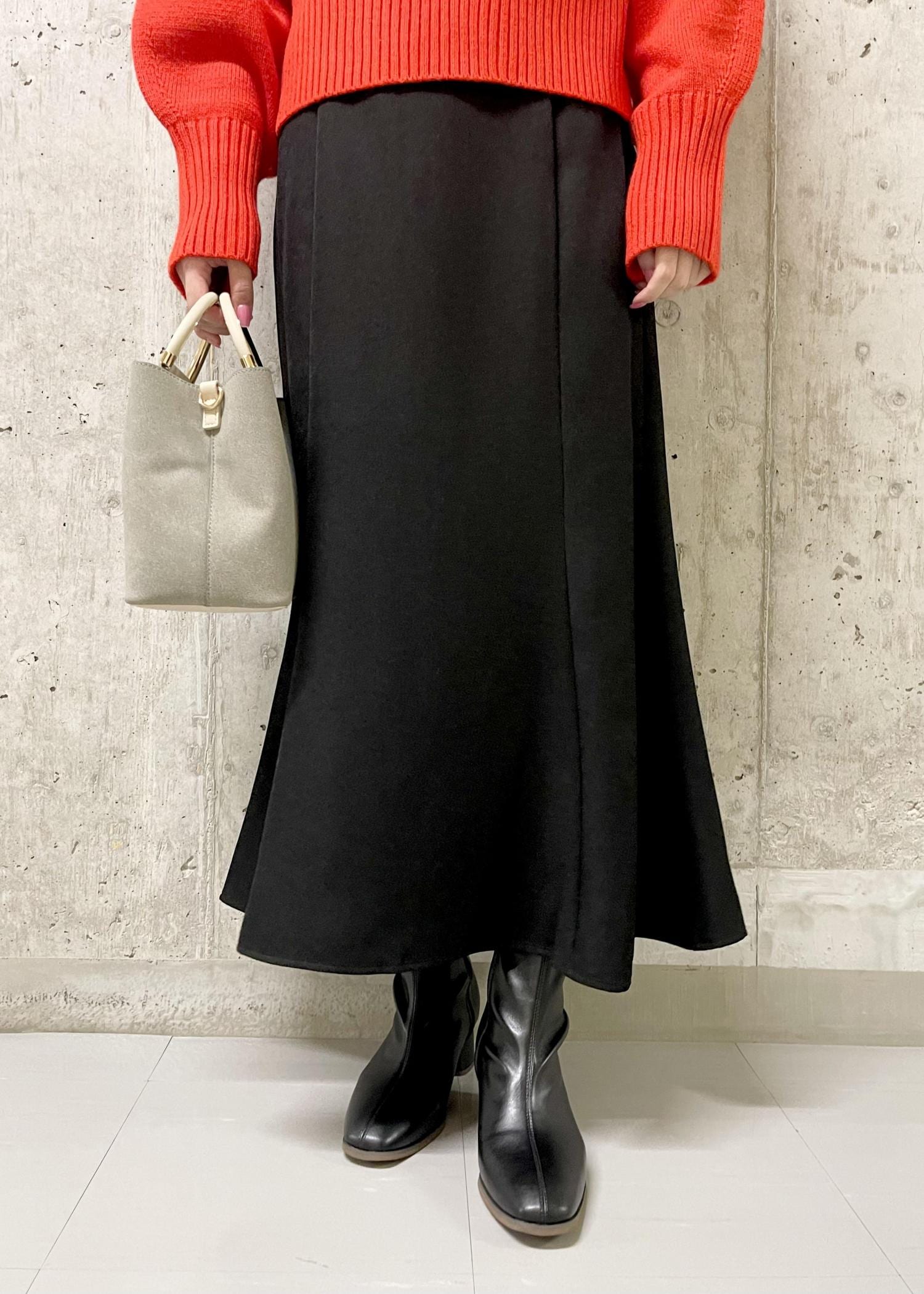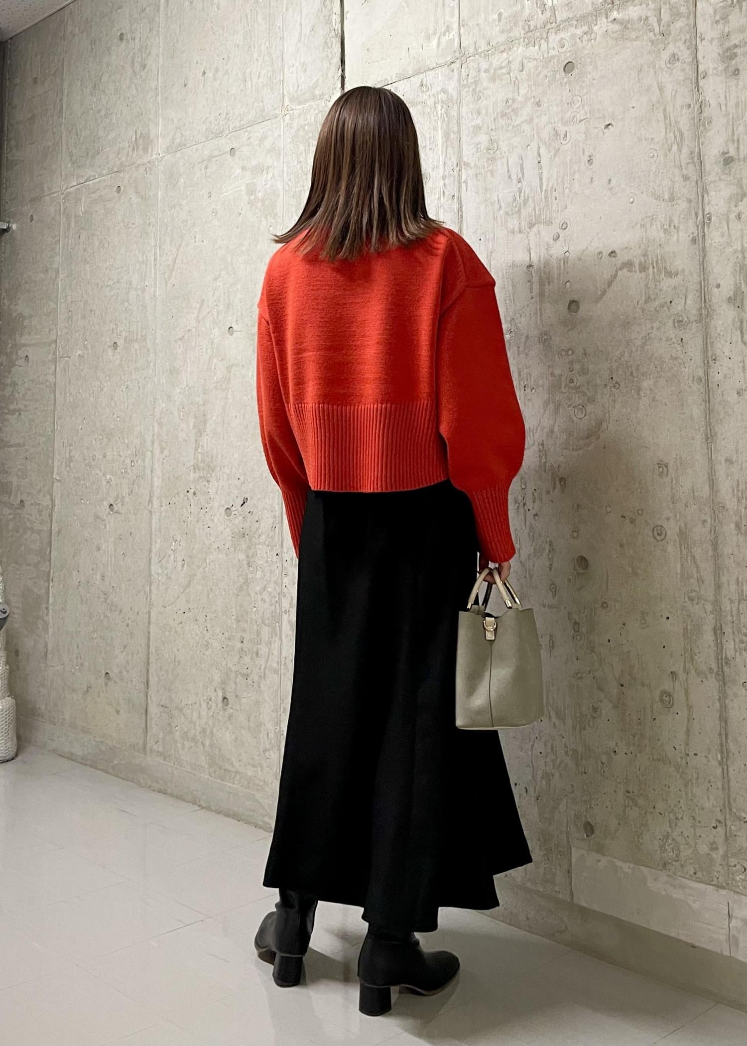 赤のカラーニット×チェックブラウスで秋冬らしいコーディネートに仕上げました◎