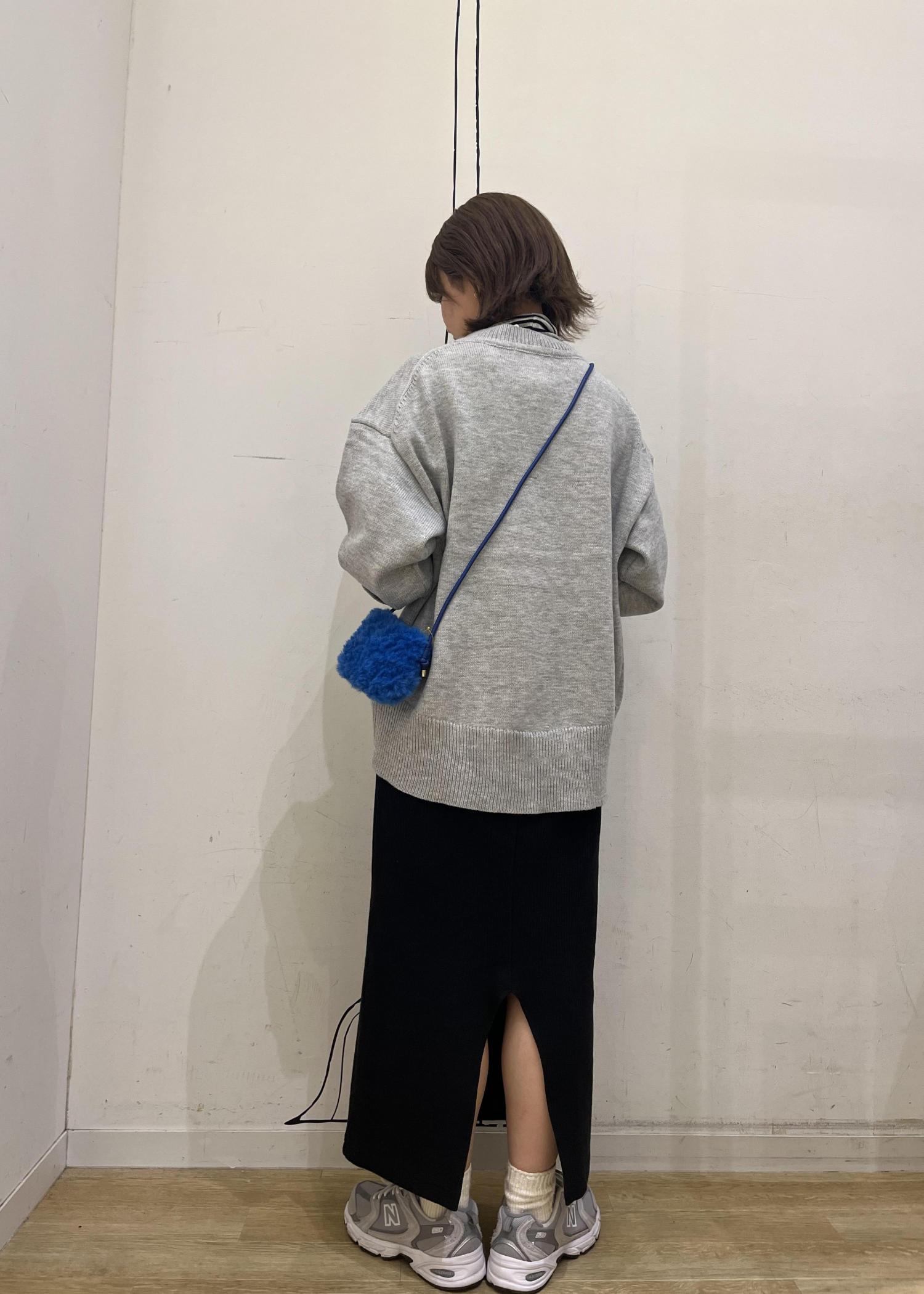 グレーのニットを使ったカジュアルなスタイリングです! シンプルなニットにボーダーのシアータートルをレイヤードしてみました!