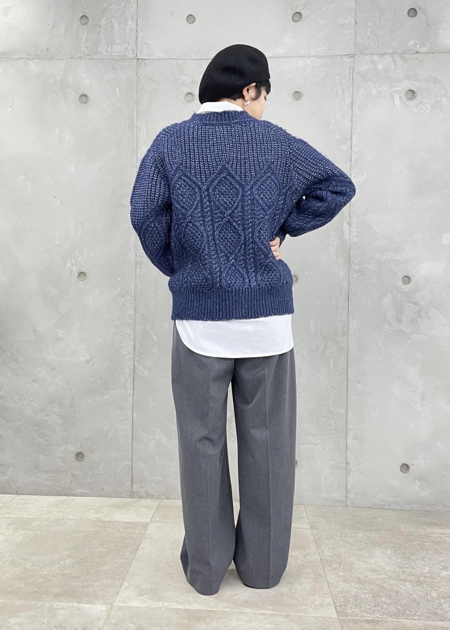 ふんわり軽やかな質感が魅力のケーブル編みニットに、シャツをレイヤードしてカジュアルに合わせました。