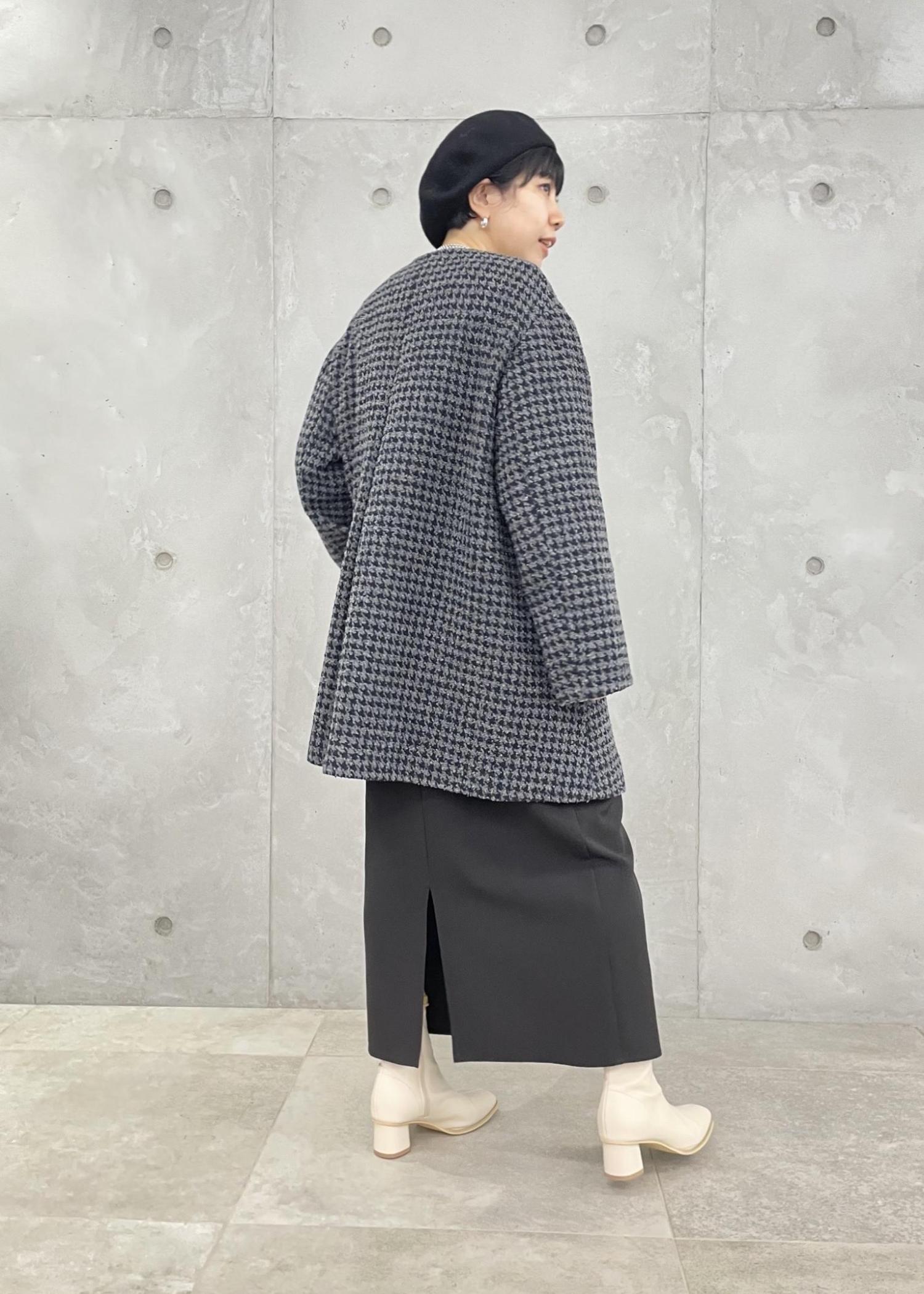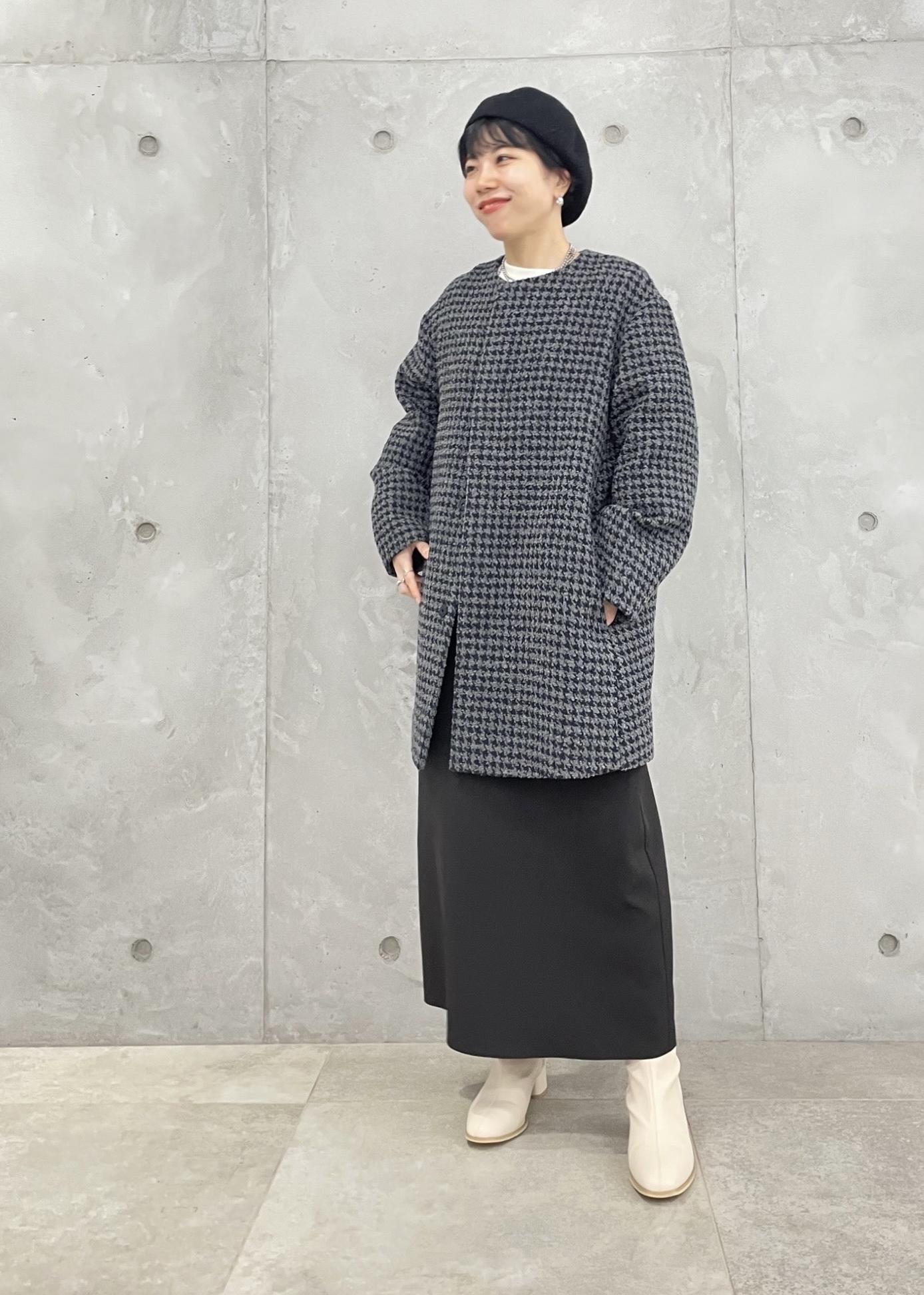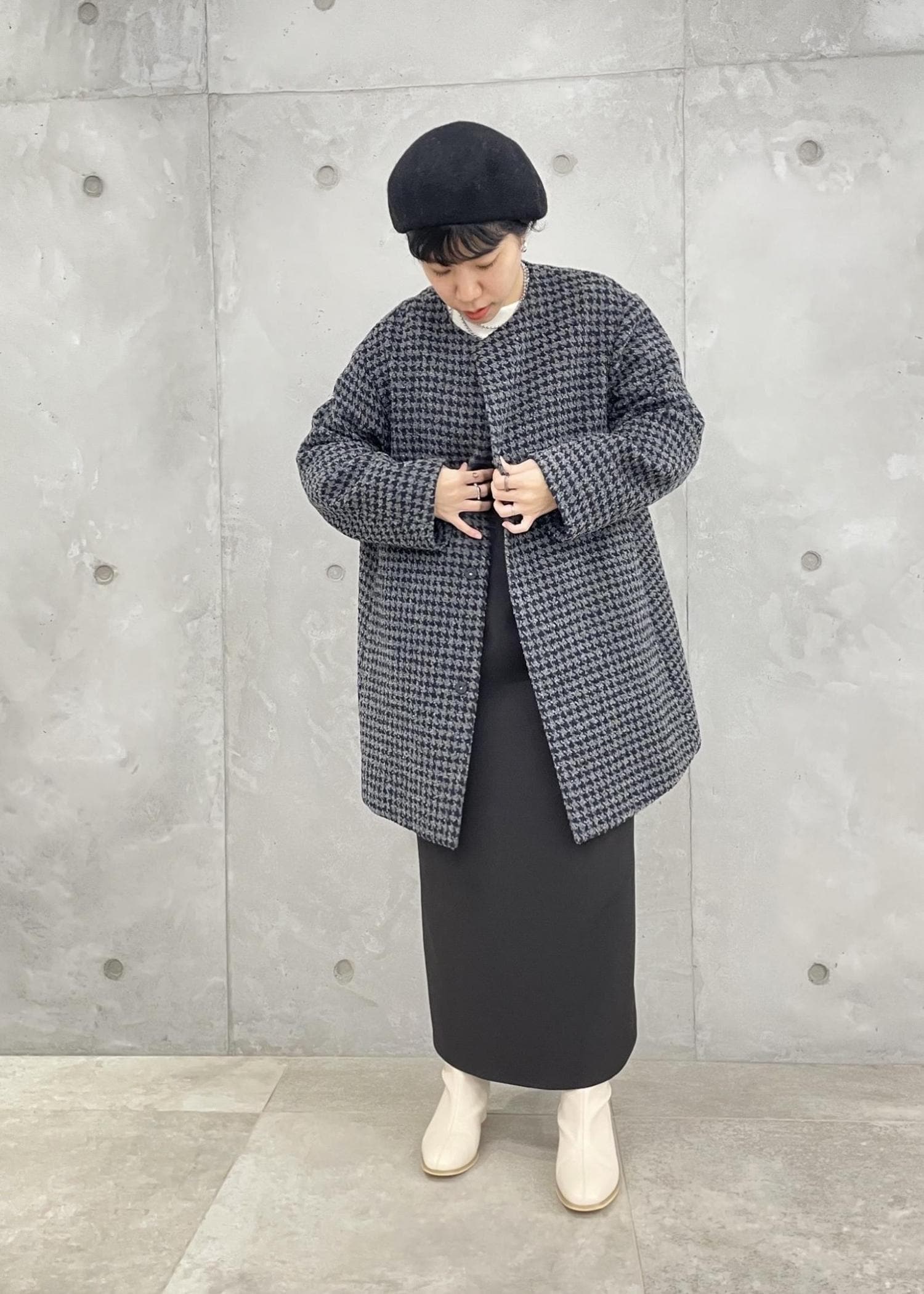 チェックコートに、タイトなキャミワンピースを合わせた大人コーデ。 ベレー帽を合わせてクラシカルな印象に。