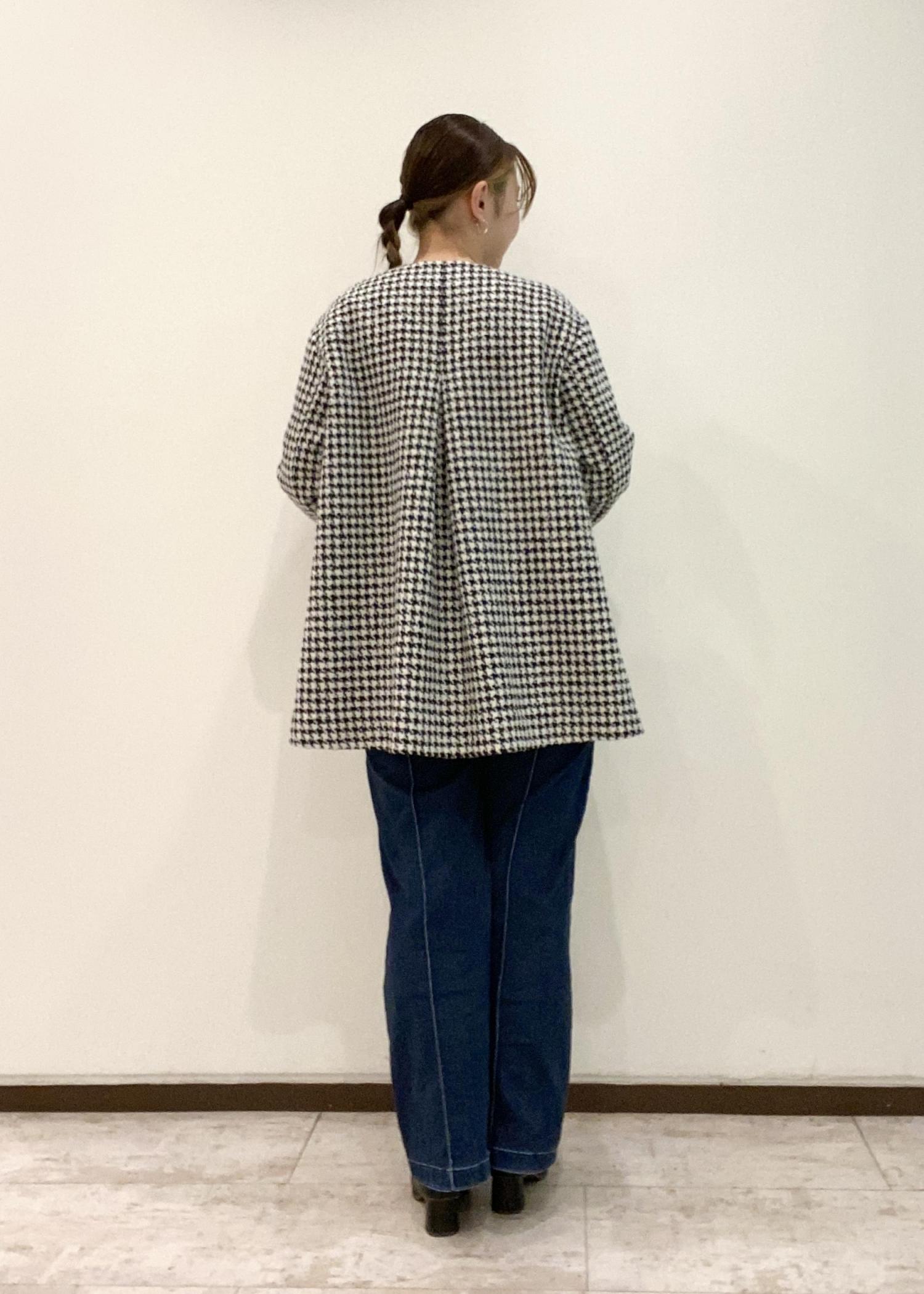 Aラインのコートを使ったコーディネートです。ブルーのトップスを中に入れ、鮮やかさをプラスしました。