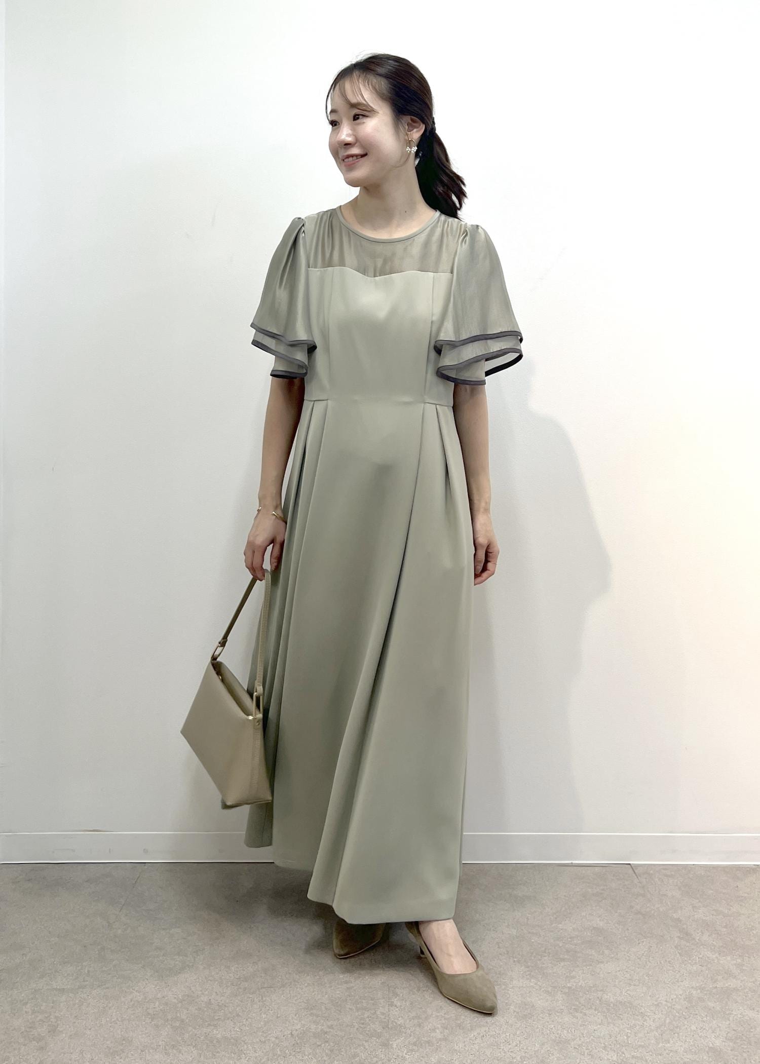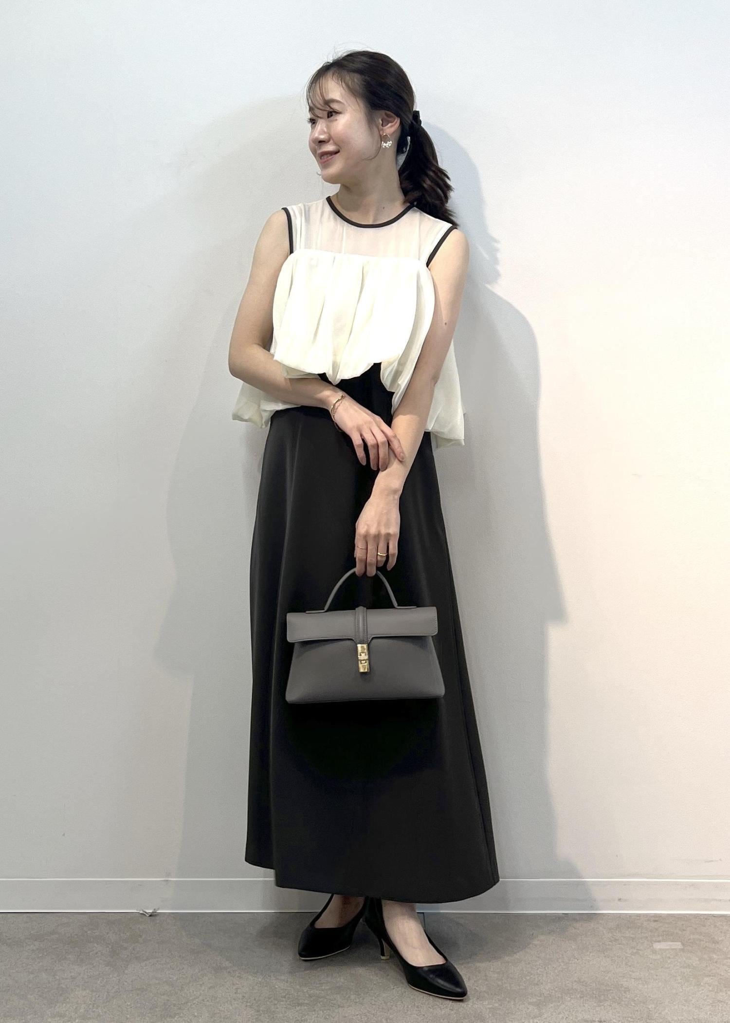 アウターが甘めなので、インナーはブラックのブラウスで、シックにまとめたのがポイントです。
