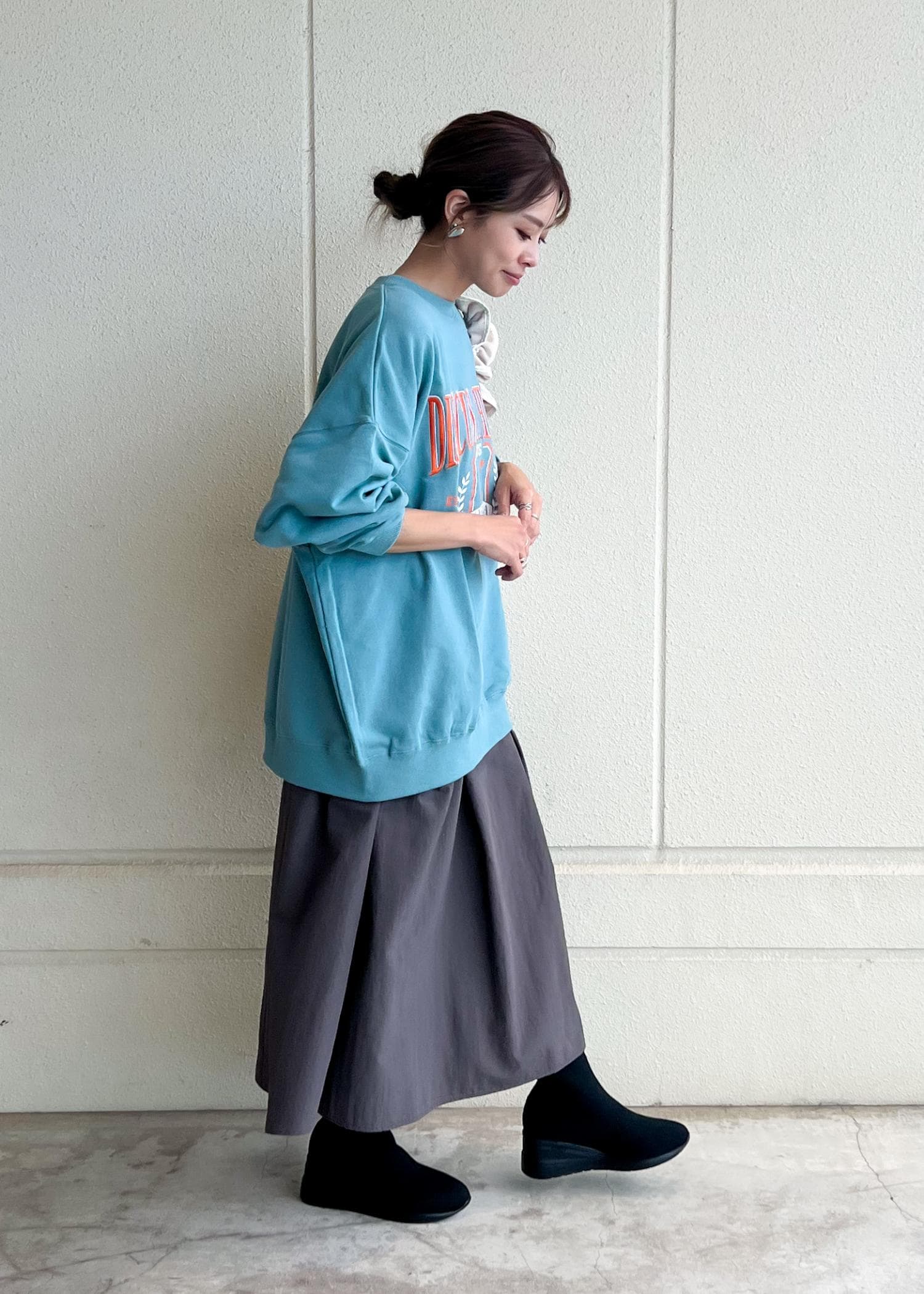ウエスト切替のワンピースに、スウェットを重ね着してスカート風に合わせたカジュアルコーデです。