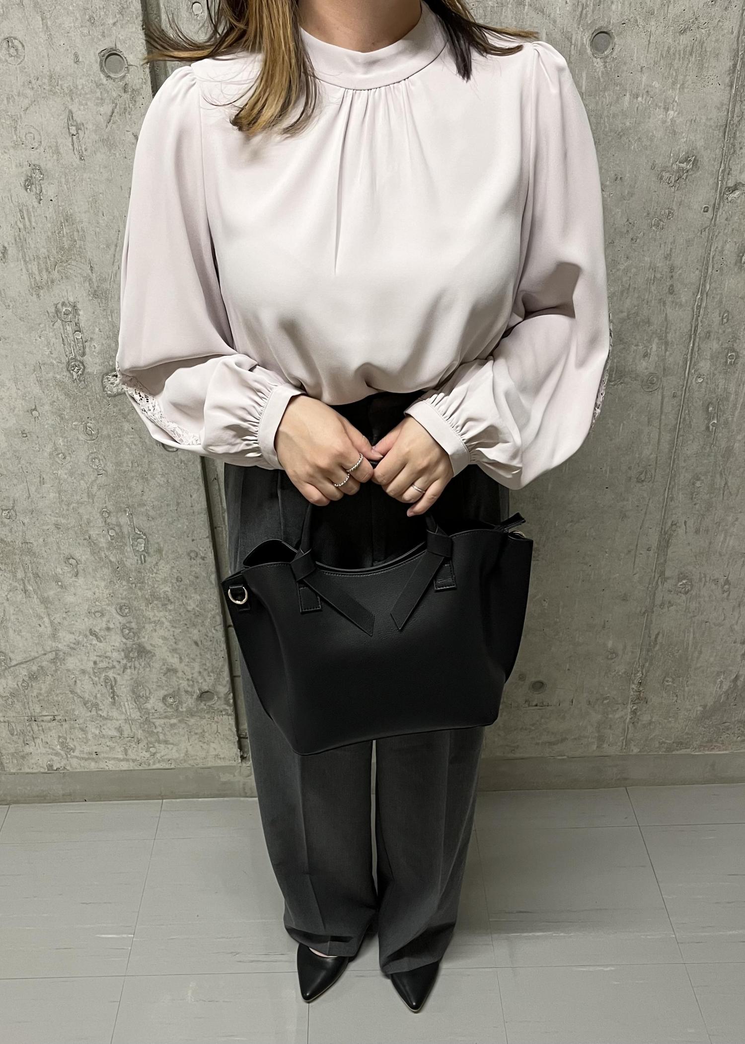 低身長さんにピッタリな長すぎないジャケットにワイドパンツを合わせたオフィスカジュアルコーデです。ラベンダーカラーのブラウスがポイントです。
