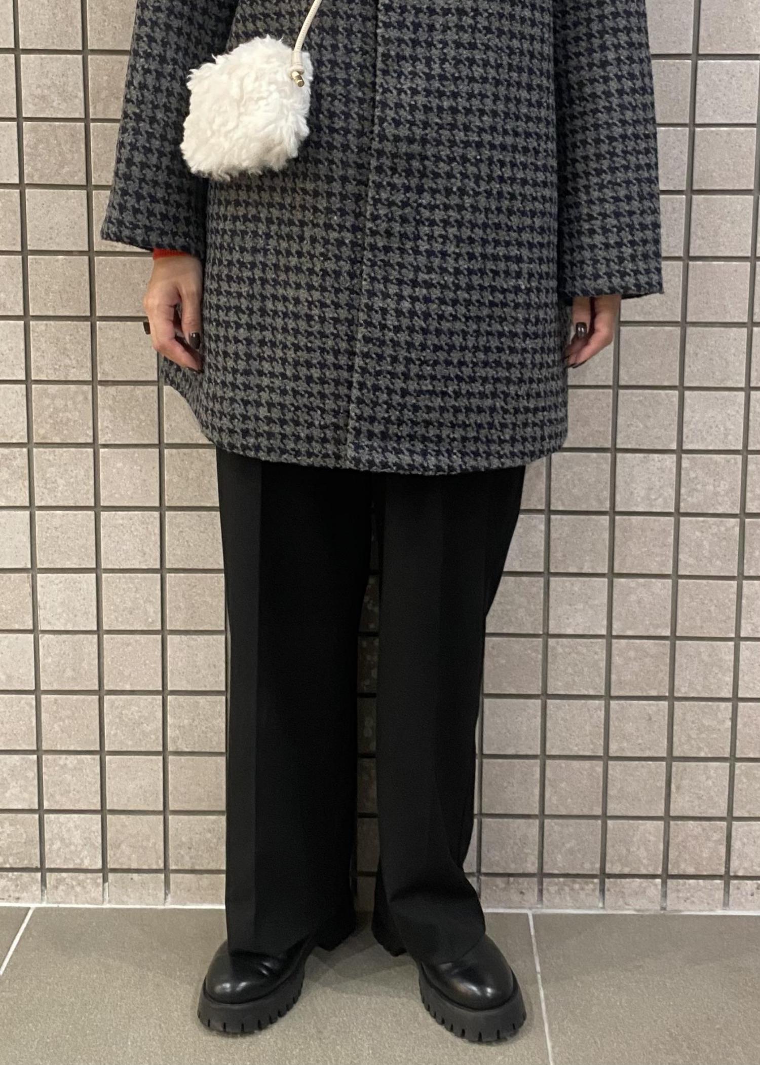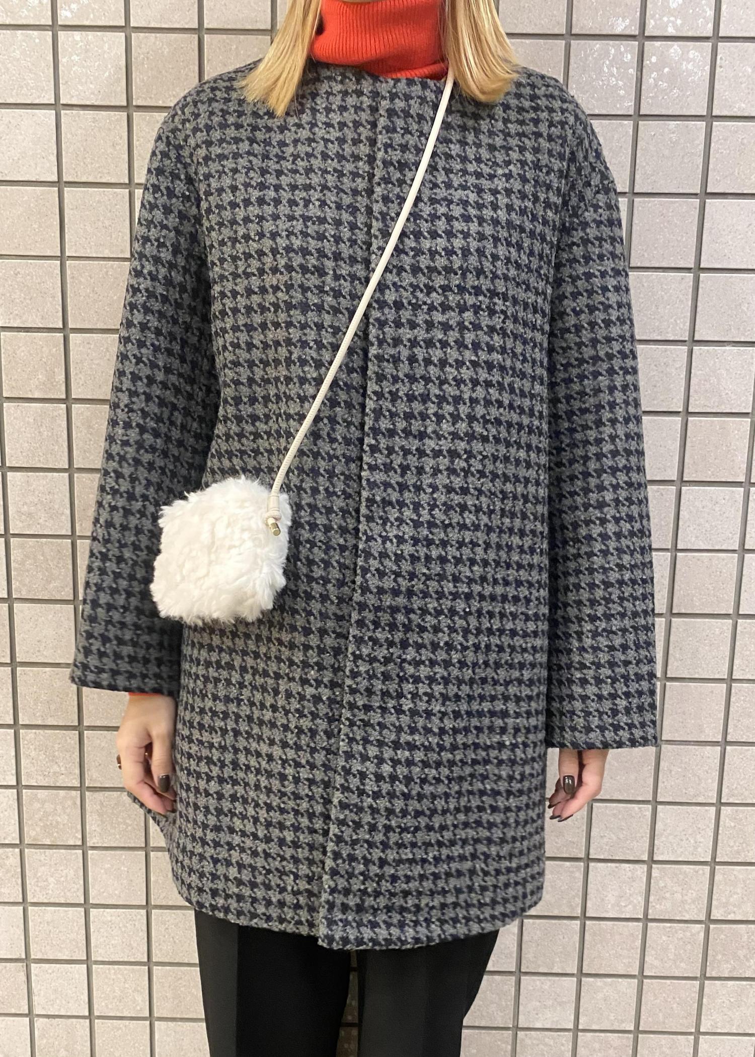新作のアウターを着てみました。 ゆったり目のサイズ感で中にニットを着ても余裕があります◎ オレンジのニットと、白いバッグをワンポイントにコーディネートしてみました。