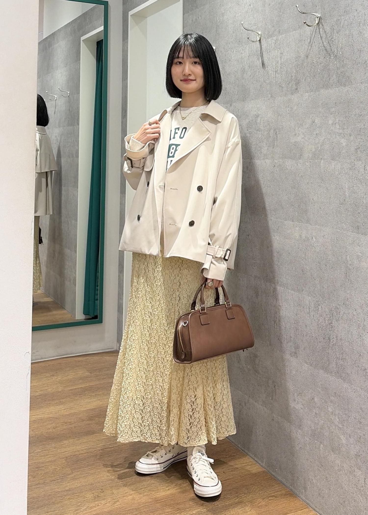 ブラウスやカーディガンはきれいめなアイテムを合わせて、オフィスカジュアルでもご利用頂けるスタイリングにしました◎