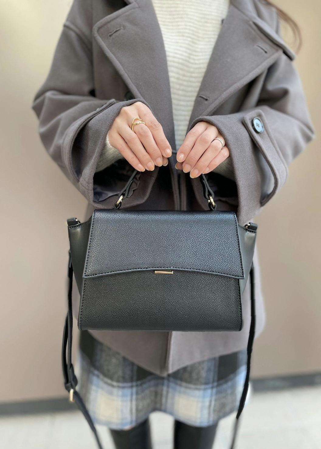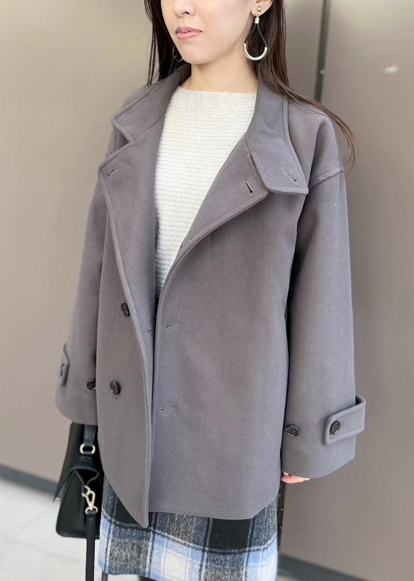 可愛くなりすぎないよう、甘さを控えたチャコールのコートに、小物使いは黒でまとめました!