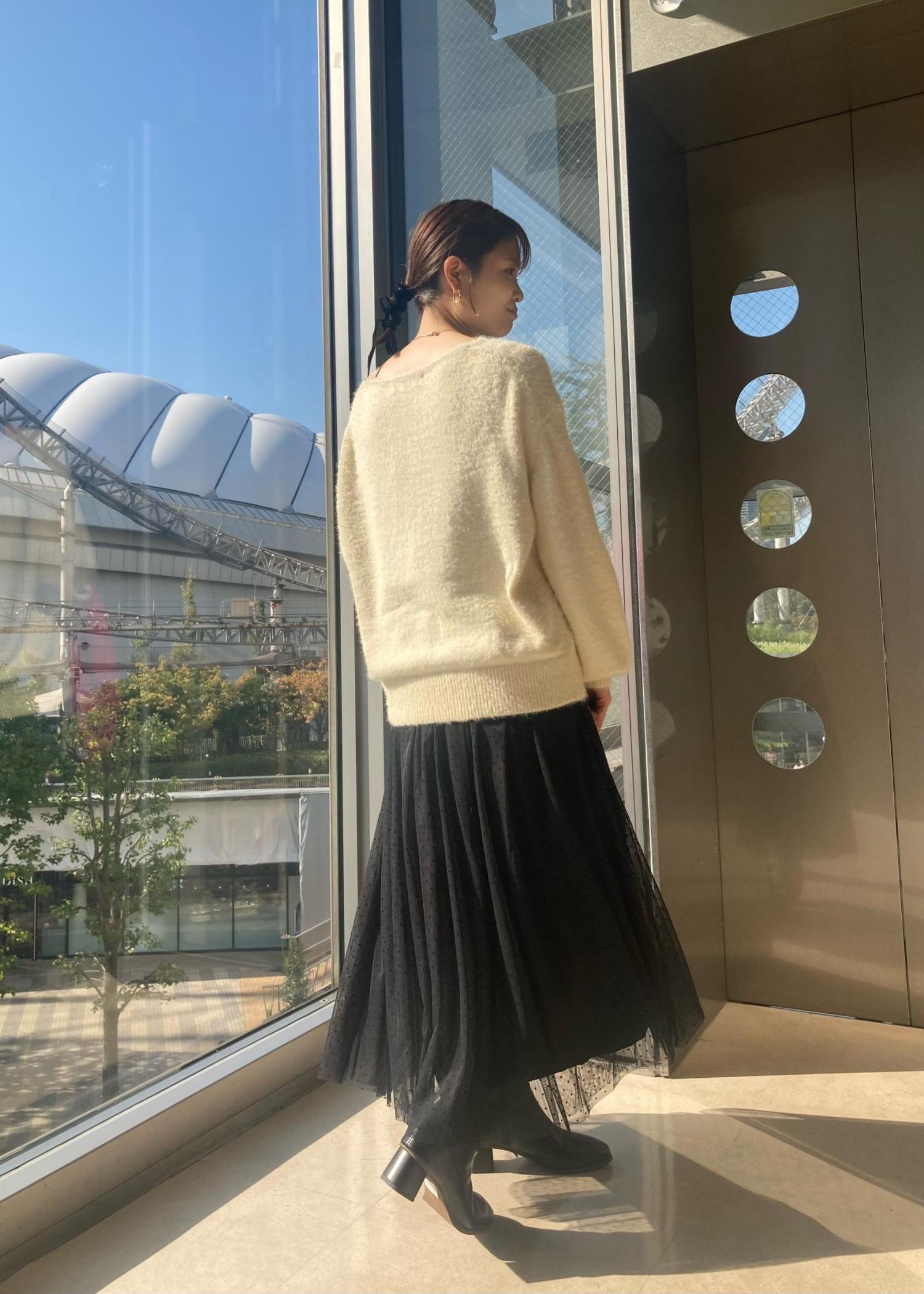 フェザーとチュールの甘め素材をモノトーンですっきり合わせました! フェザーニットは華やかでイベントの多い冬にぴったりのニットです◎