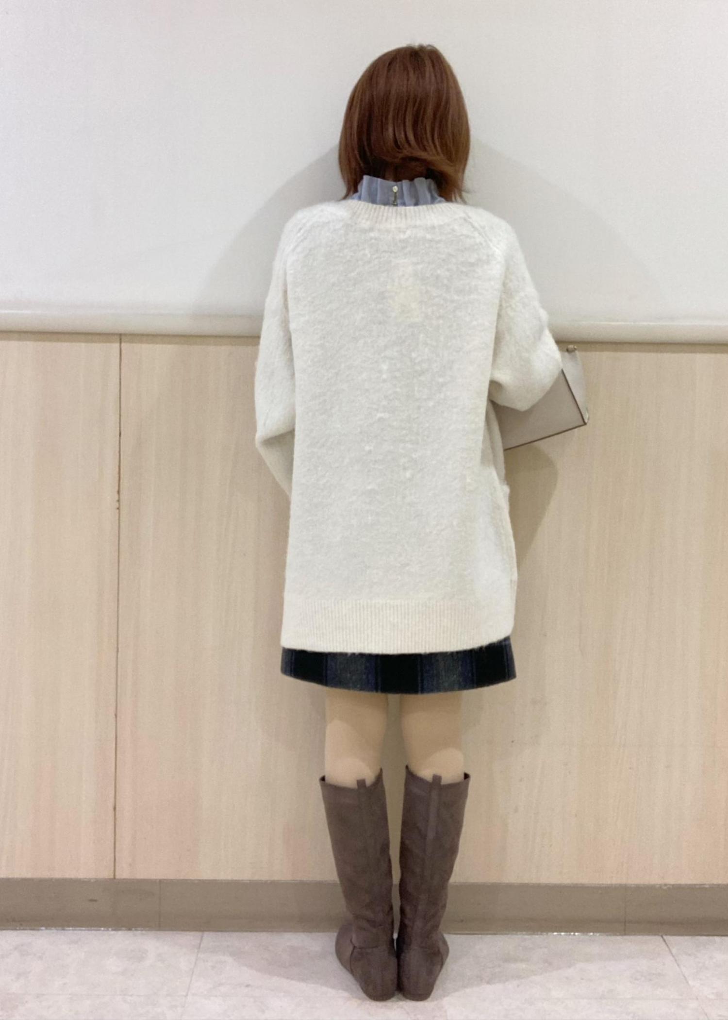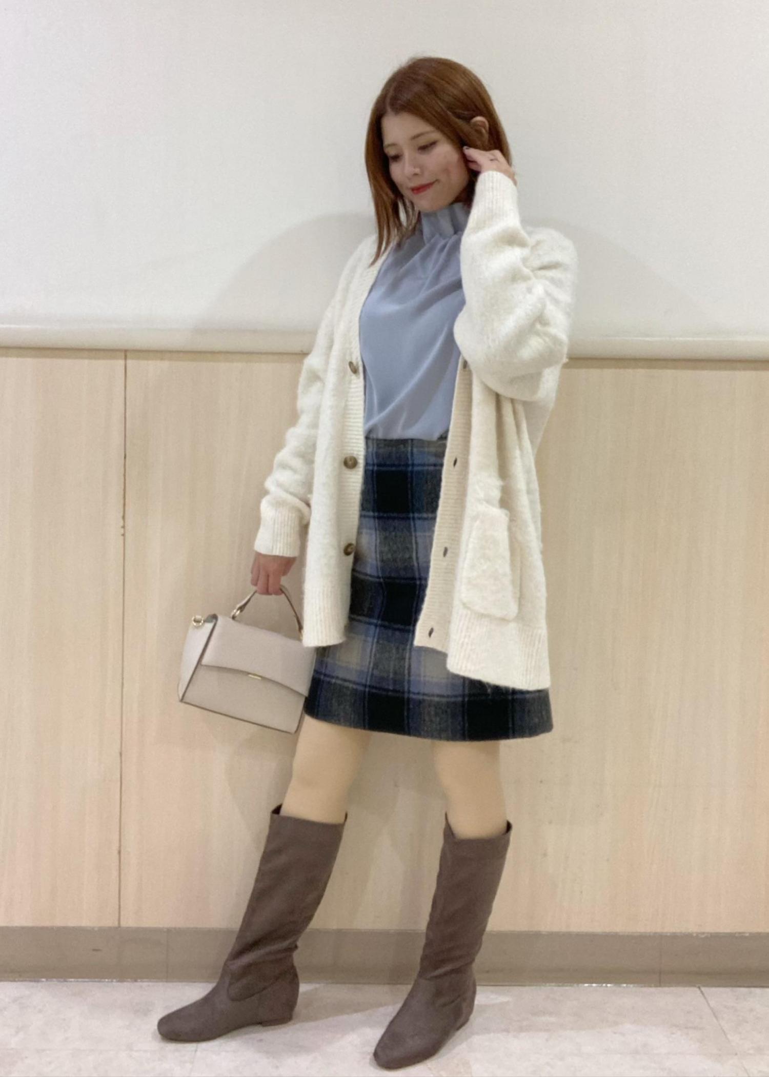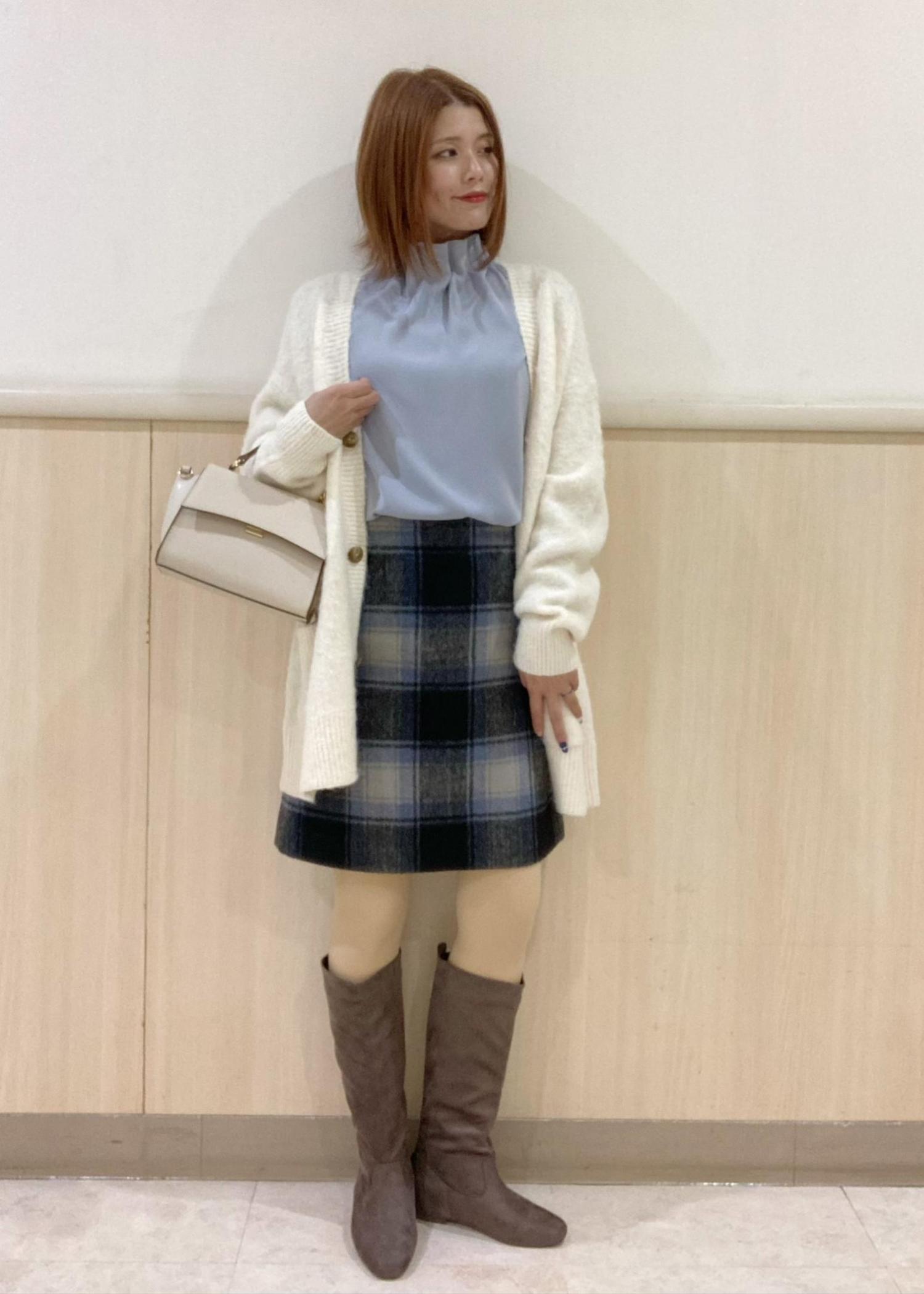 首元のフリルが特徴のブラウスにチェックのミニスカートを合わせた甘め綺麗めコーデです!ロングブーツを合わせて季節感もプラスしました。