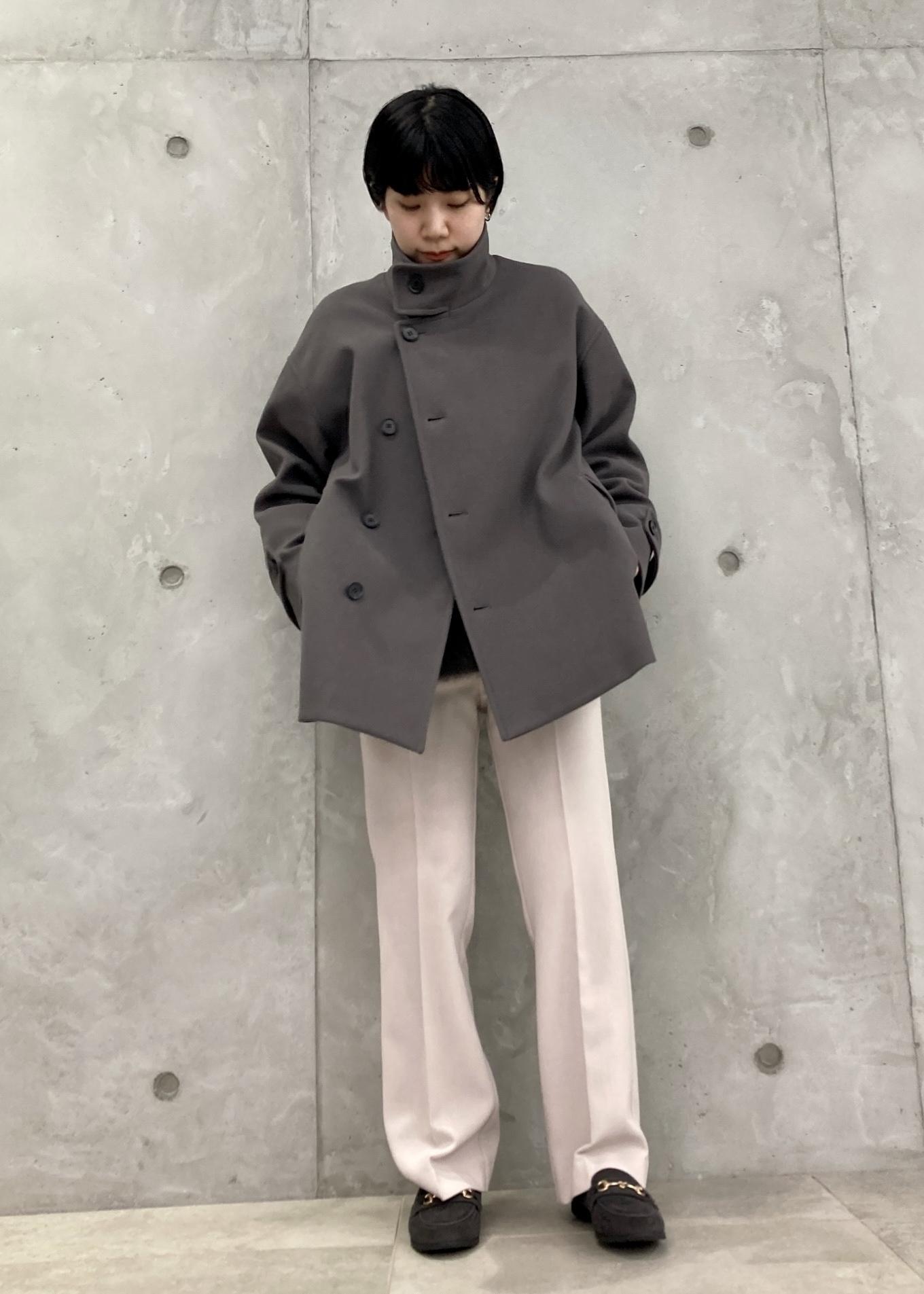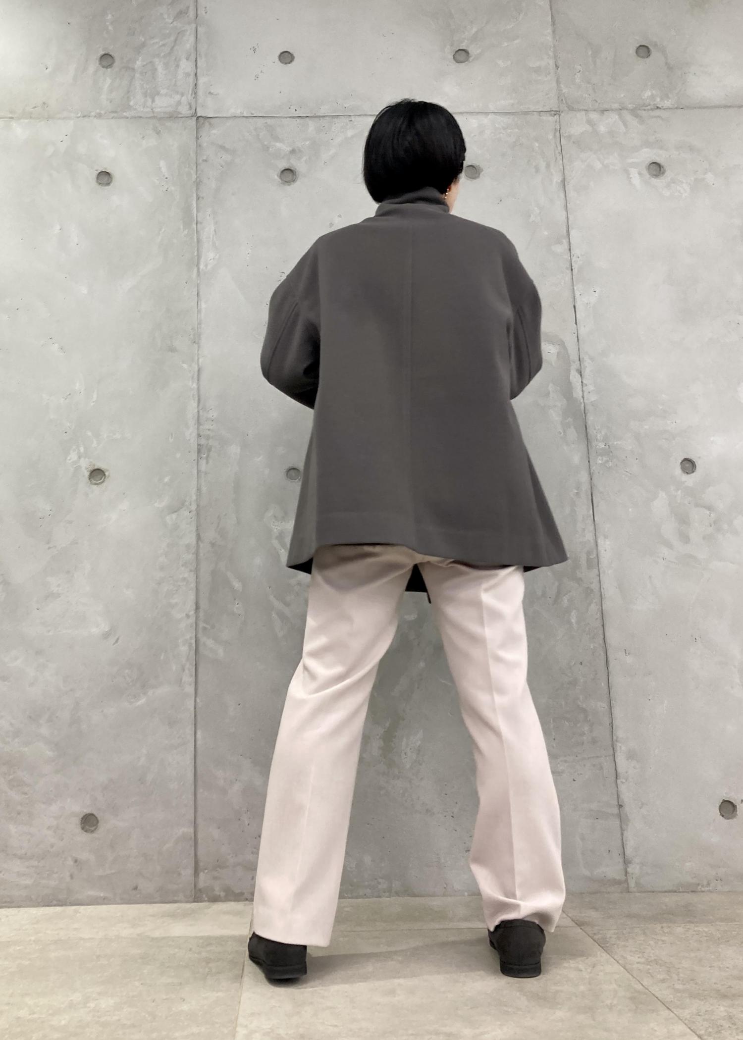 ボタンの留め方次第でスタンドカラーにもなるアウターを主役に、同系色でベージュのパンツを合わせました。