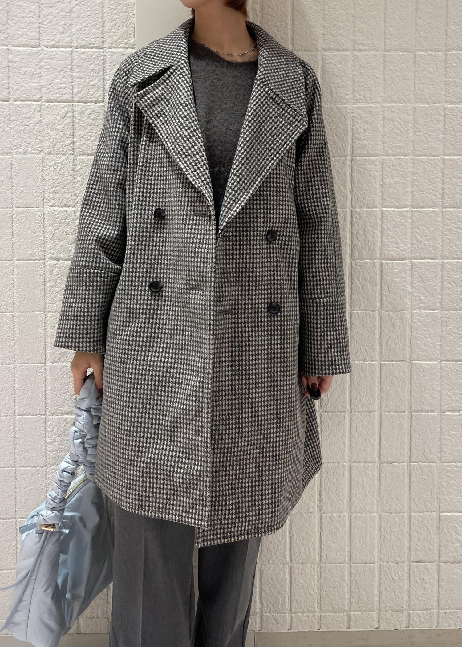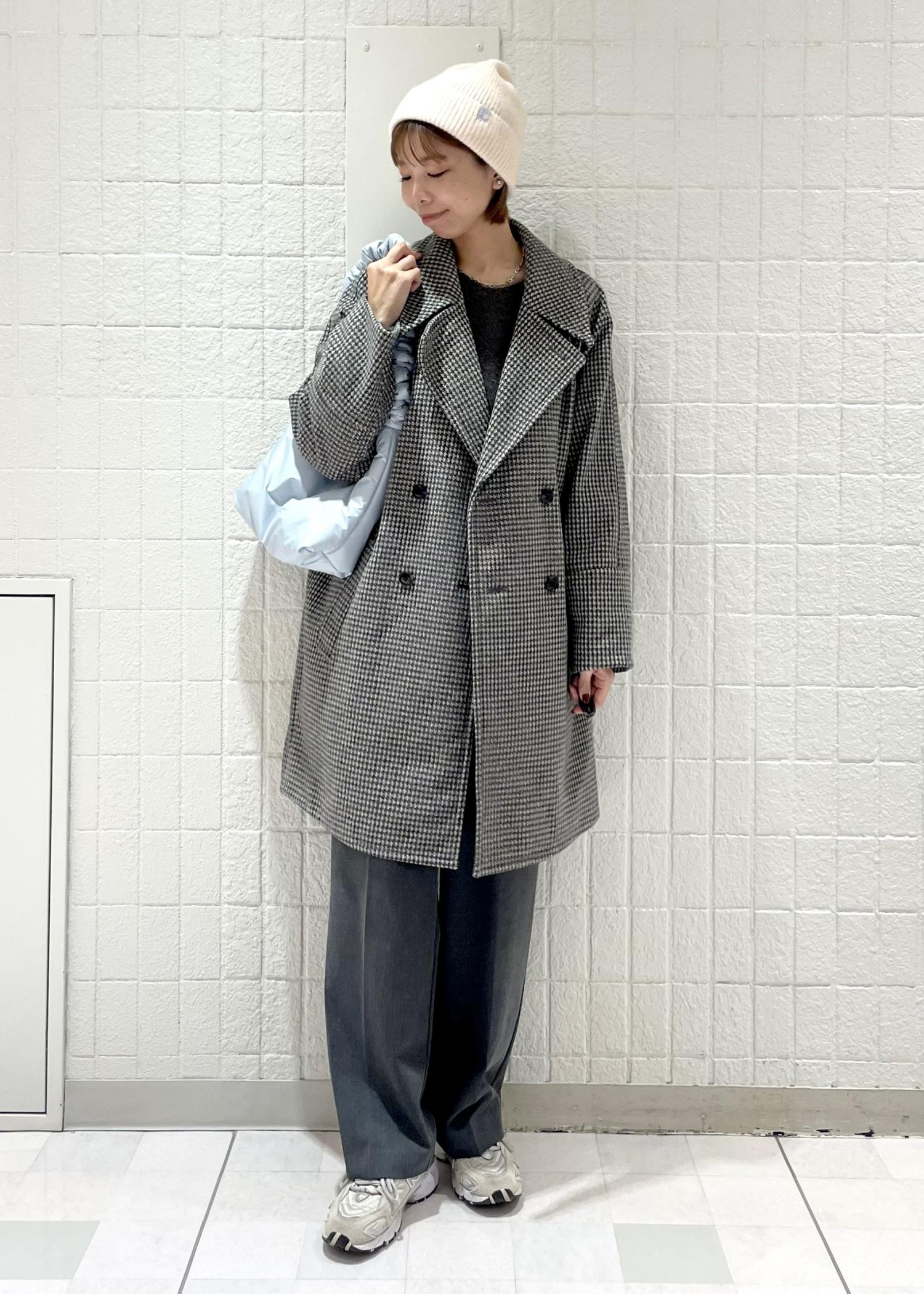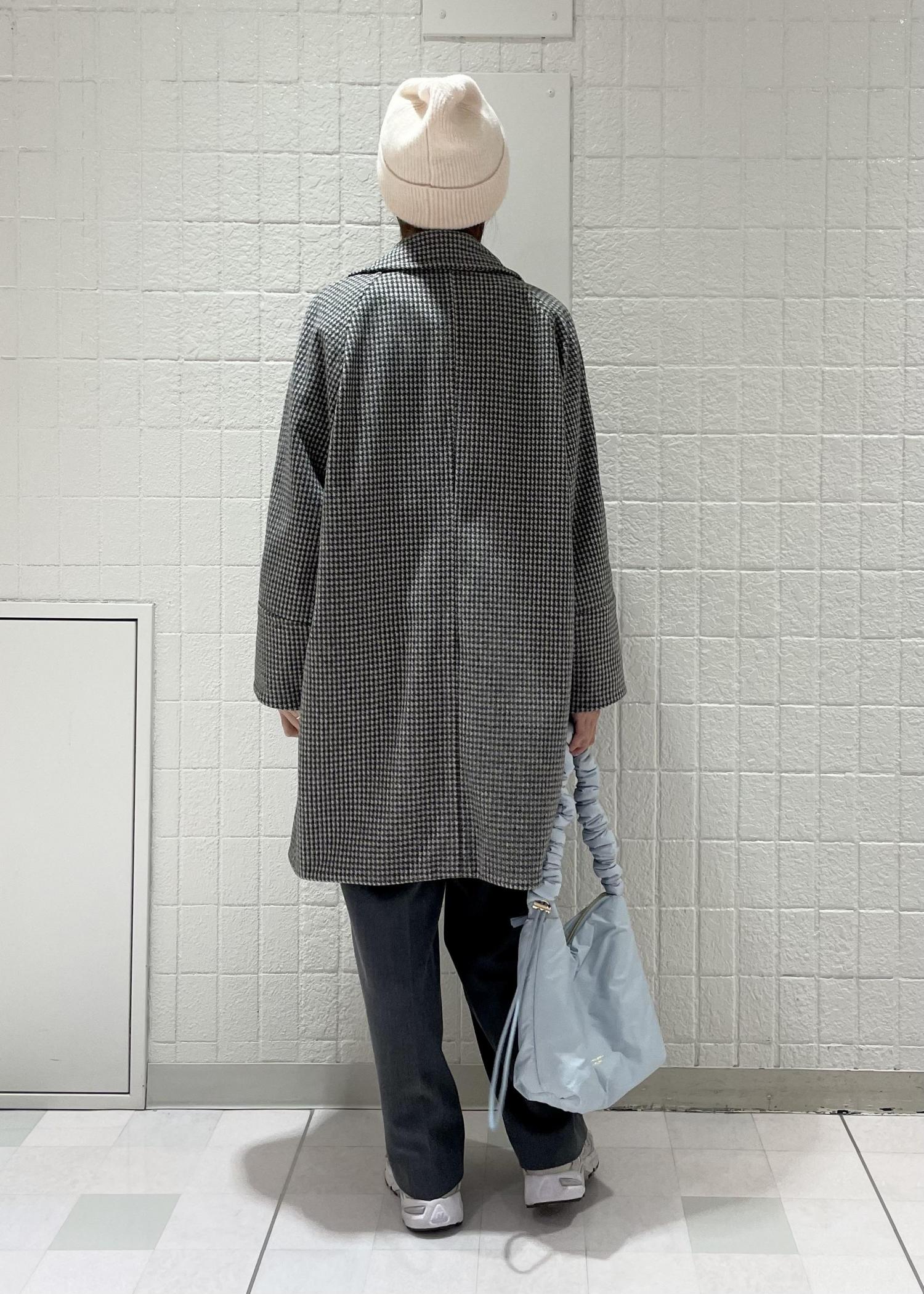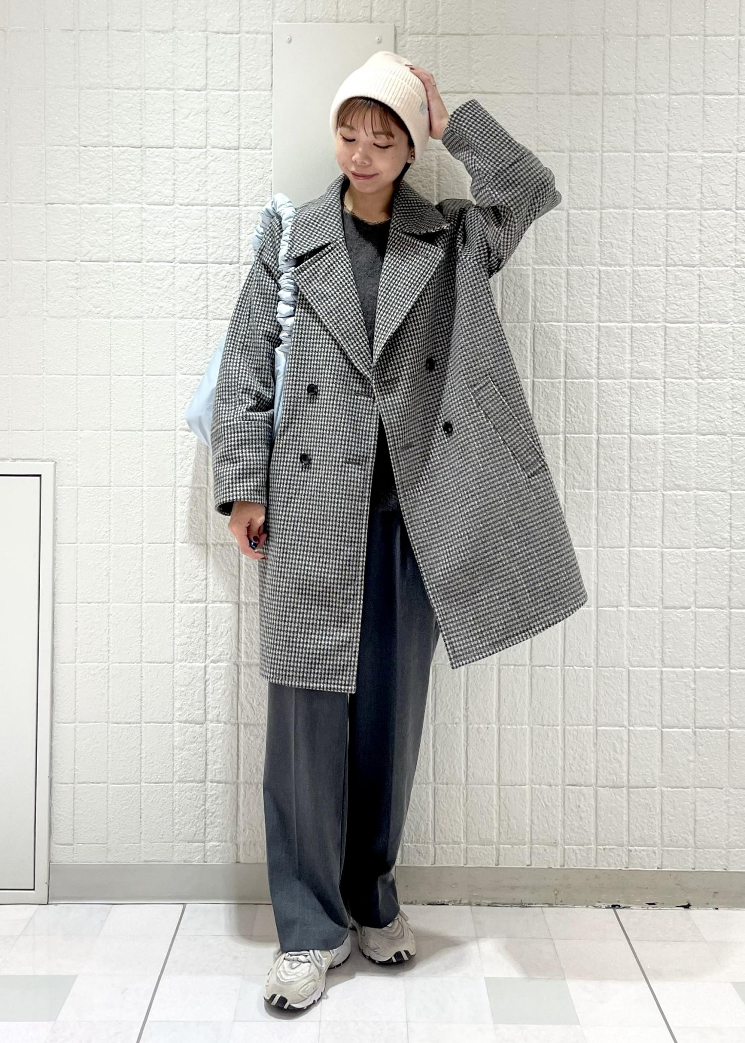 グレー系のワントーンコーデで今年らしくまとめてみました。全体的にぼやっとしないよう、チェック柄コートや小物でメリハリをつけたのがポイントです。