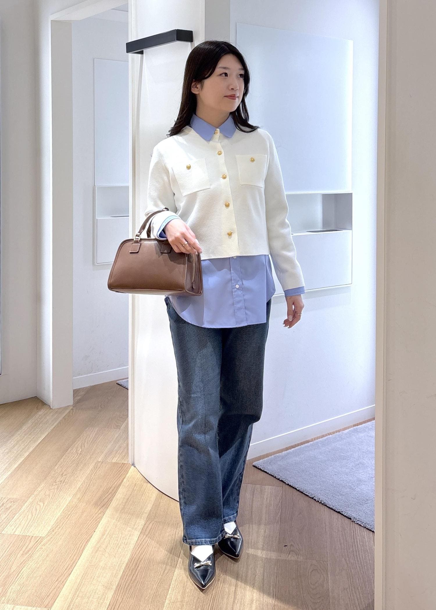 リボンブラウスに金ボタンのカーディガンで、上品なコーデにしました。