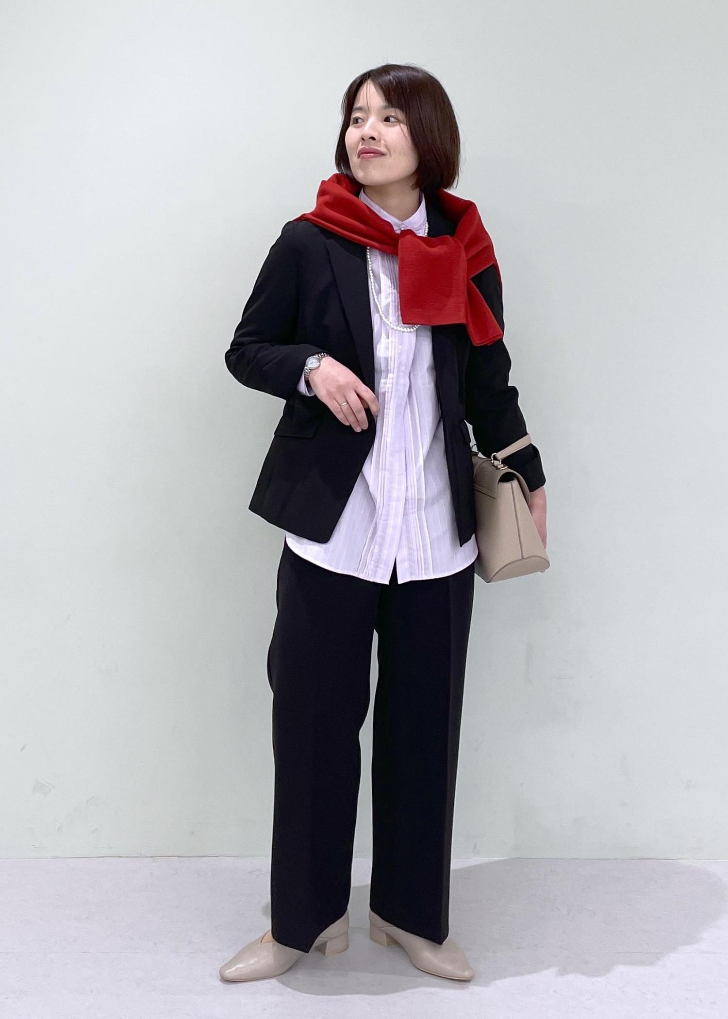 ボトムはチェック柄ワイドパンツを合わせてマニッシュな印象のコーデでまとめました。