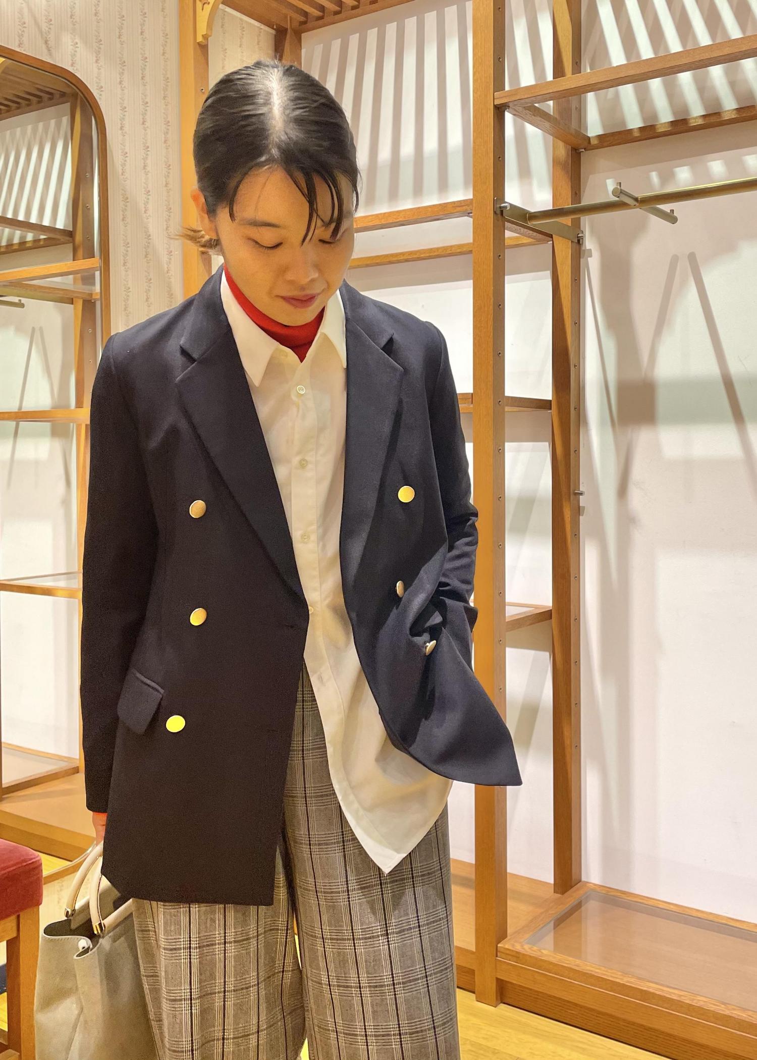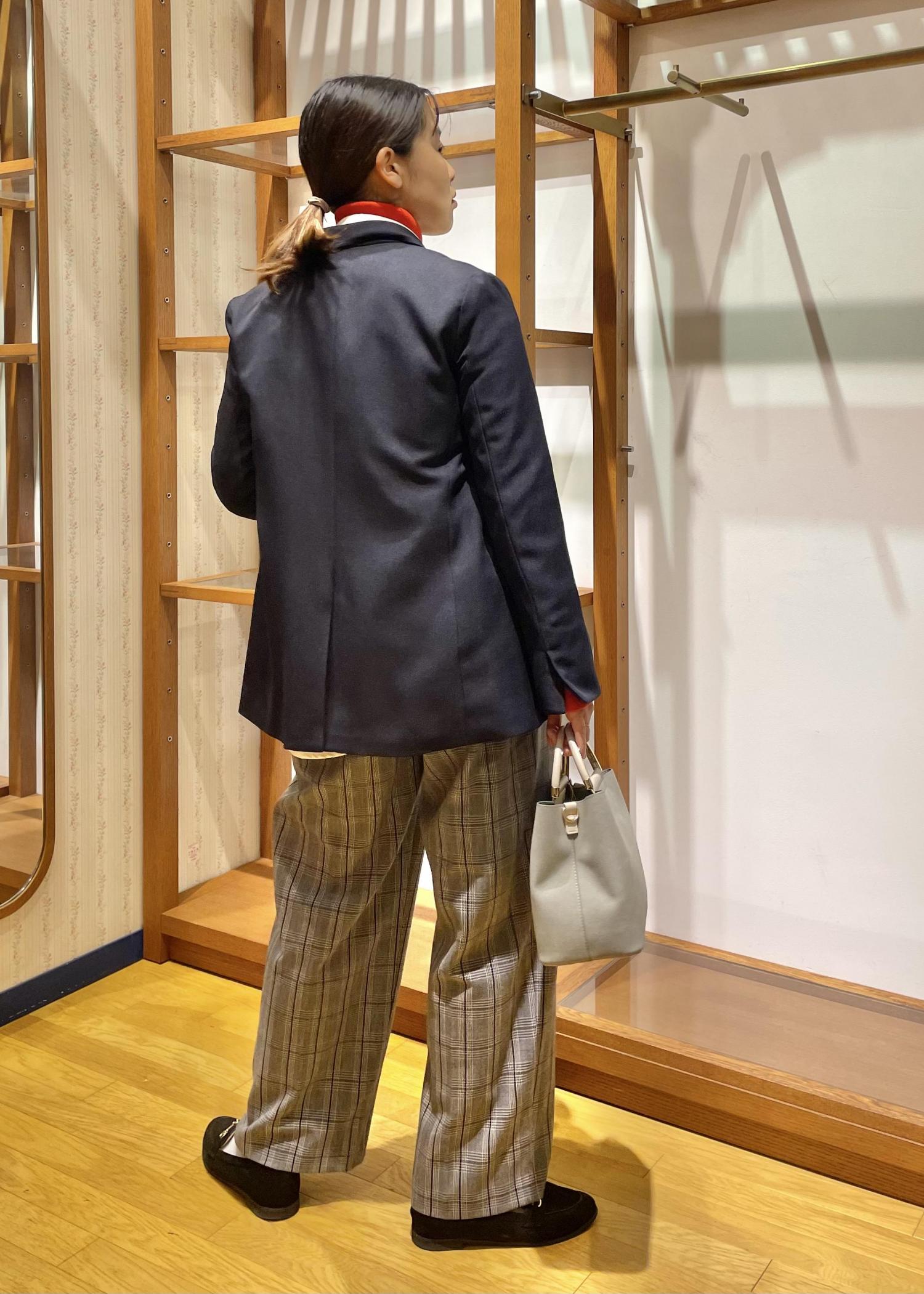 かっちりめのミドル丈ジャケットに、赤のタートルネックとゆるっとシャツを合わせたカジュアルコーデです!