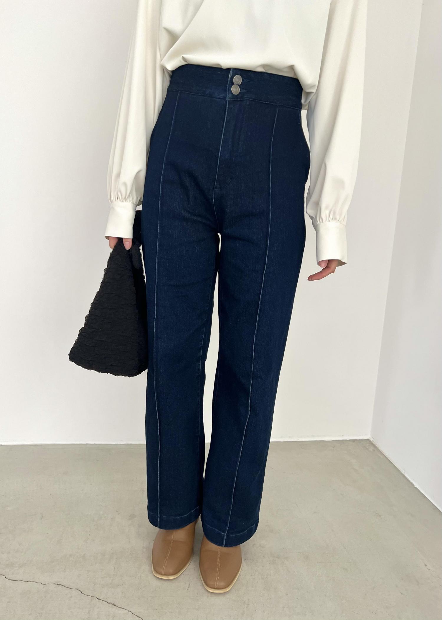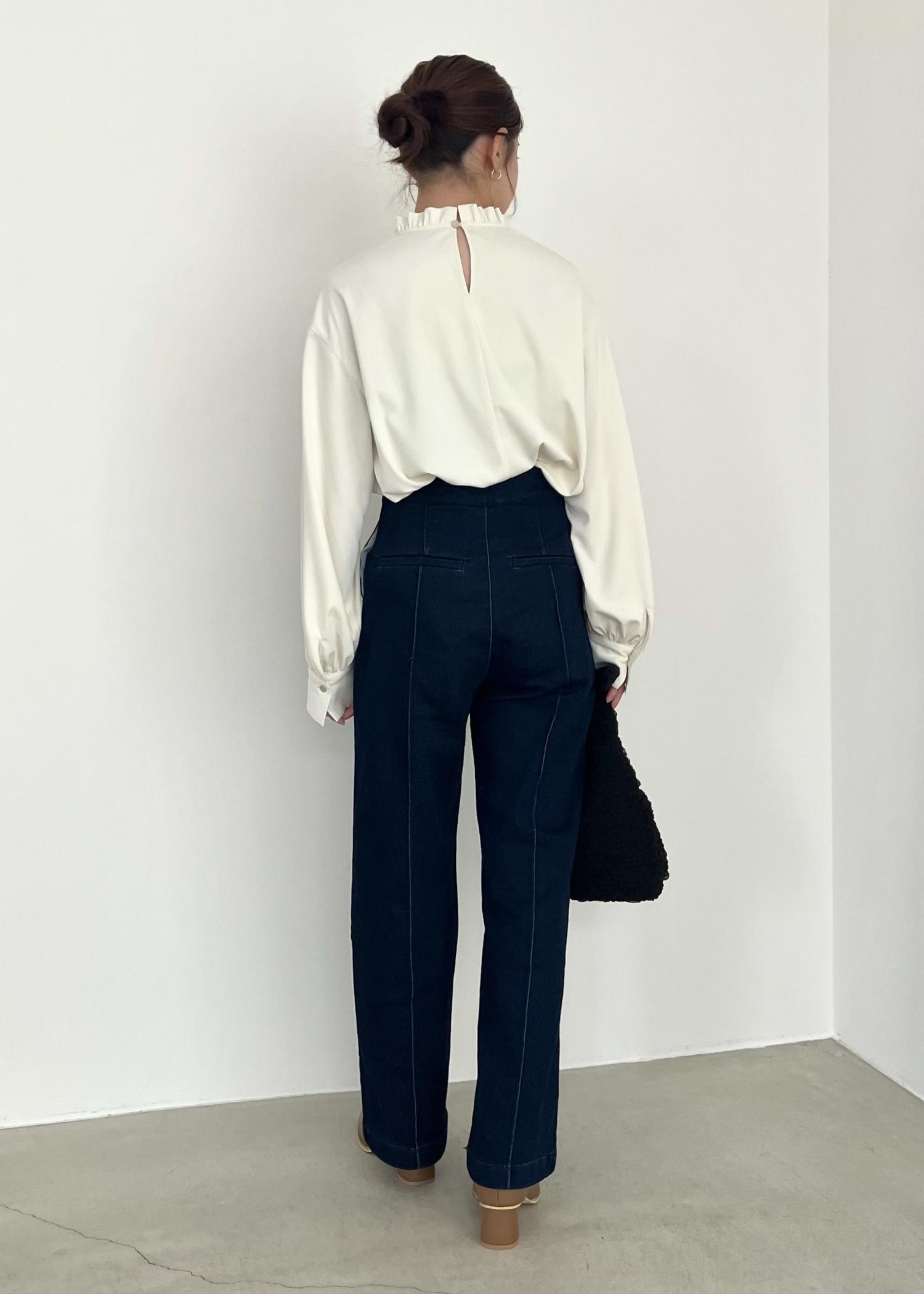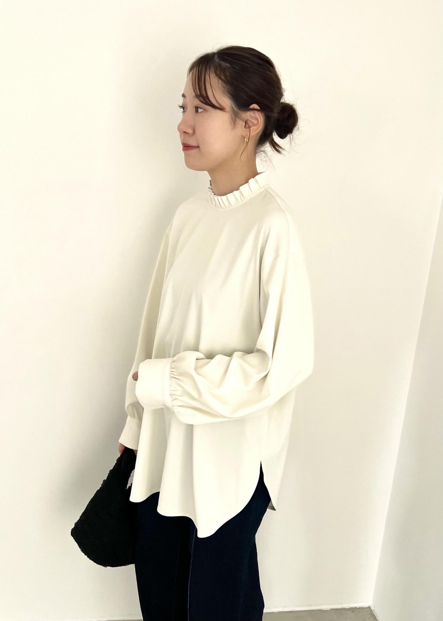 きれいめなブラウスに、デニムを合わせてオフコーデに。 オンオフ着回せる便利な一枚です。