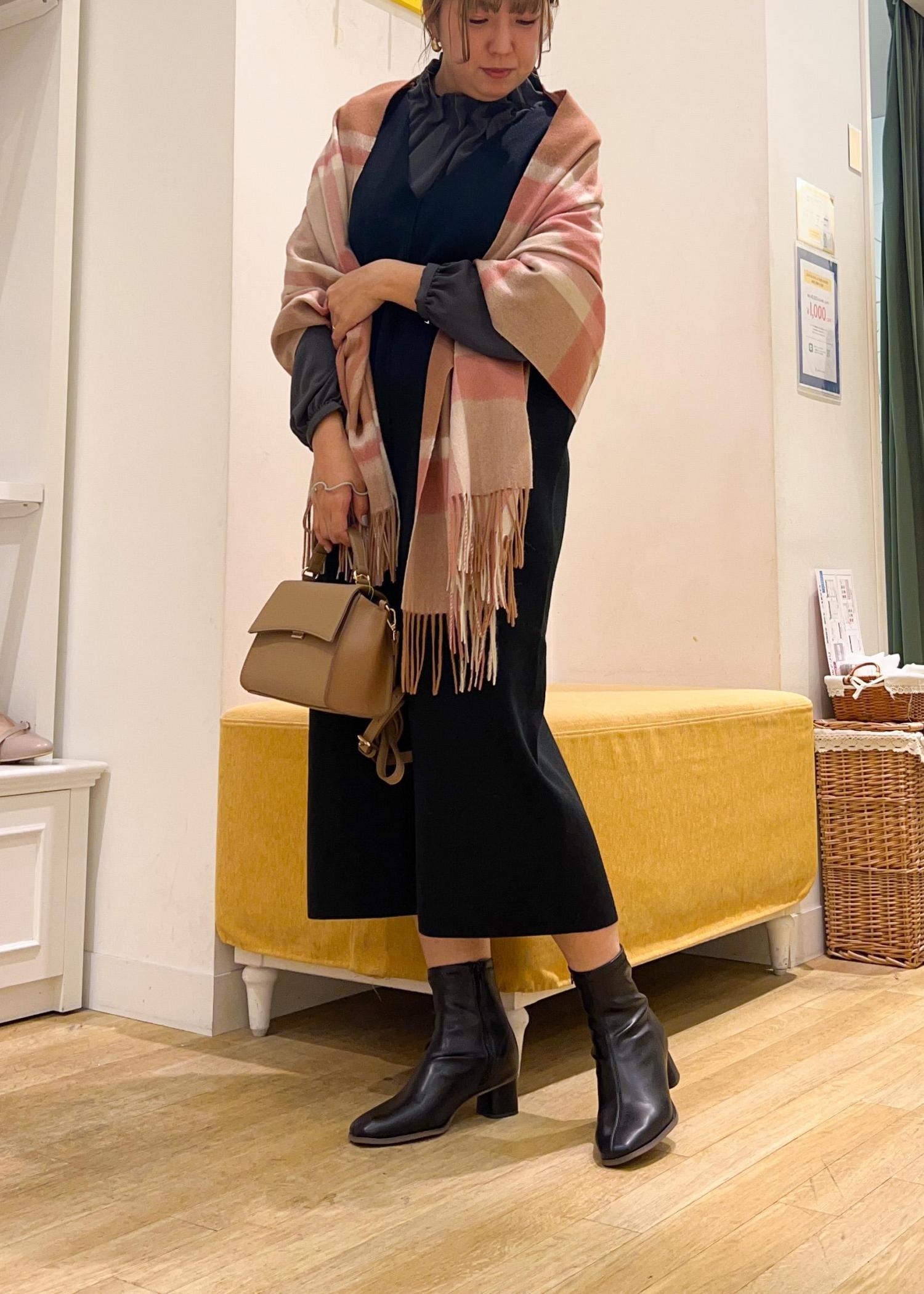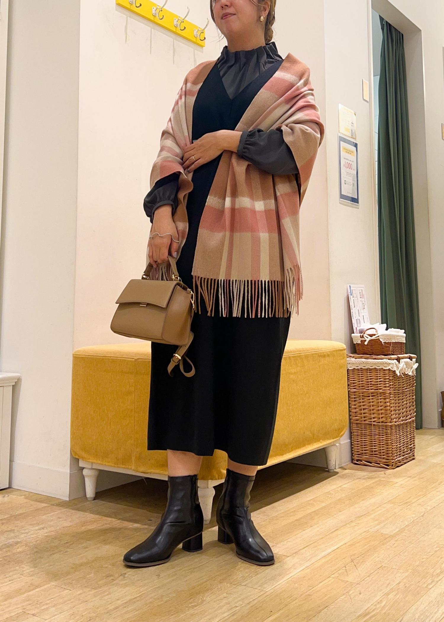 リラックス感のあるニットジャンスカのインナーをブラウスにしてきれいめにコーディネートしました。ストールは明るいカラーでコーディネートのポイントに。