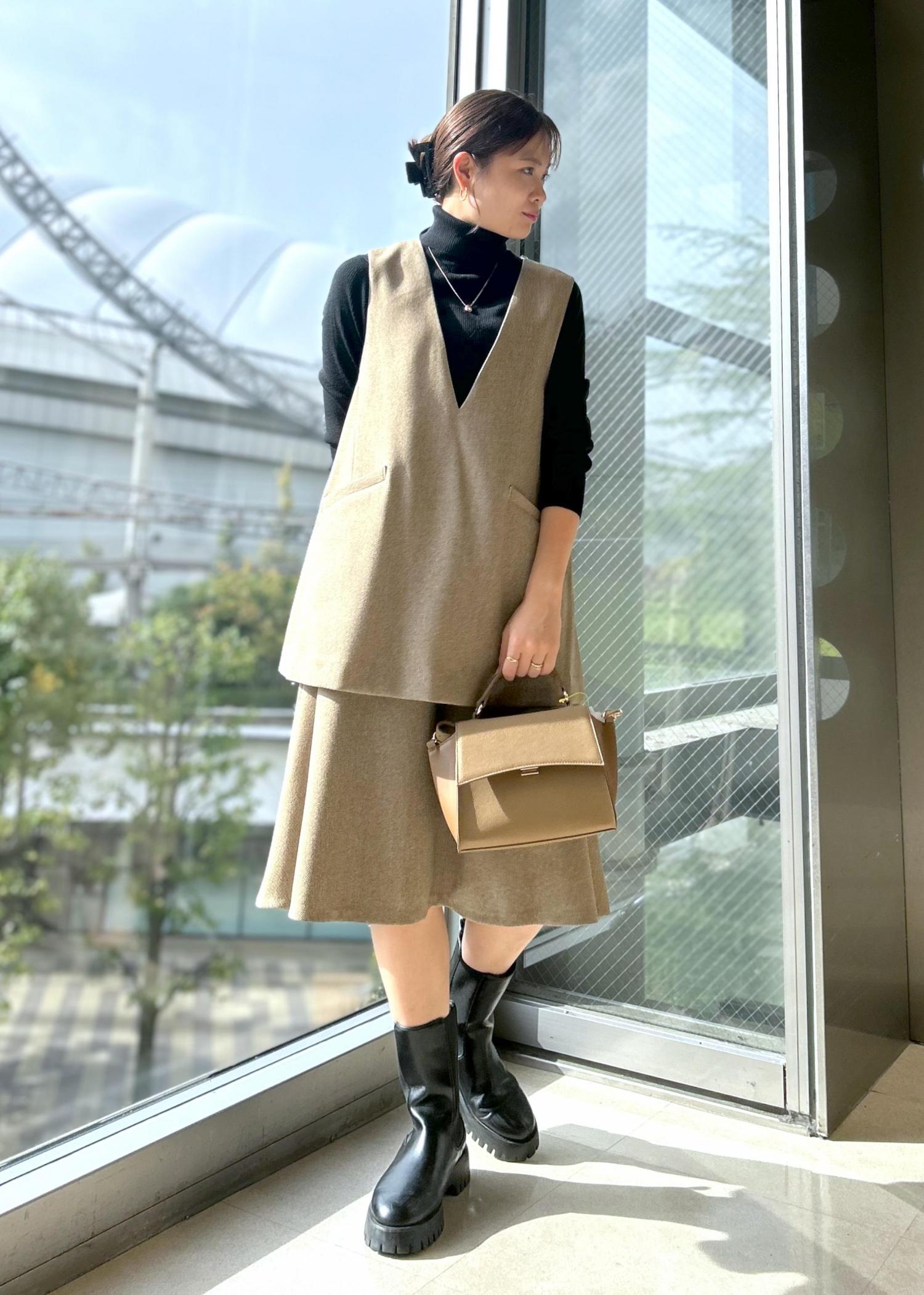 セットアップスタイルでスタイリング楽チン! 着丈の長めのトップスに、少し短めのスカートのバランスが今年らしいです◎ ブーツ合わせがおすすめです!