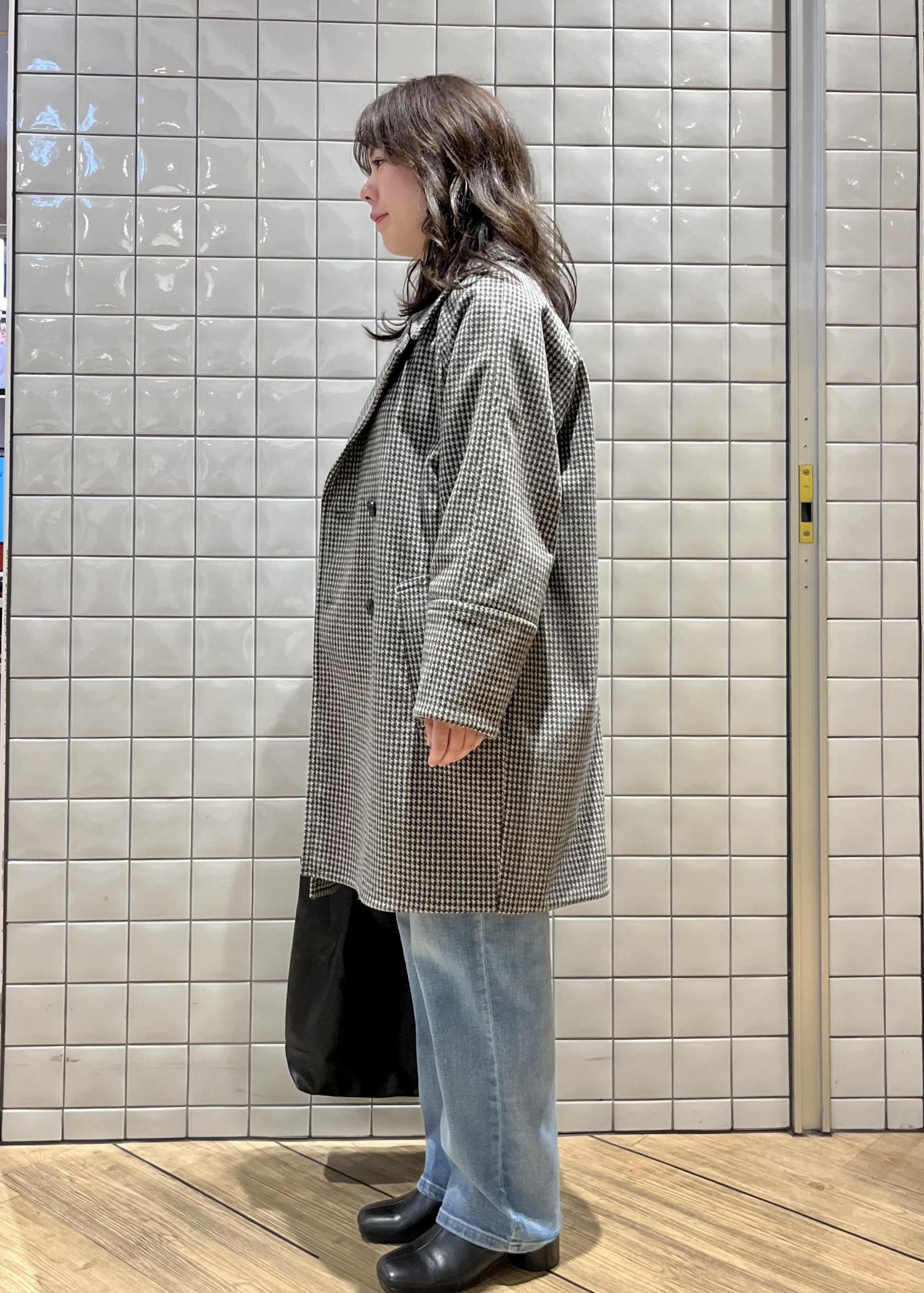 ふんわり柔らかいシャギーニットにチェックアウターを合わせたリラックス感のあるコーディネートです。
