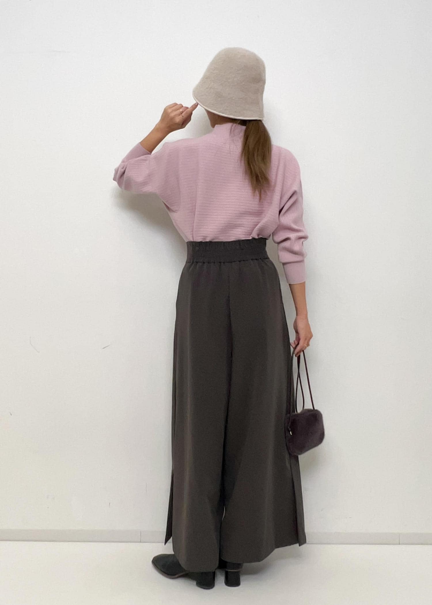 柔らかいピンクニットは、チャコールのボトム合わせで柔らかい印象に。