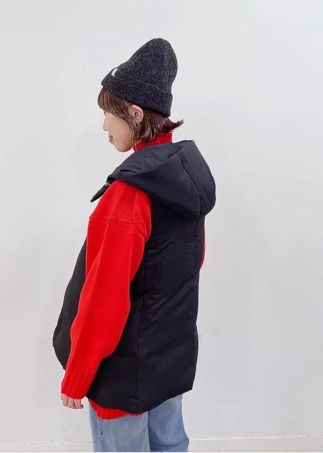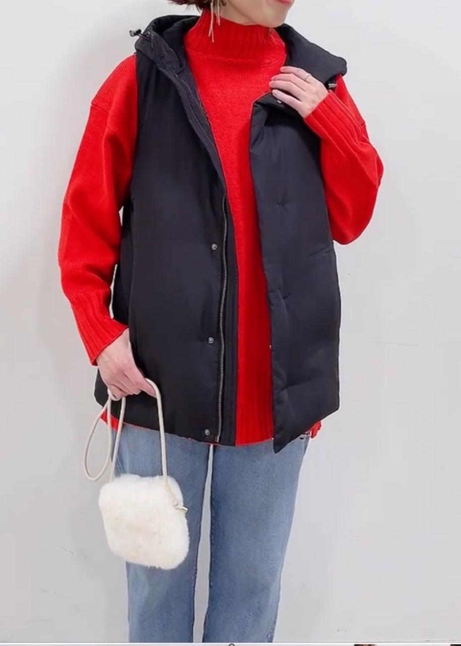 新作のデニムでカジュアルスタイルに! ニットの赤をポイントに、ようやく寒くなってきてのでダウンベストでまとめました。軽くて暖かいダウンベストおすすめです。