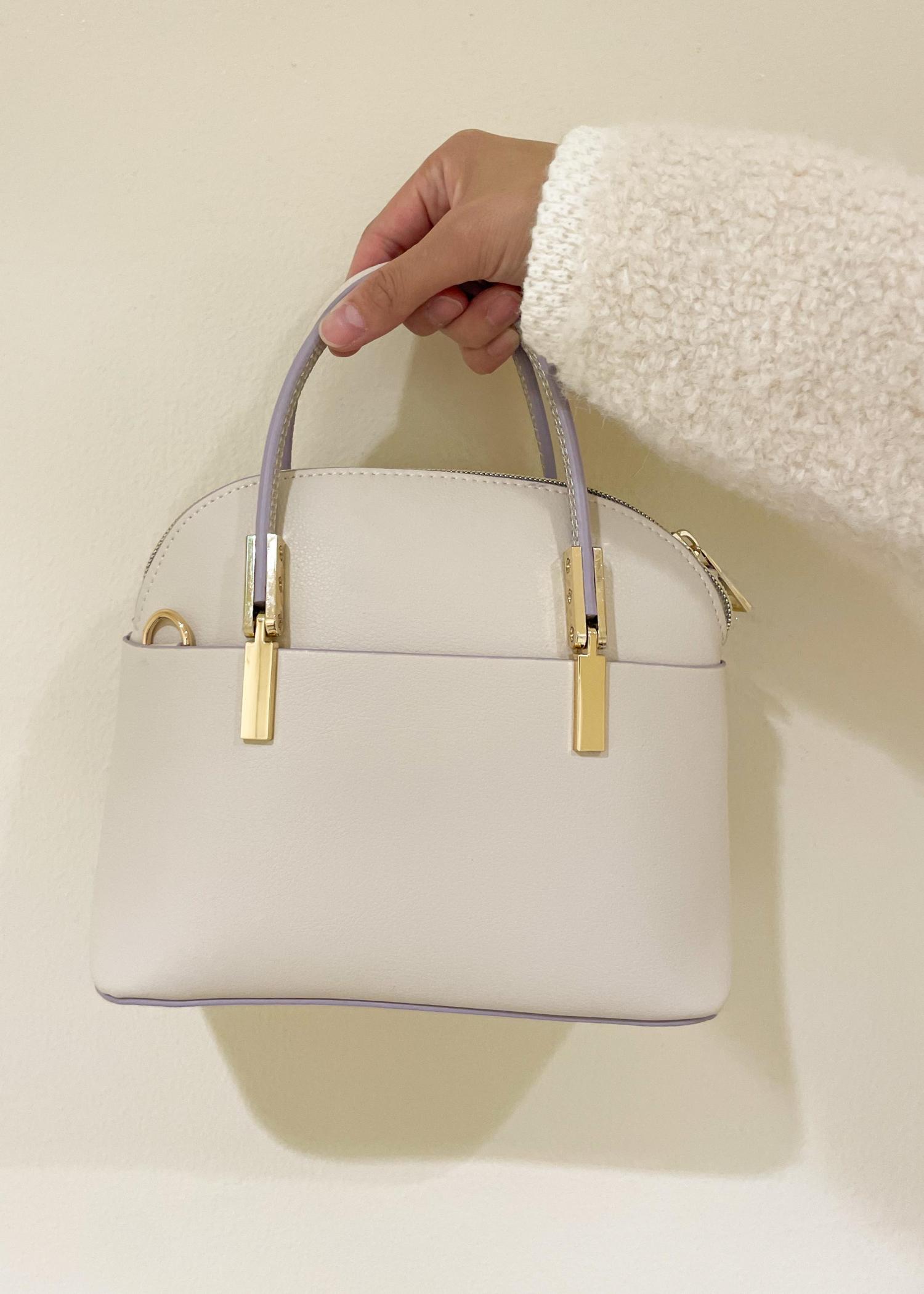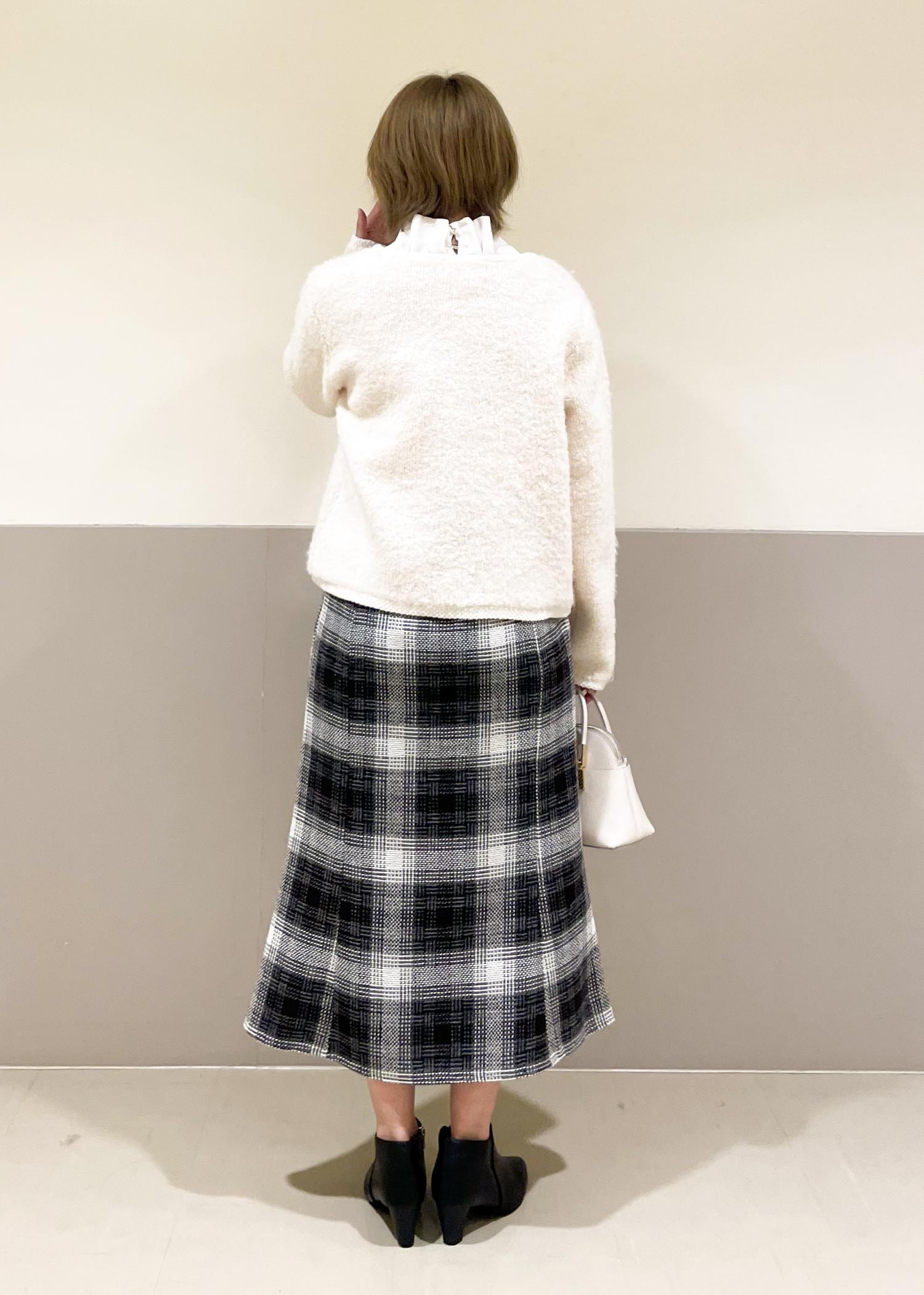 ツイードチェックのスカートをメインに白でまとめた上品コーデです。