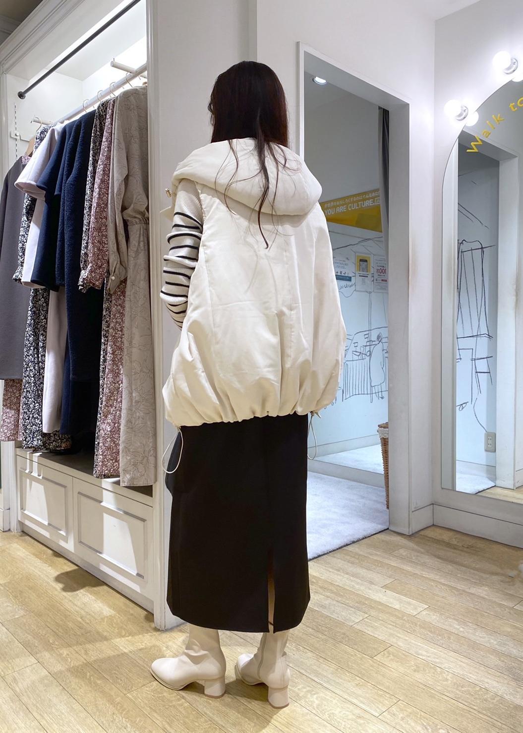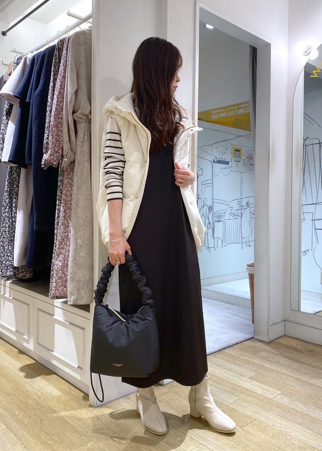 ボーダーのハイネックニット ✕ シンプルなキャミワンピのIラインシルエットに、フーディーダウンベストを合わせてボリュームとカジュアル要素をプラスした、モノトーンコーデに仕上げました!