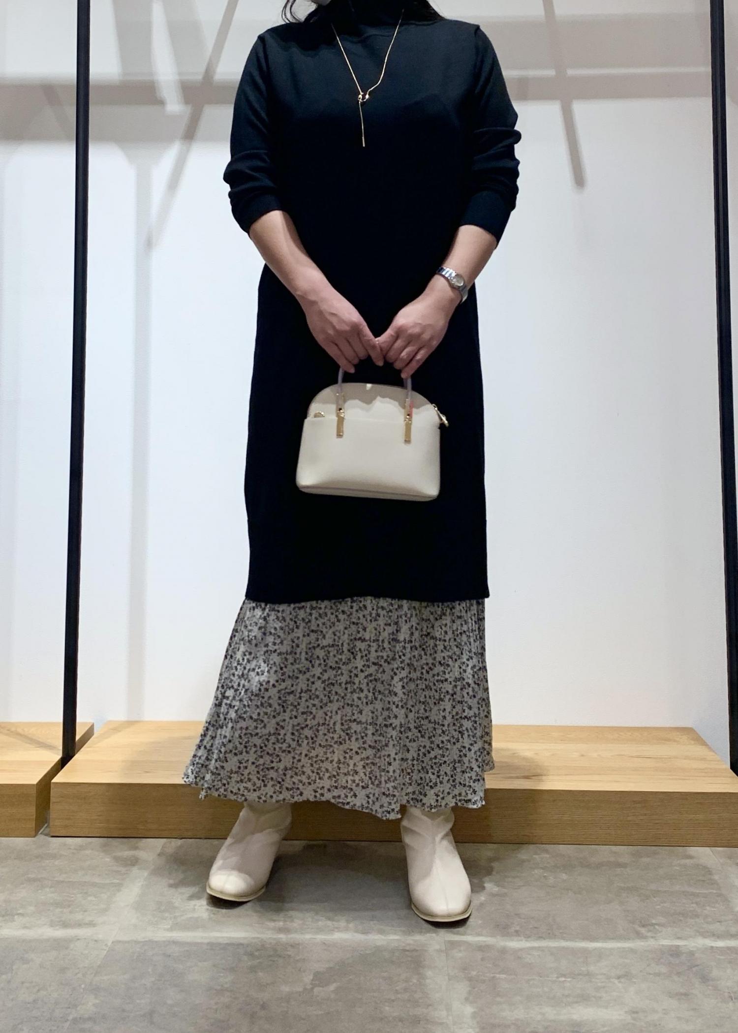 タートルネックのミニ丈ニットワンピースと着丈が選べるプリーツスカートです。