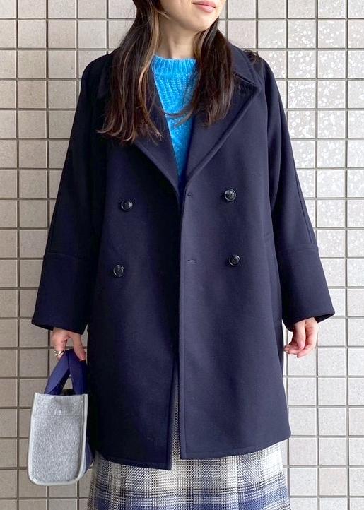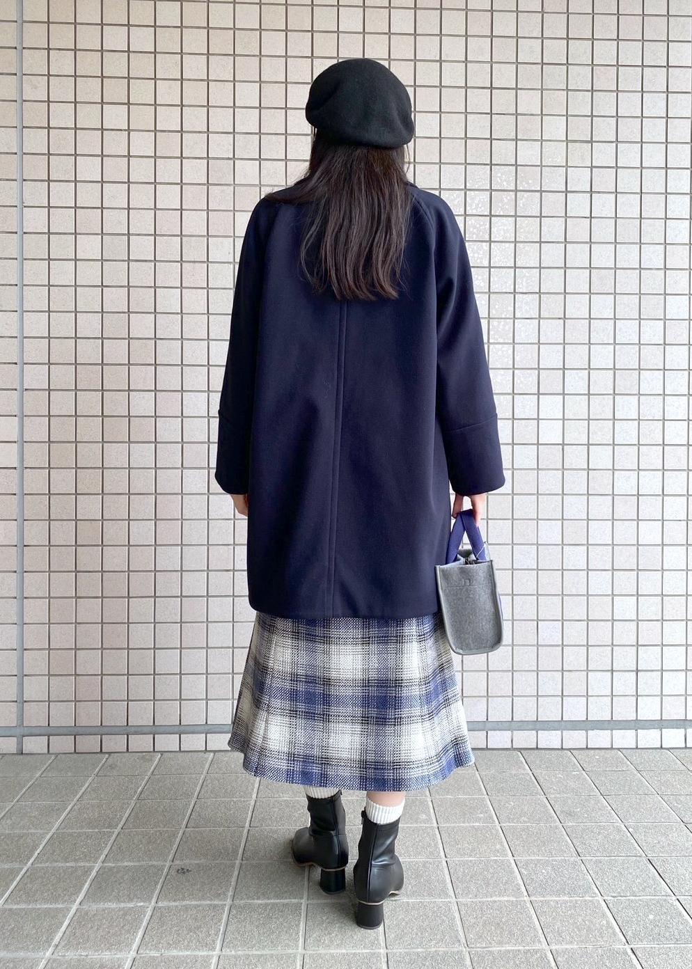 ブルーのニットをネイビーのアウターで女性らしいコーデにしました。 セミフレアのスカートは歩きやすいので、長時間のお出かけにも◎