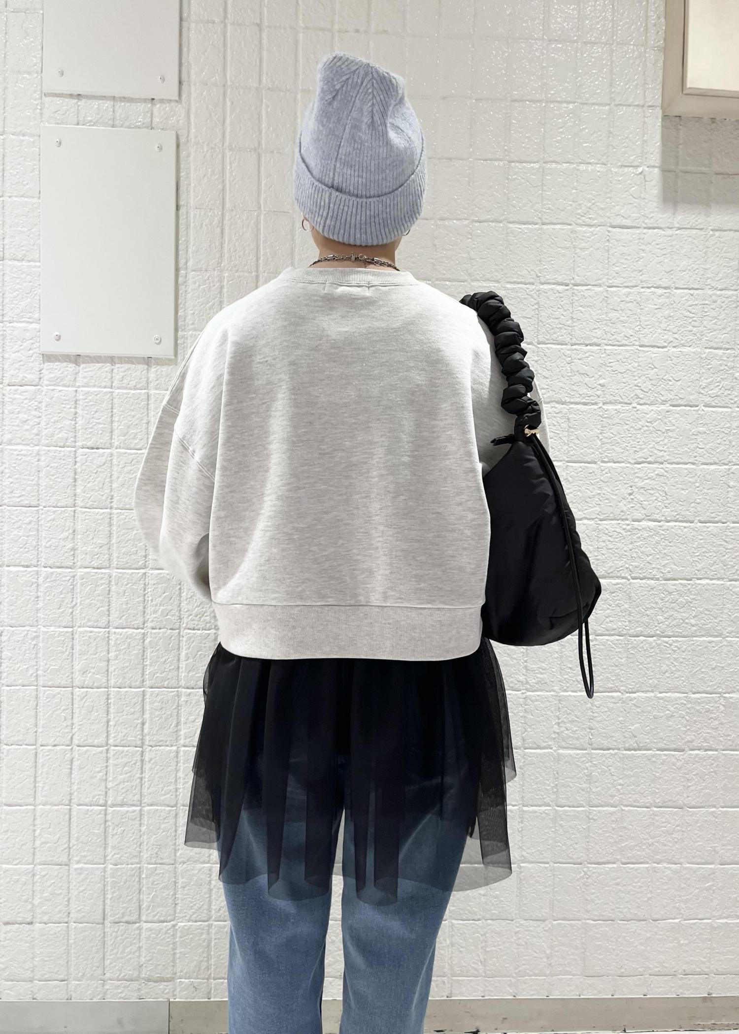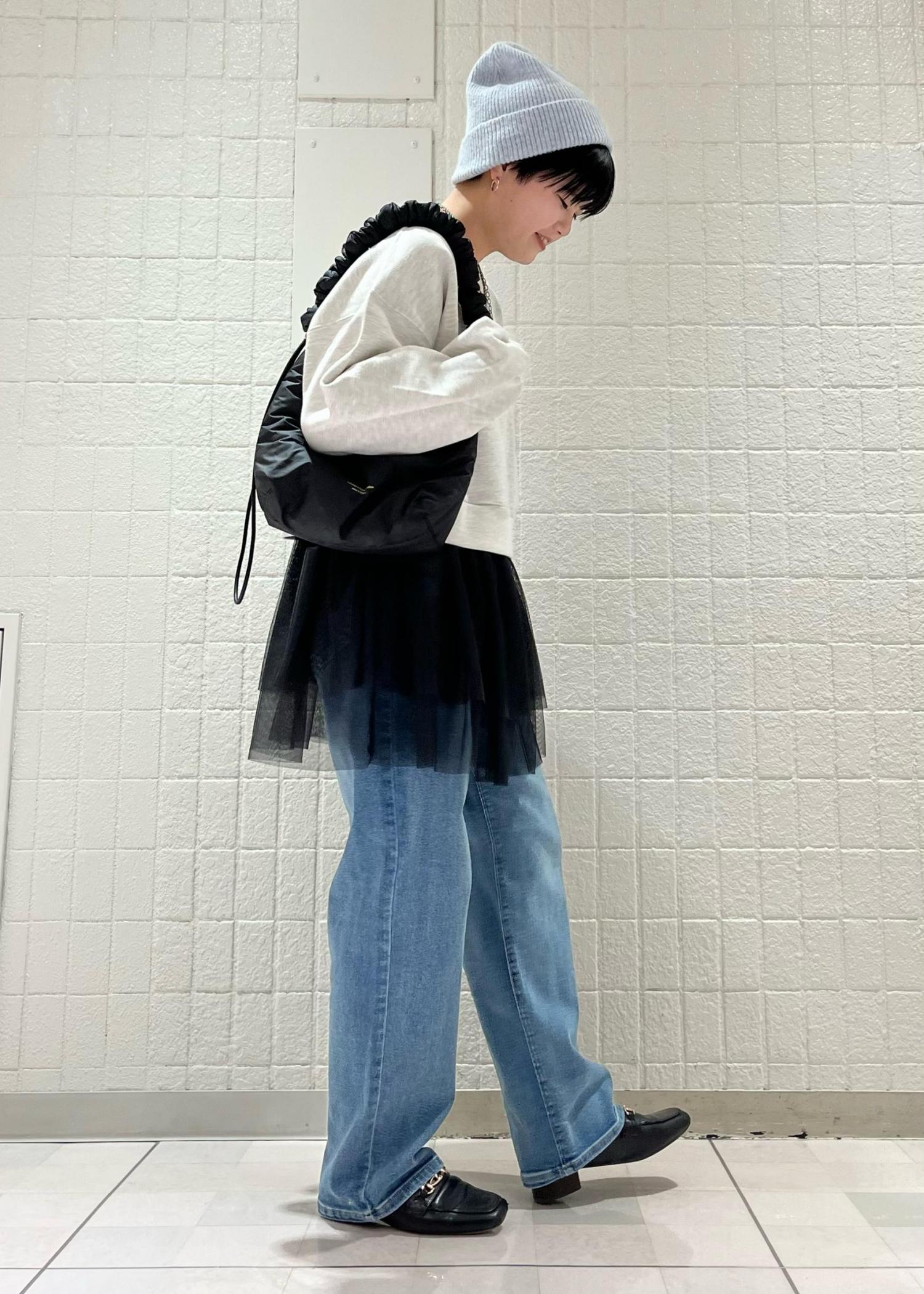 チュールトップスとギャザーバッグを合わせてトレンド感も詰めこんでみました♪
