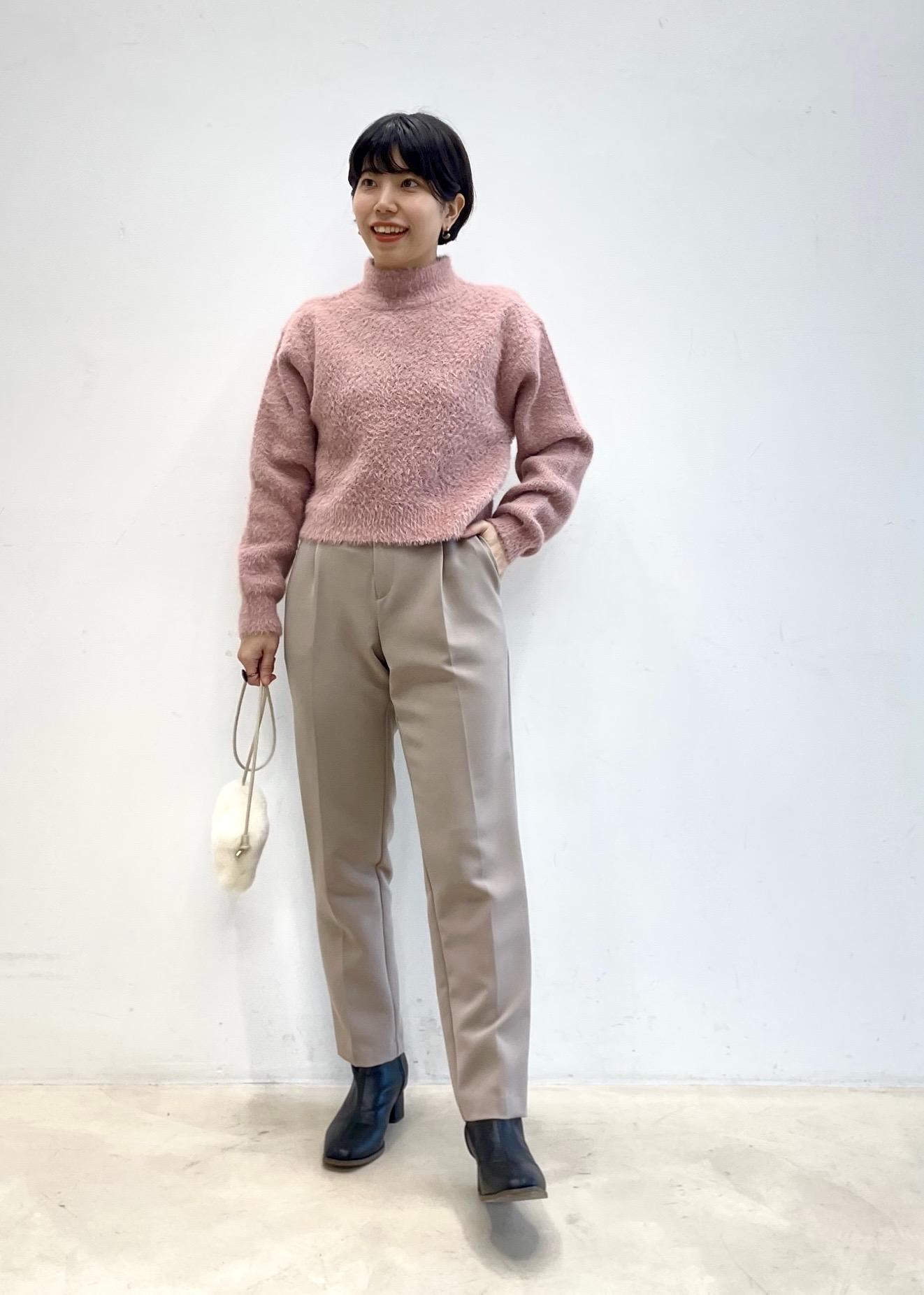 毛足の長い素材感がポイントのピンクニット。 ベージュのパンツを合わせて淡カラーコーデに!
