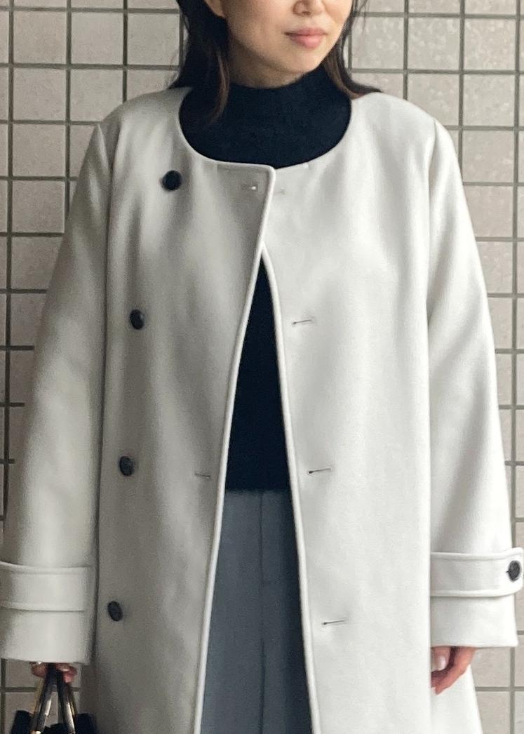 メルトンジャージー素材の軽やかなコートにブラックのシャギーニットをあわせ暖かみのあるコーデに! 襟は取り外し可能なので、ノーカラーですっきり◎