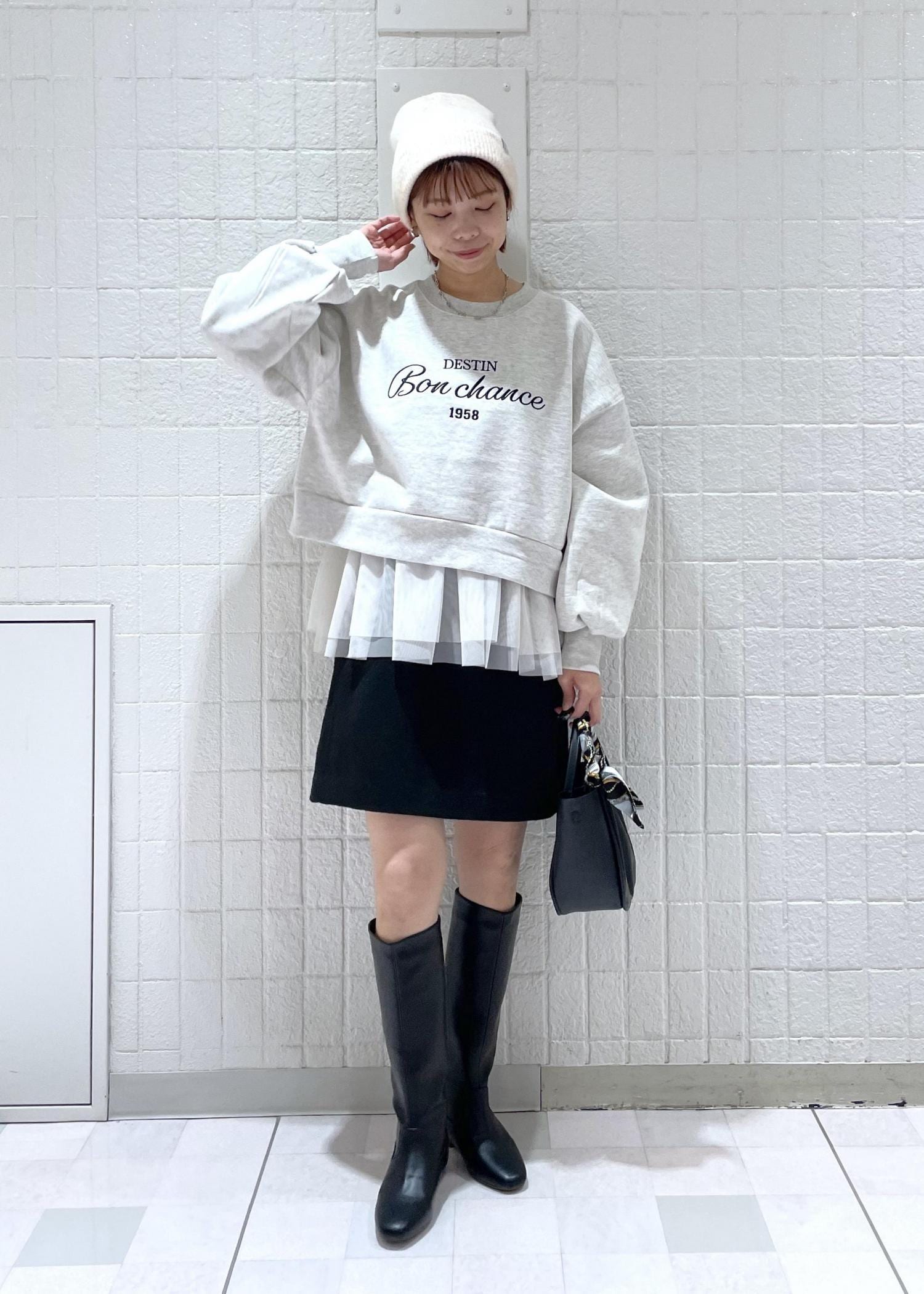 今年はおさえておきたいクロップド丈!チュールのインナーをレイヤードした新鮮さのあるスウェットコーデ。重たく見えないよう、ミニスカートですっきりとまとめてみました。