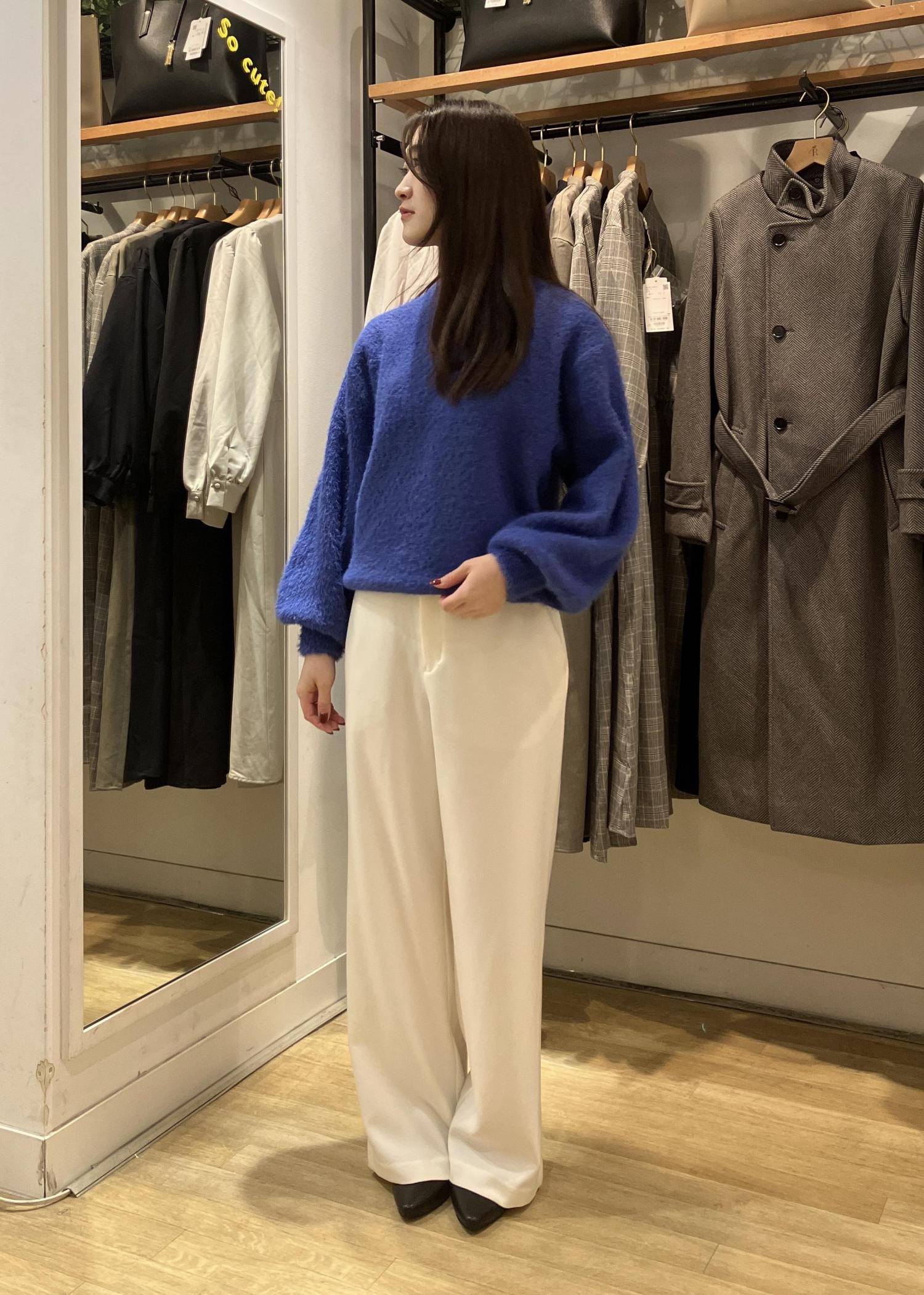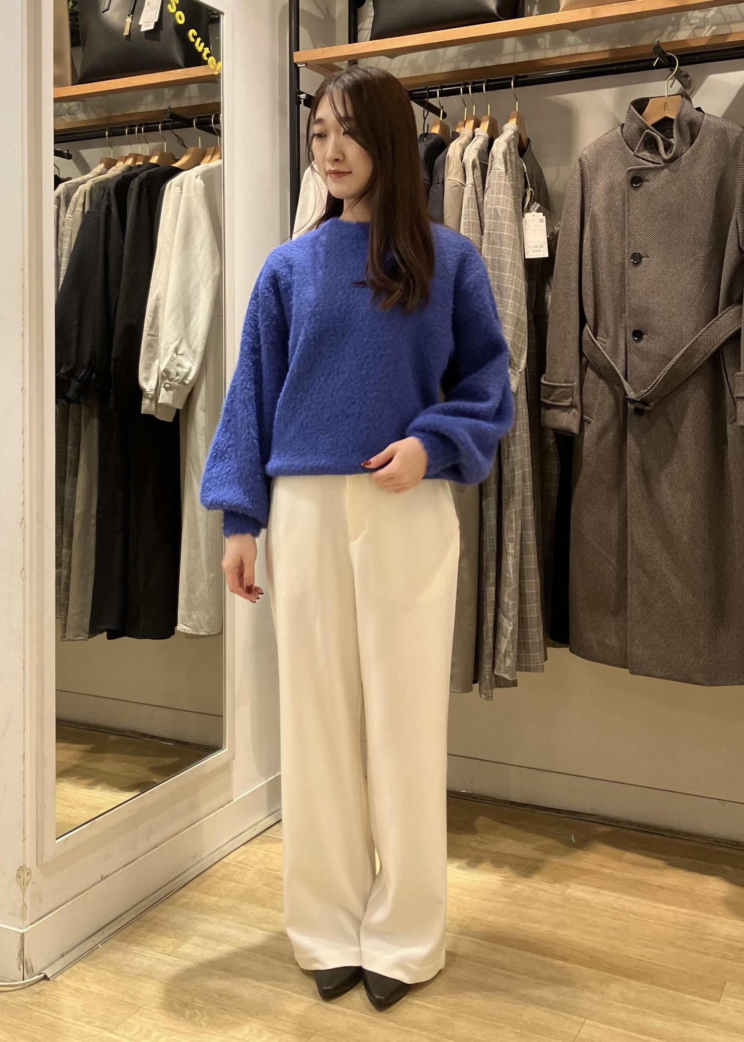 ブルーのニットにホワイトカラーのワイドパンツを合わせました。 綺麗めなカジュアルコーデにおすすめです。