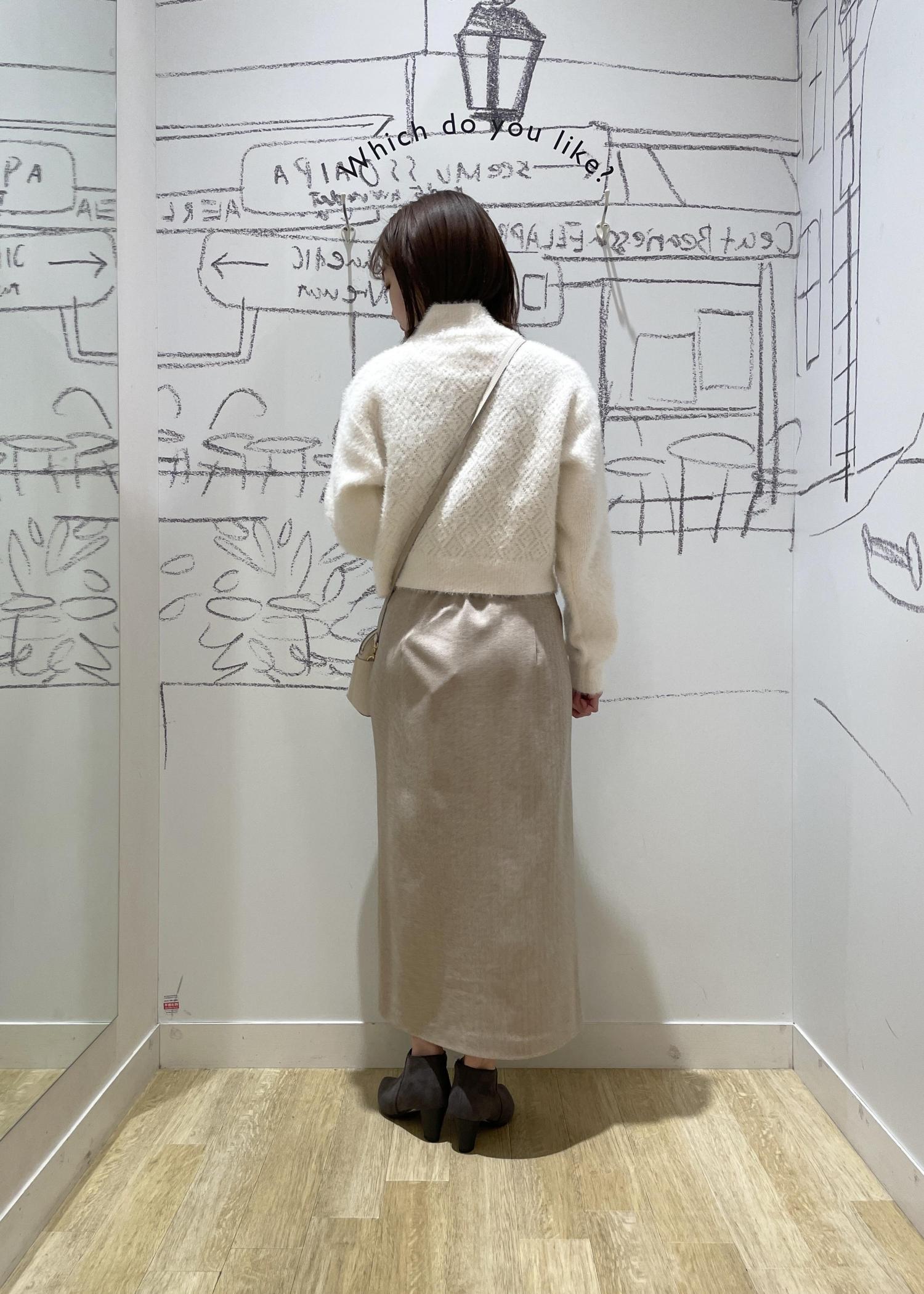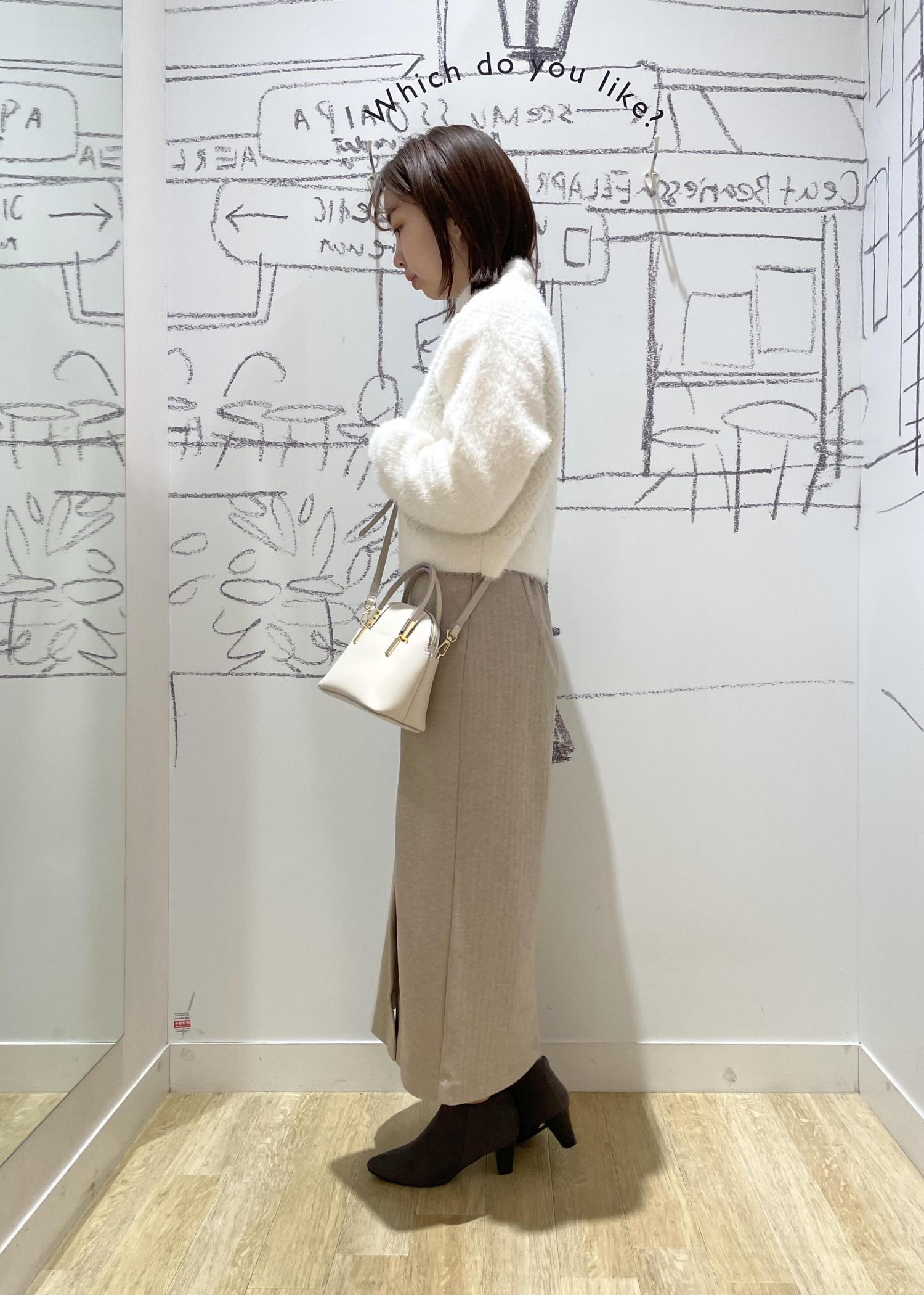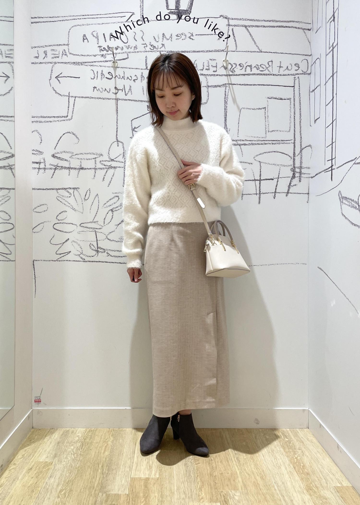 クリスマスのコートインにおすすめコーデ。 ふわふわとしたニットは女性らしく 柔らかい印象に。 ホワイトコーデで今年らしく◎