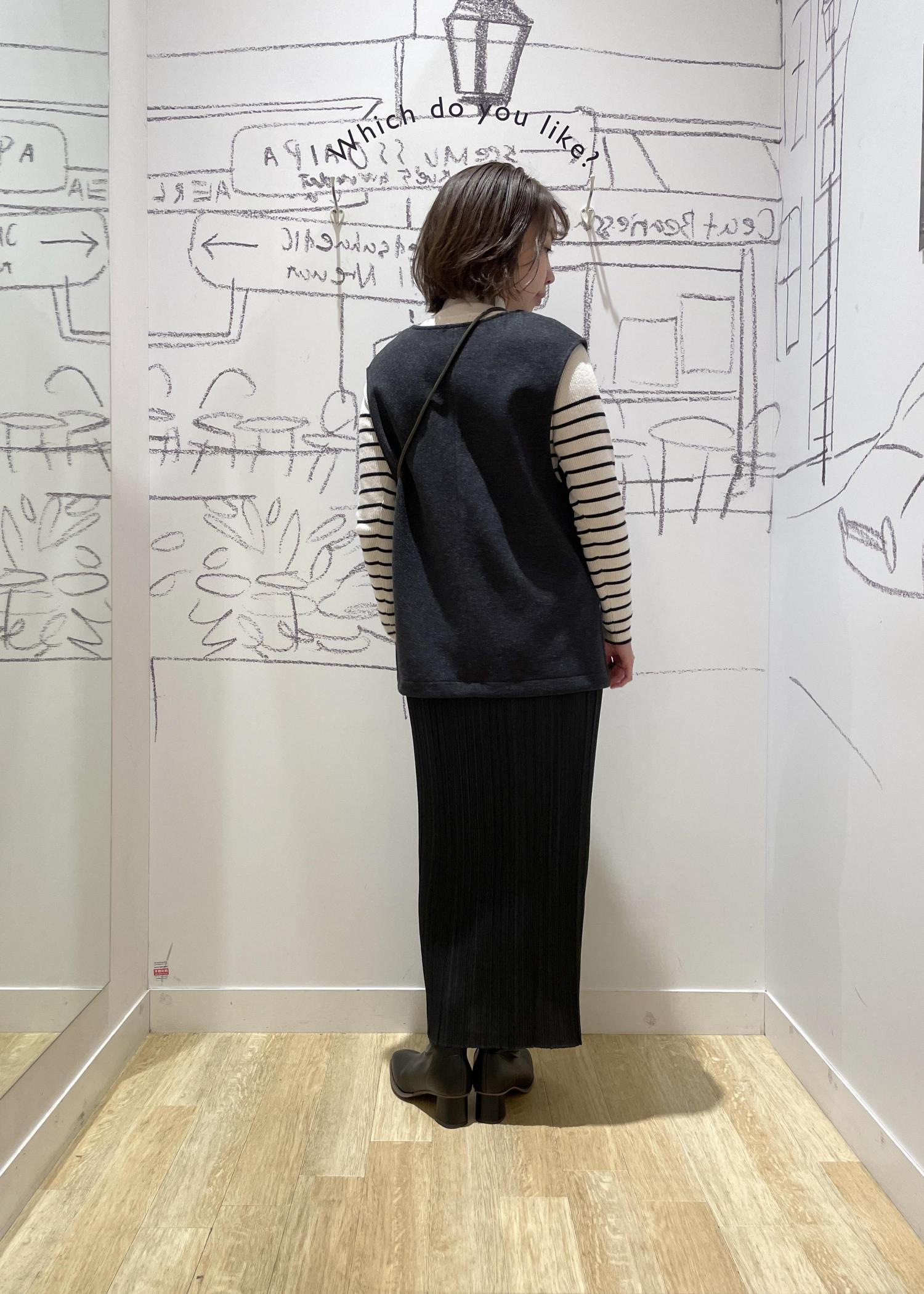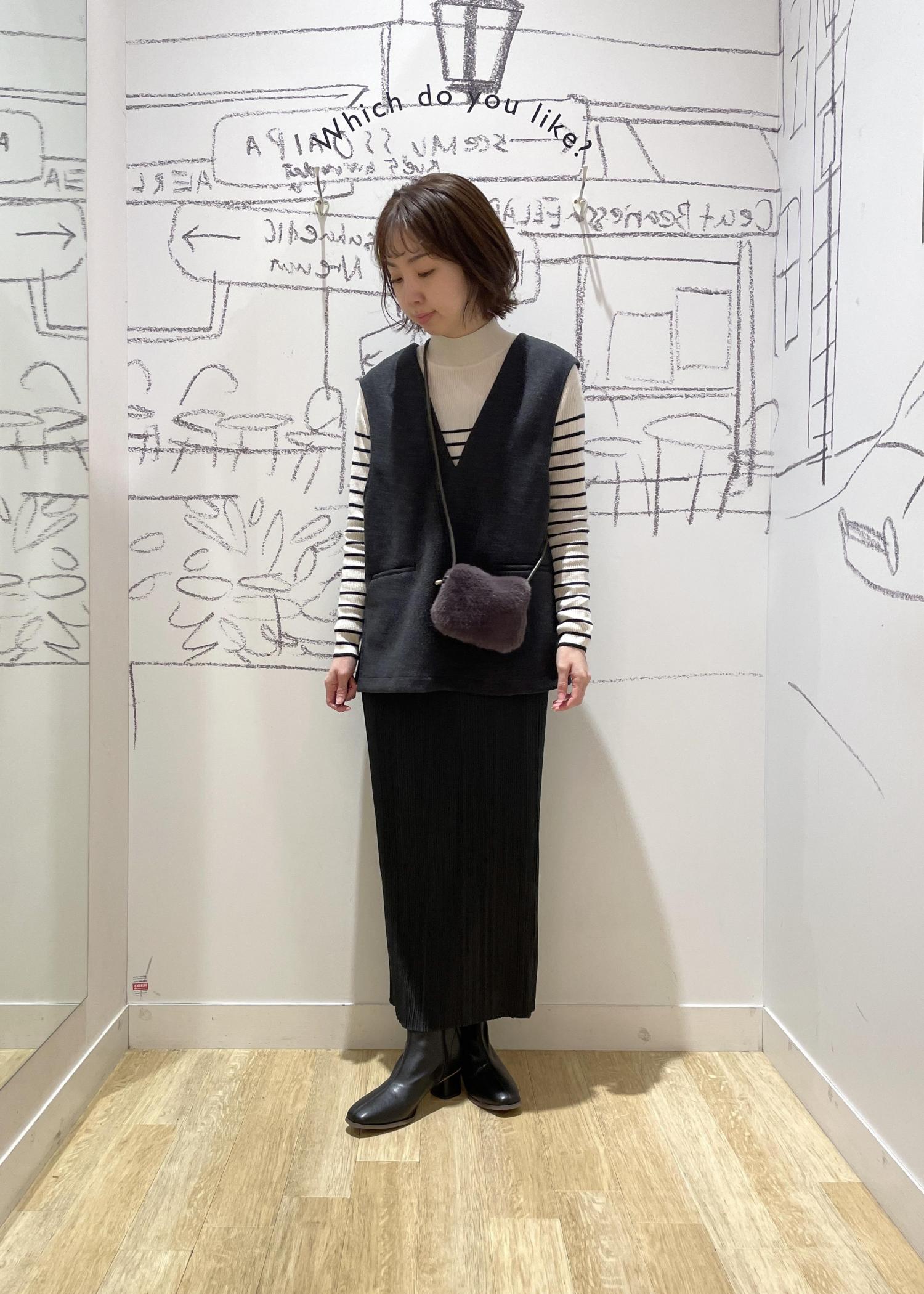 リアル店限定のベストにあわせた シックな大人コーデ。 フェイクファーのミニバッグは コーディネートのポイントに◎