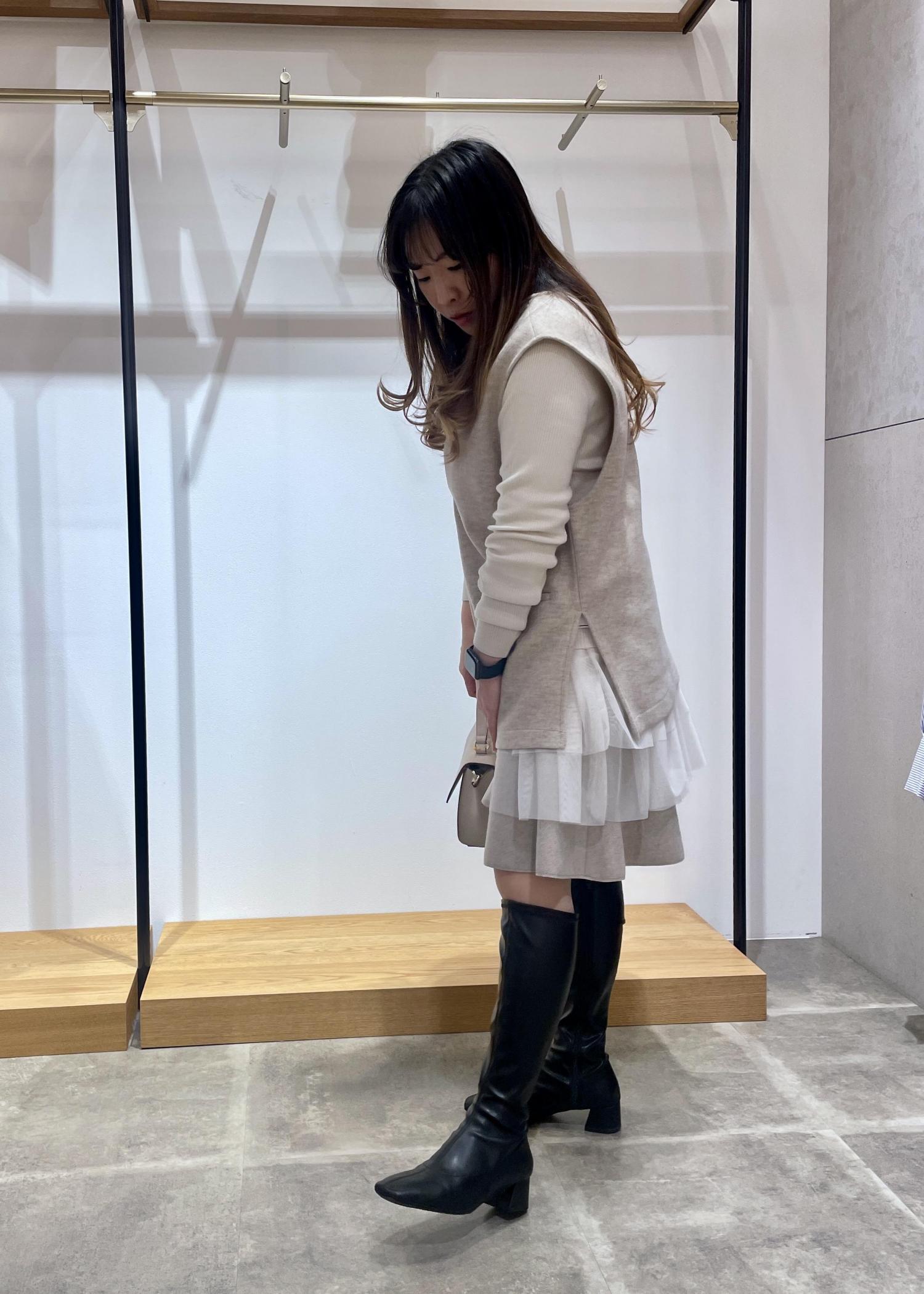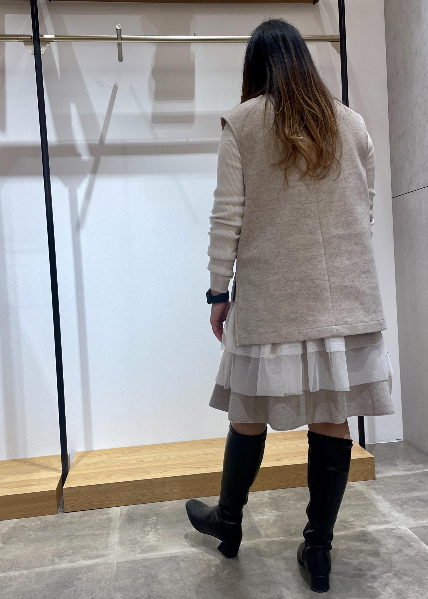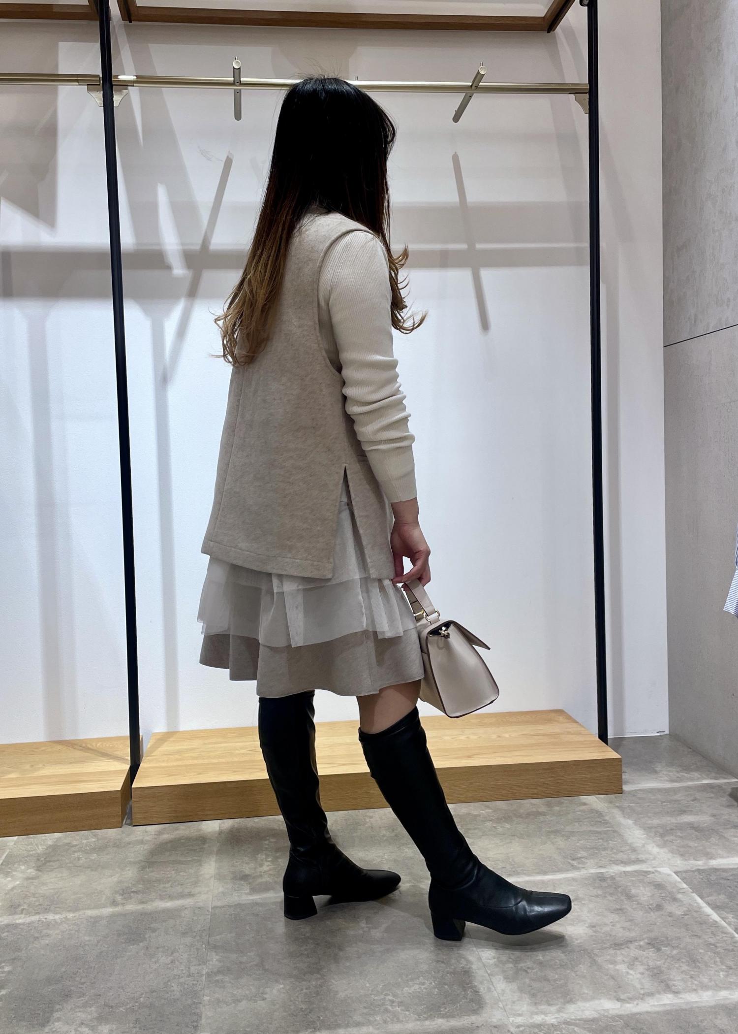 丈の長いチュールにミニスカートを合わせてみました。お尻までスッポリ隠れるので体型カバーにもなりますし、華奢見え効果ありです。