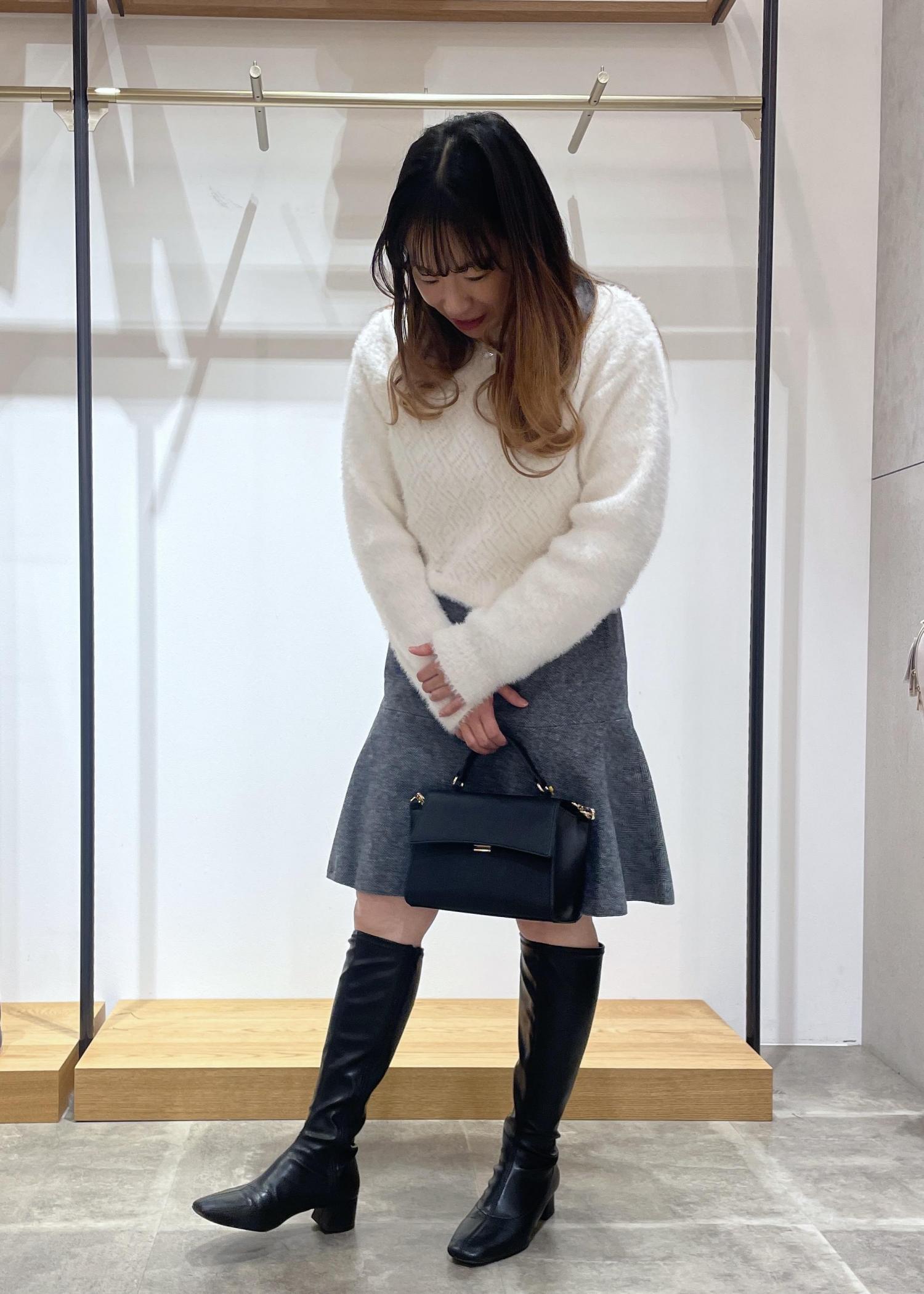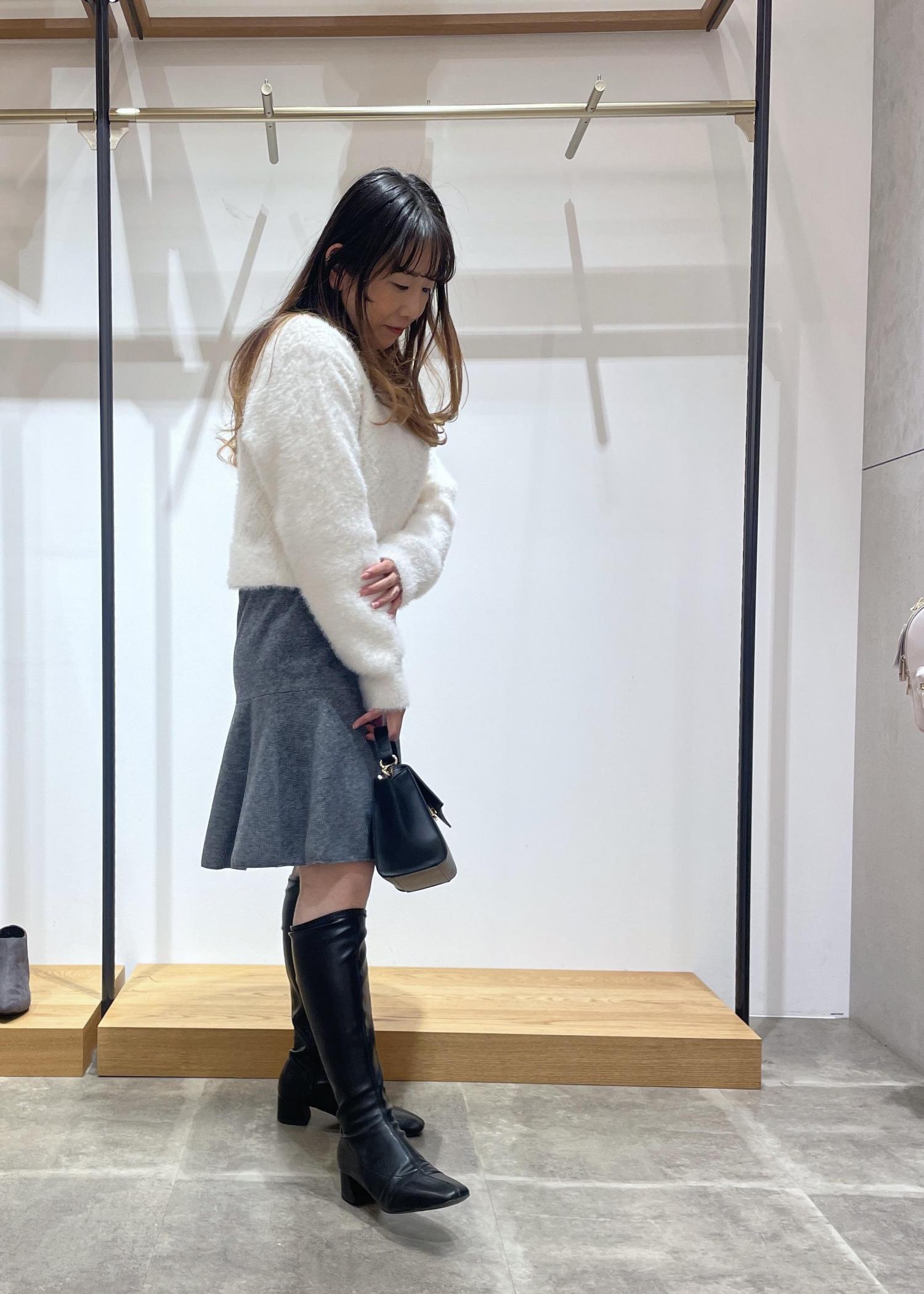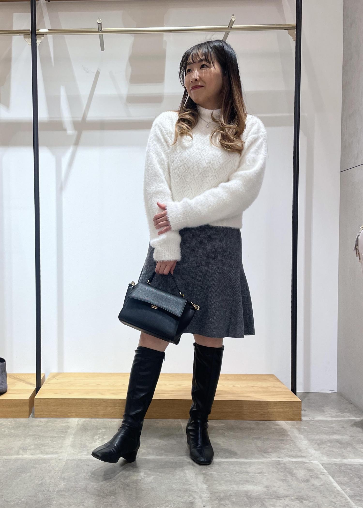 白のシャギーニットで冬らしい大人可愛いコーデにしてみました。クロップド丈なので低身長の方でもバランスが取りやすくスッキリ着て頂けます。