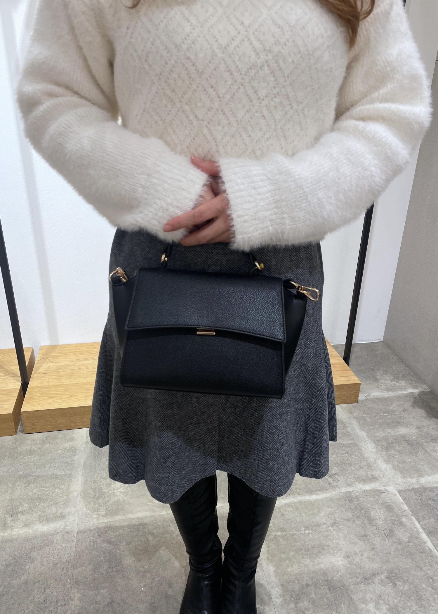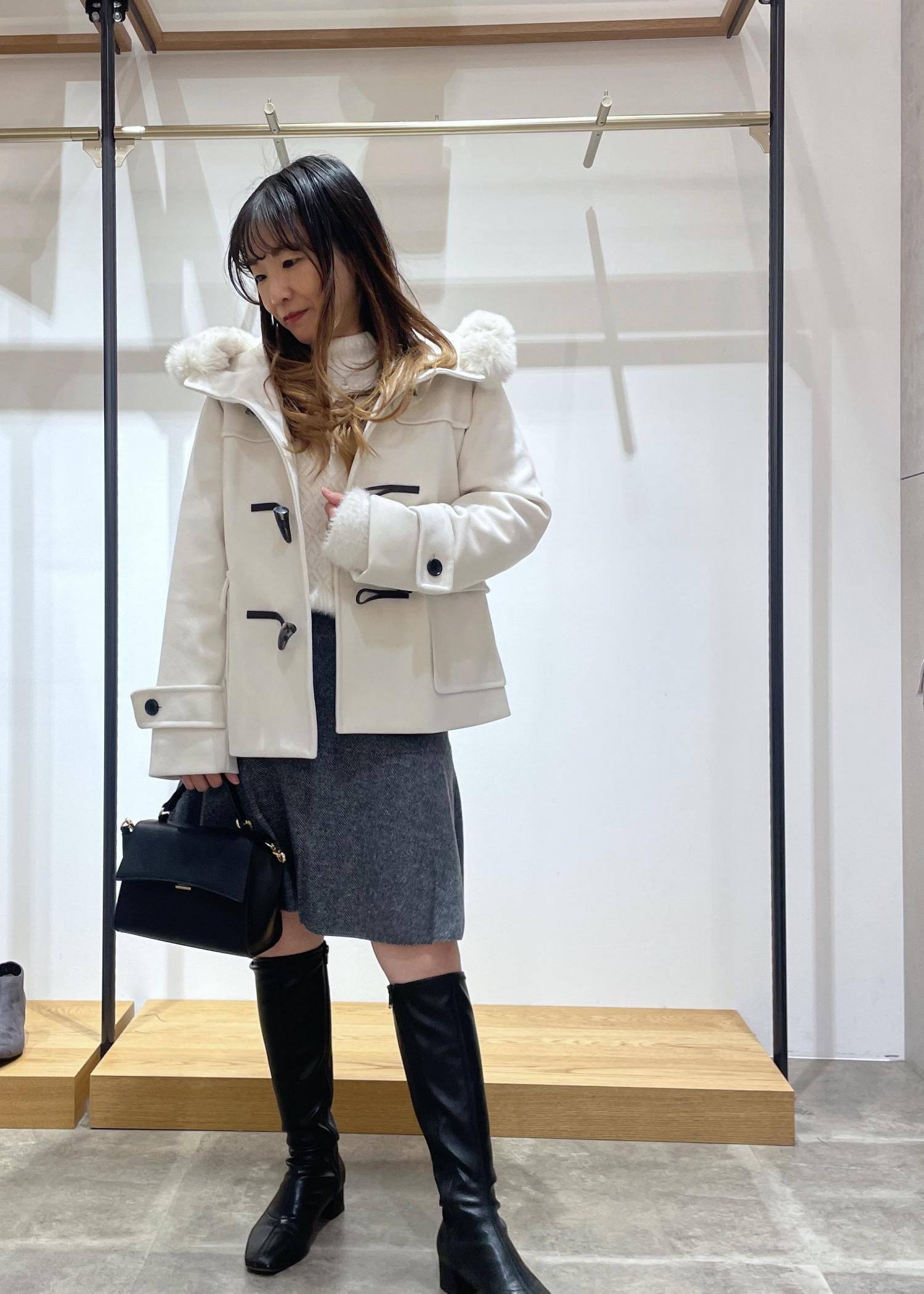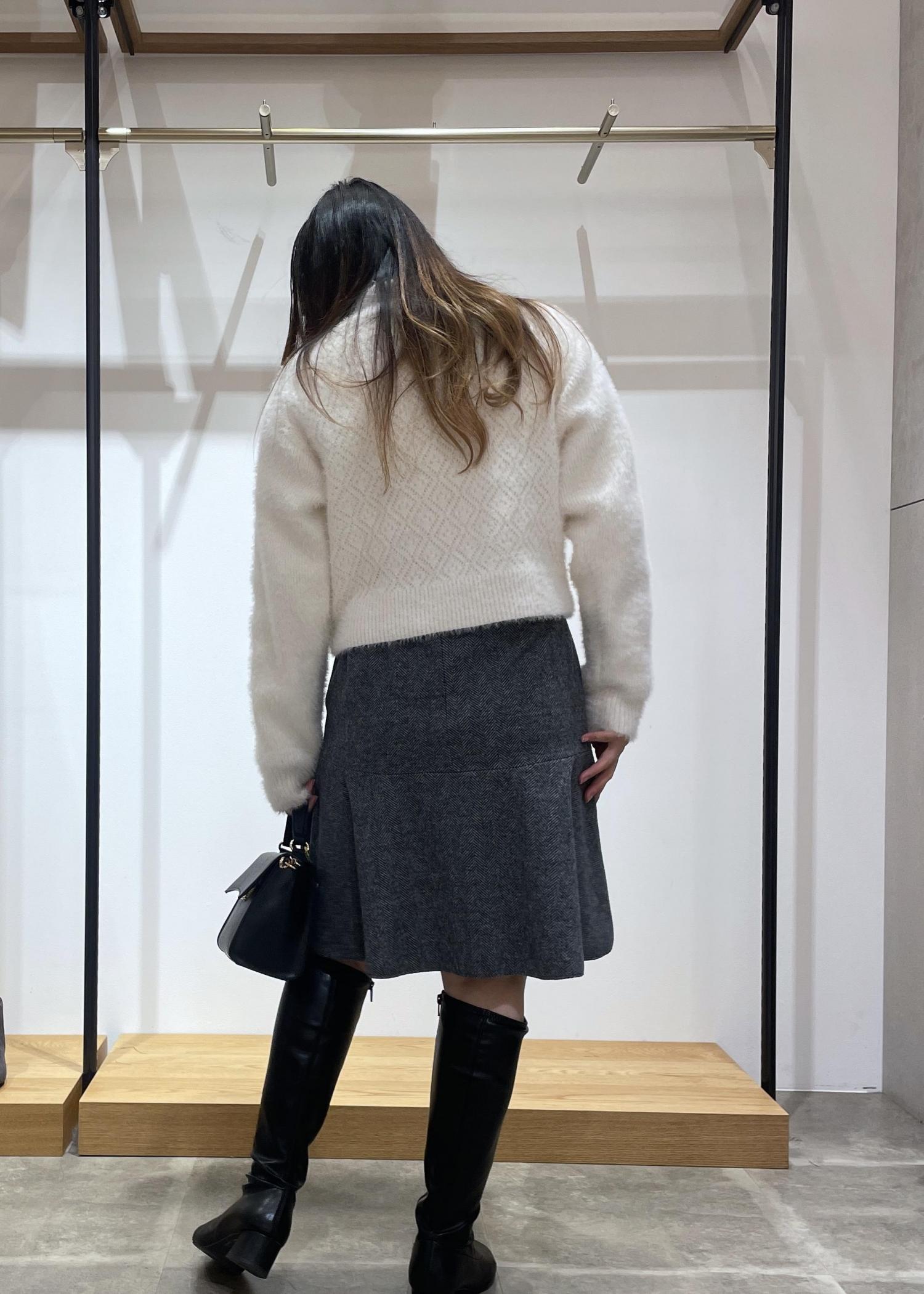 白のシャギーニットで冬らしい大人可愛いコーデにしてみました。クロップド丈なので低身長の方でもバランスが取りやすくスッキリ着て頂けます。