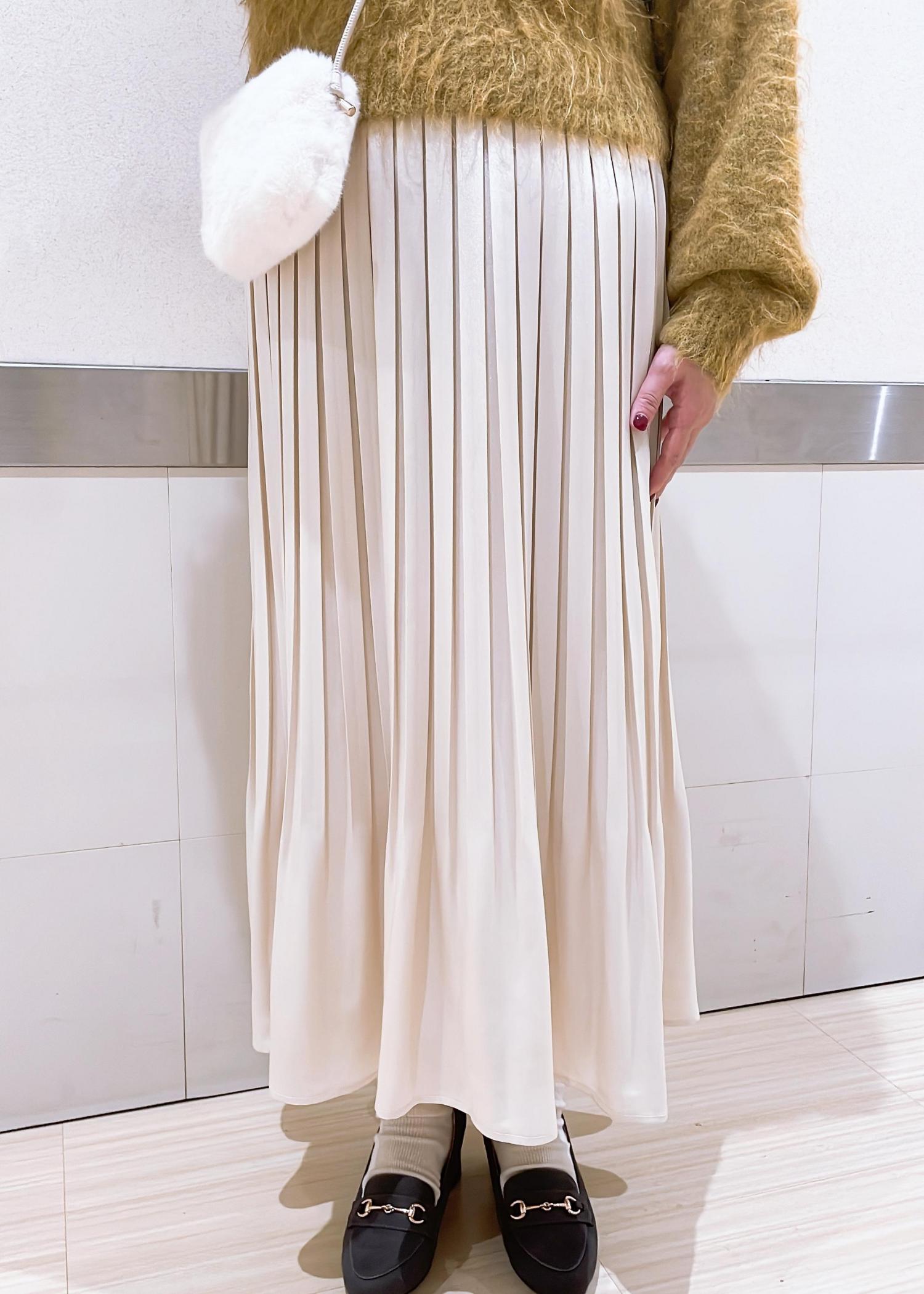 イオンモール、ららぽーと限定ニットカーディガン【GDK24020】とプリーツスカートを合わせてキレイめカジュアルに仕上げました。