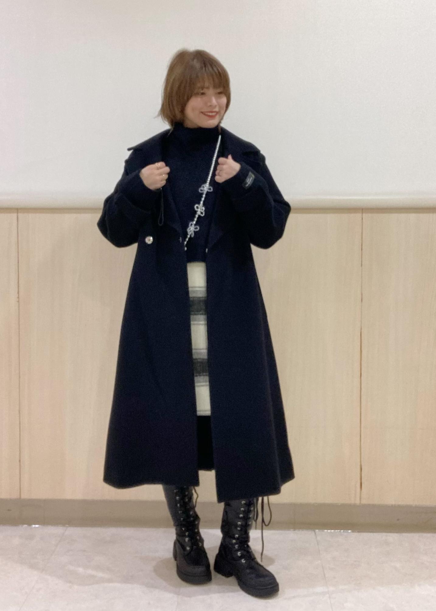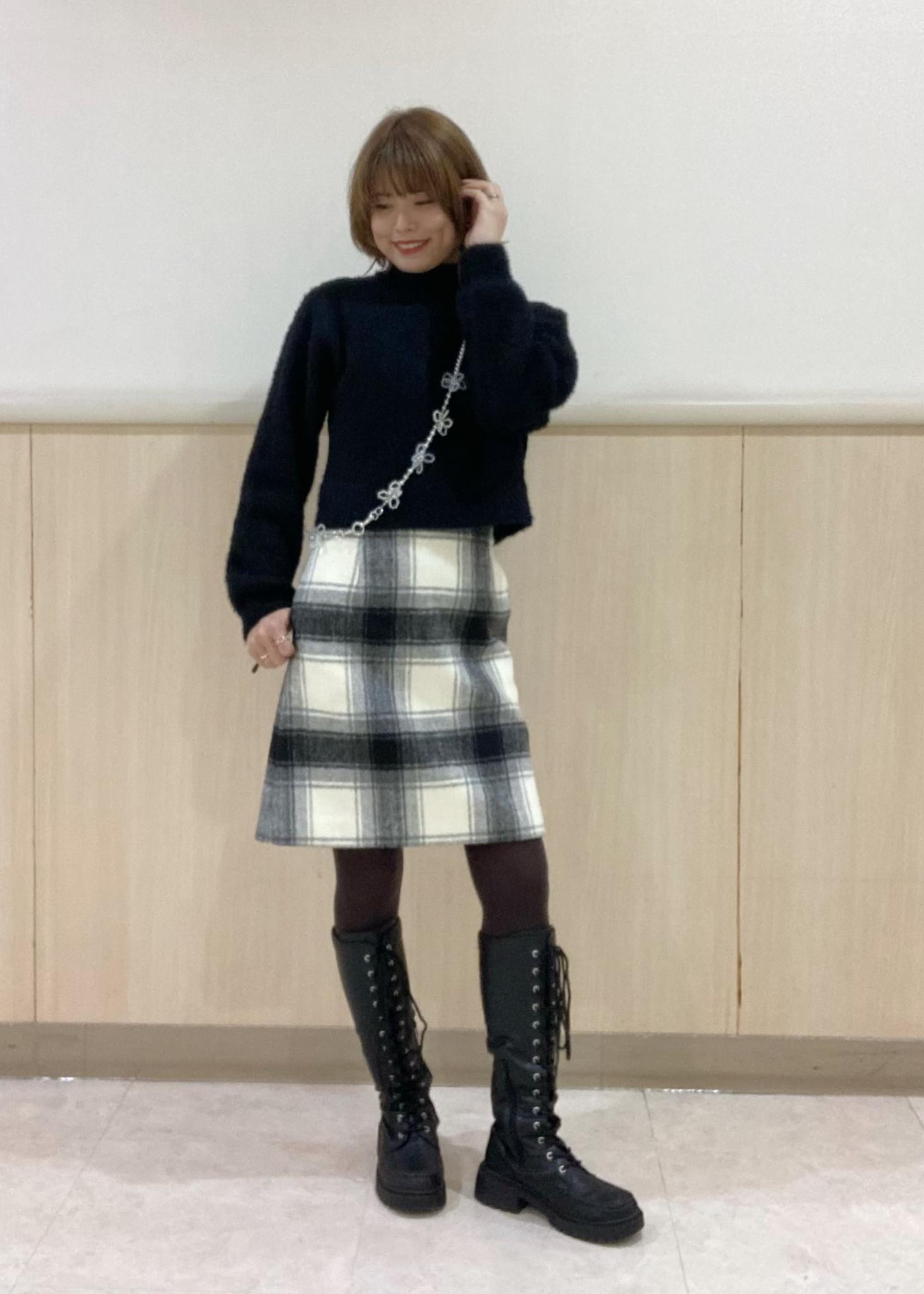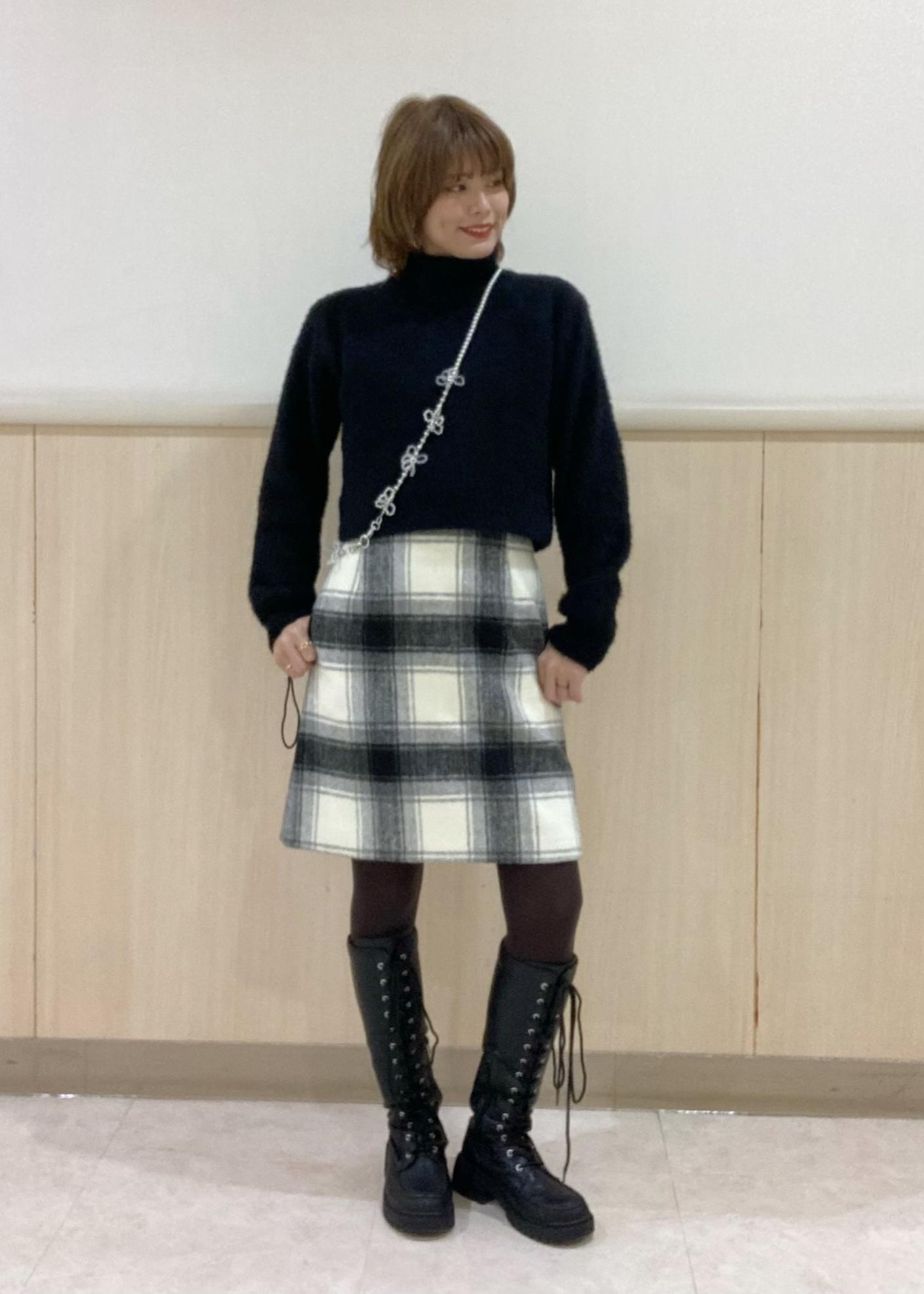 ショート丈のニット×ミニ丈スカートを合わせた大人可愛いコーデです♪ビーズフラワーのスマホショルダーを合わせる事でアクセサリー要らずでコーディネートも華やかになります♡