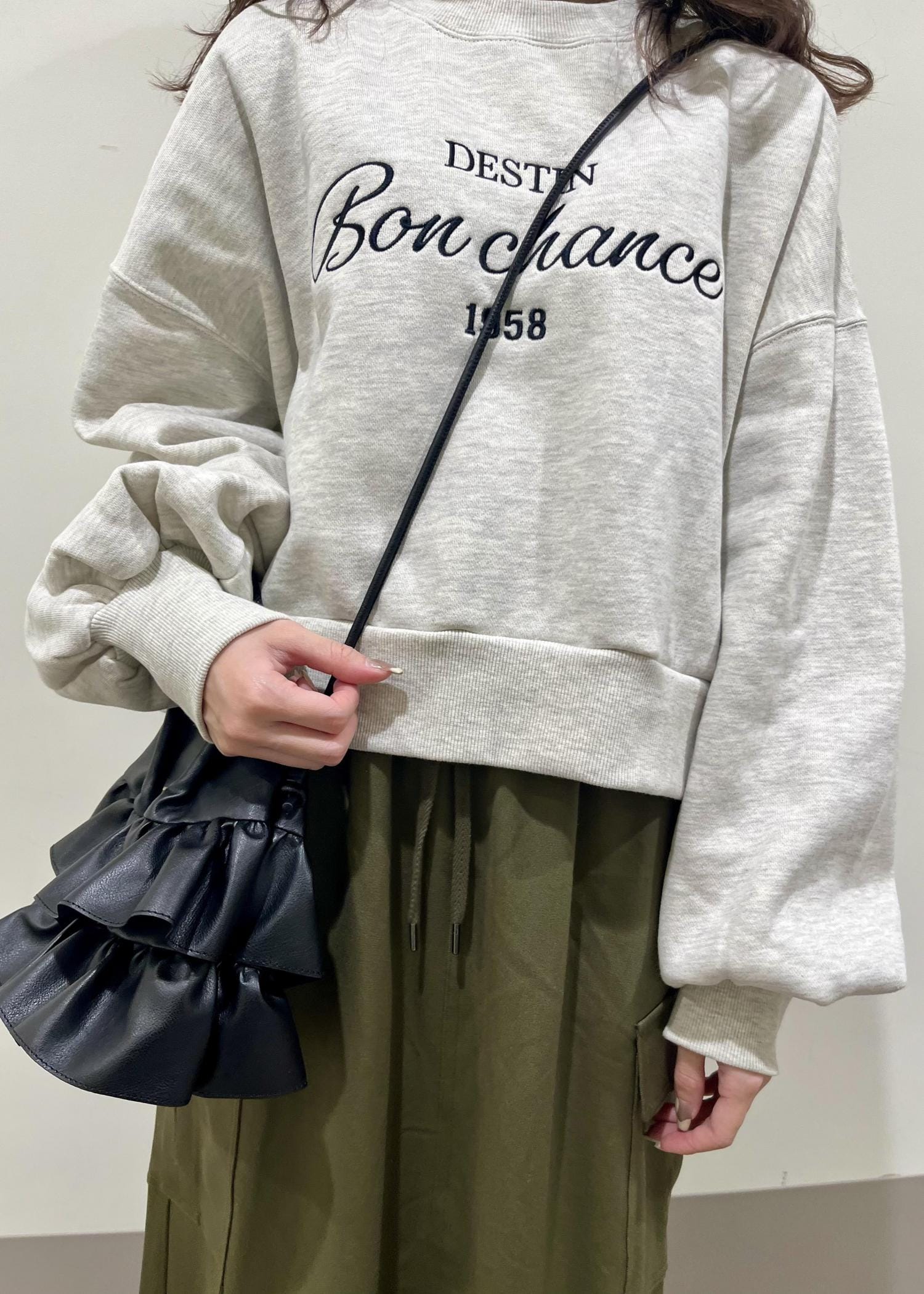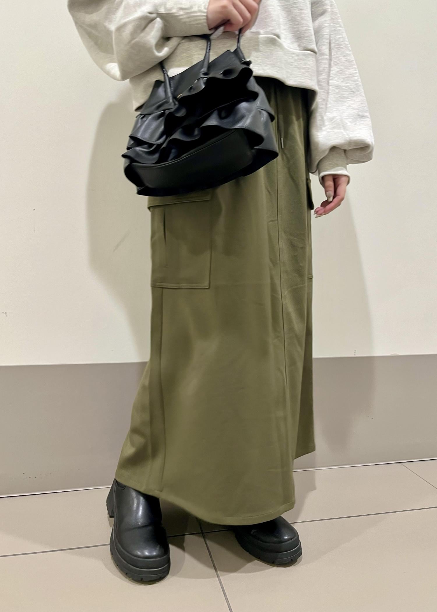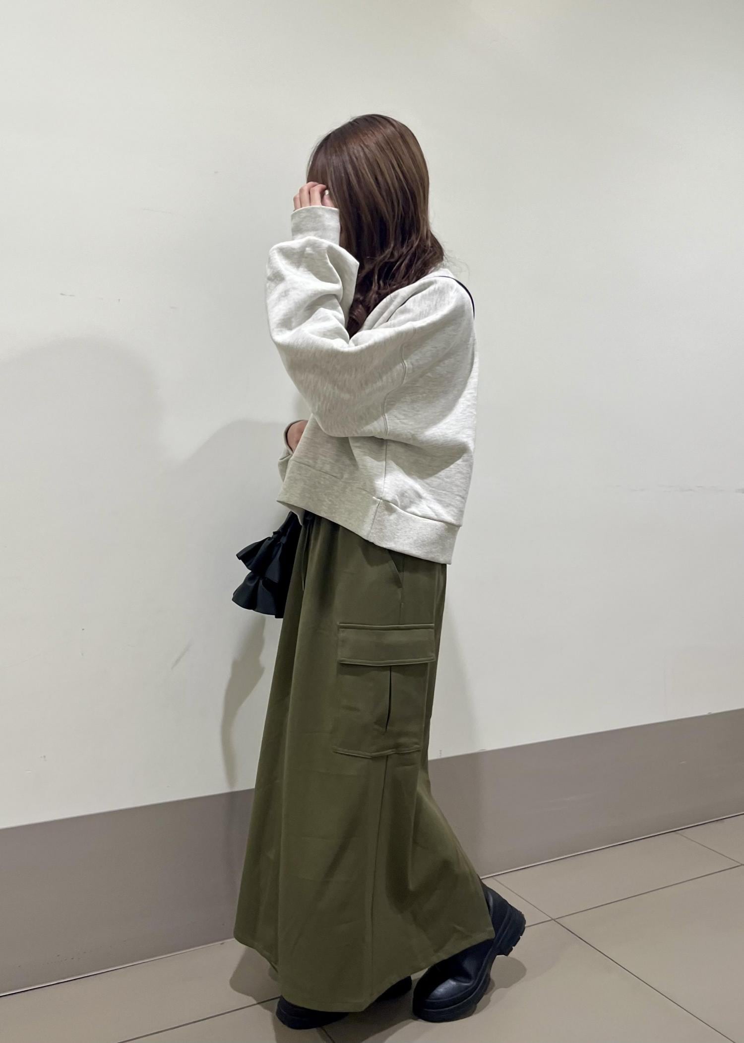 カジュアルなスウェットに、カーキのスカートを合わせて楽ちんなお出かけコーデにしました!!