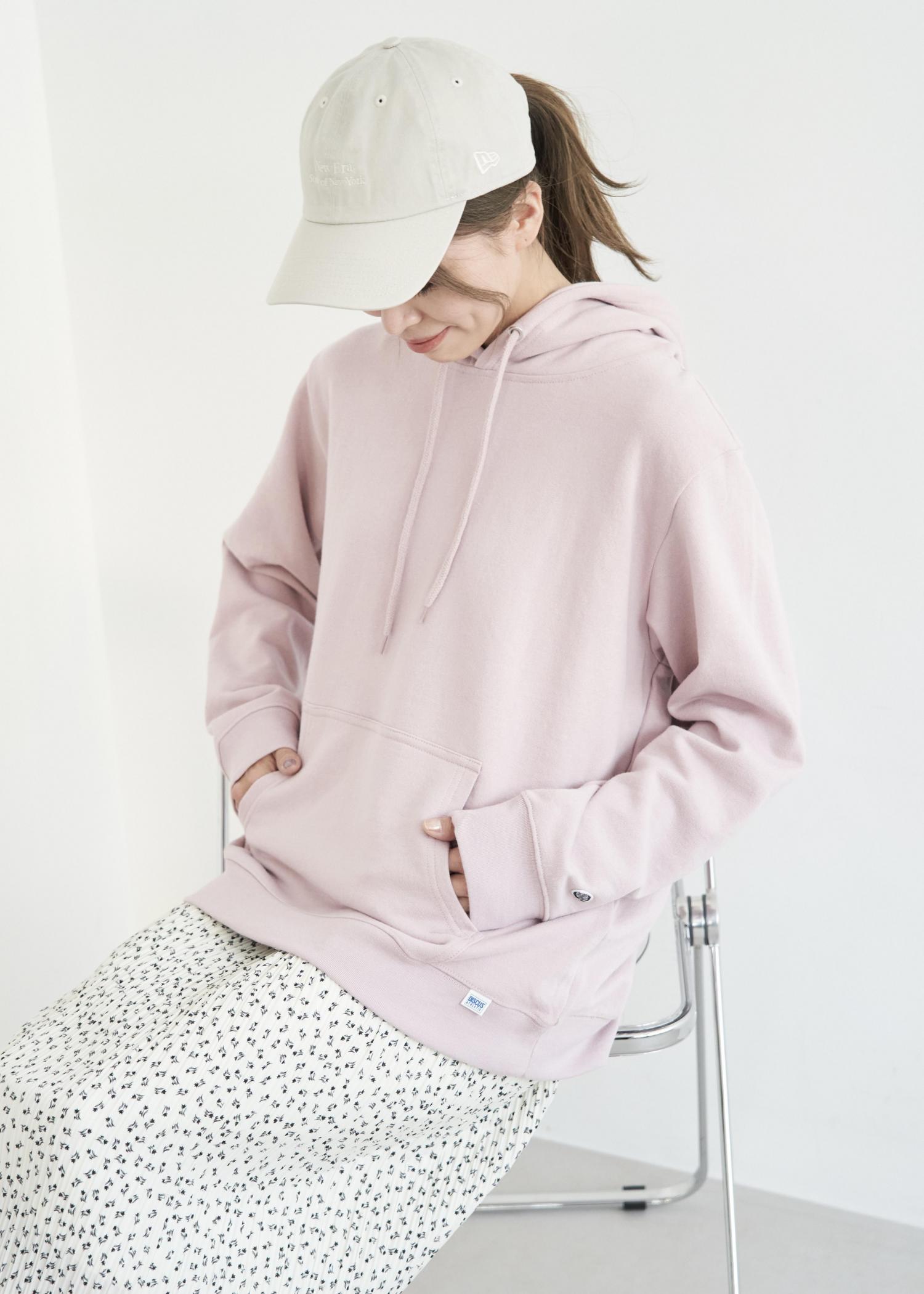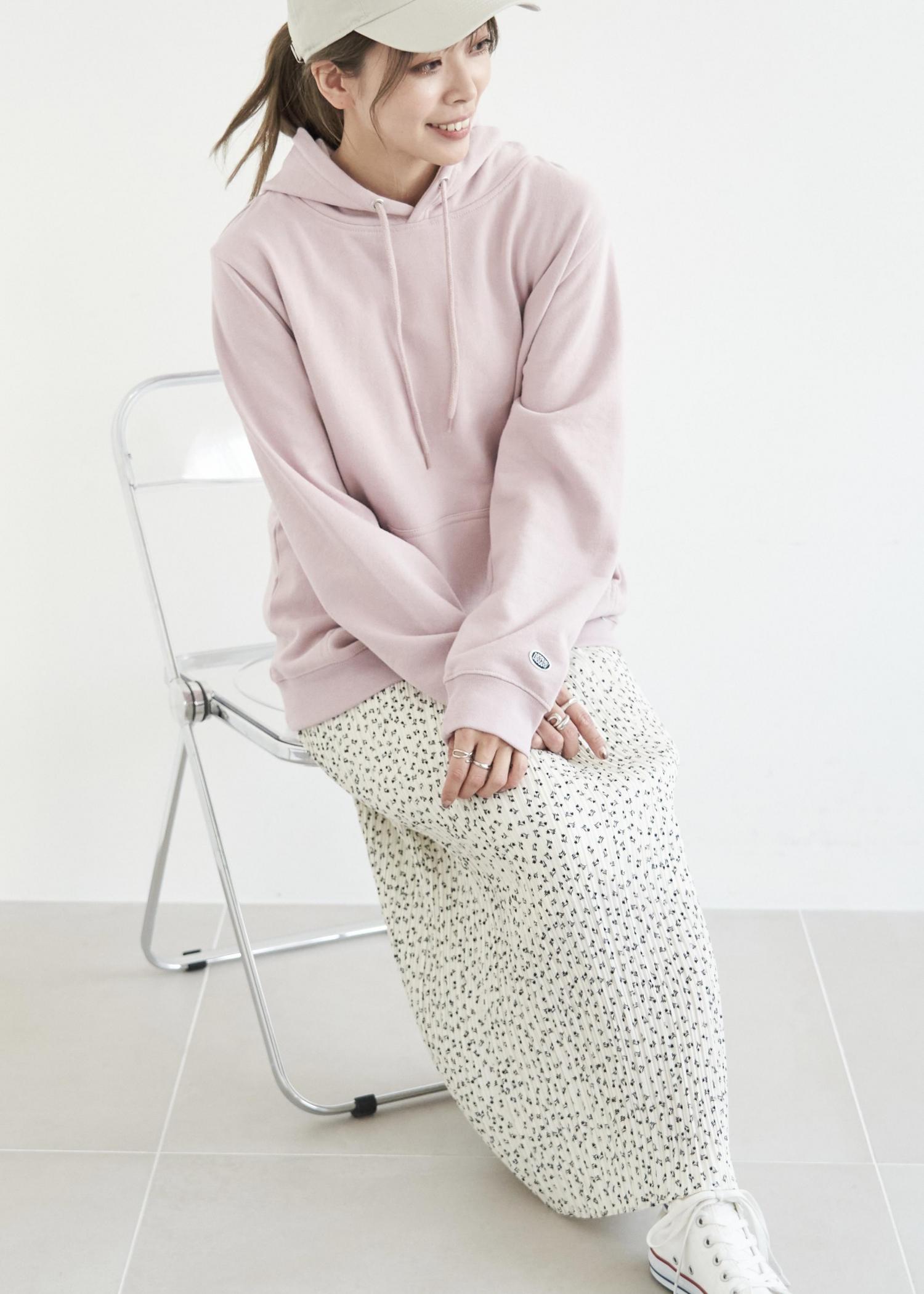 明るいピンクのパーカーは花柄スカートを合わせて、可愛らしさも大人女子コーデに。