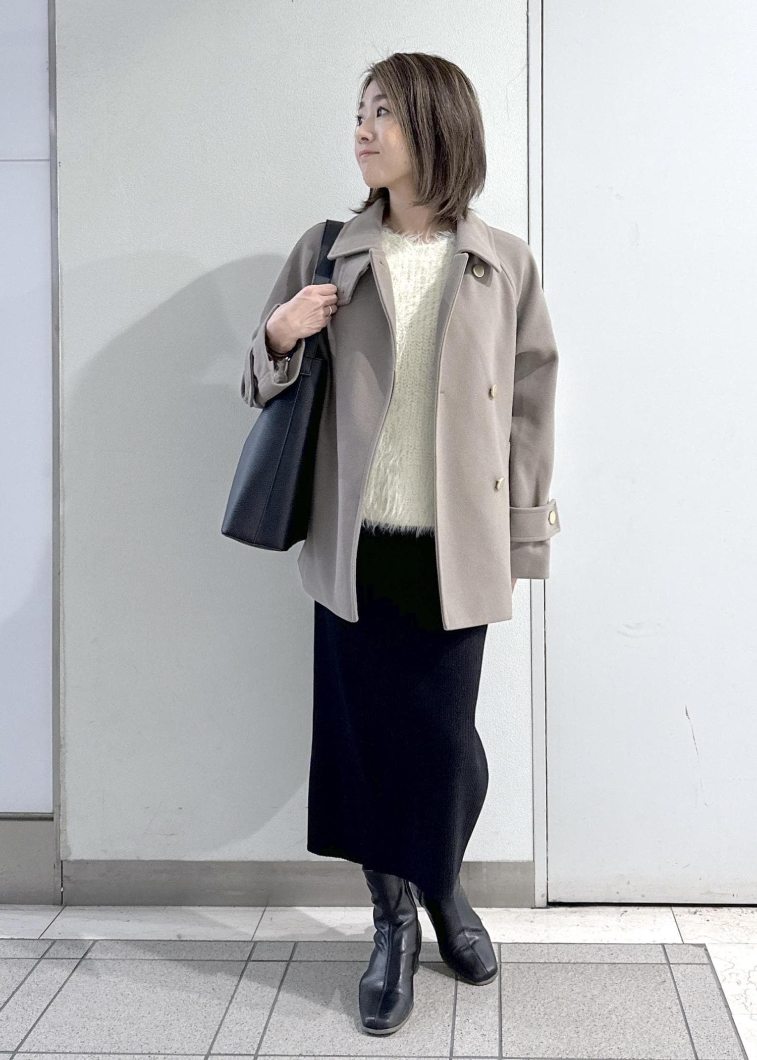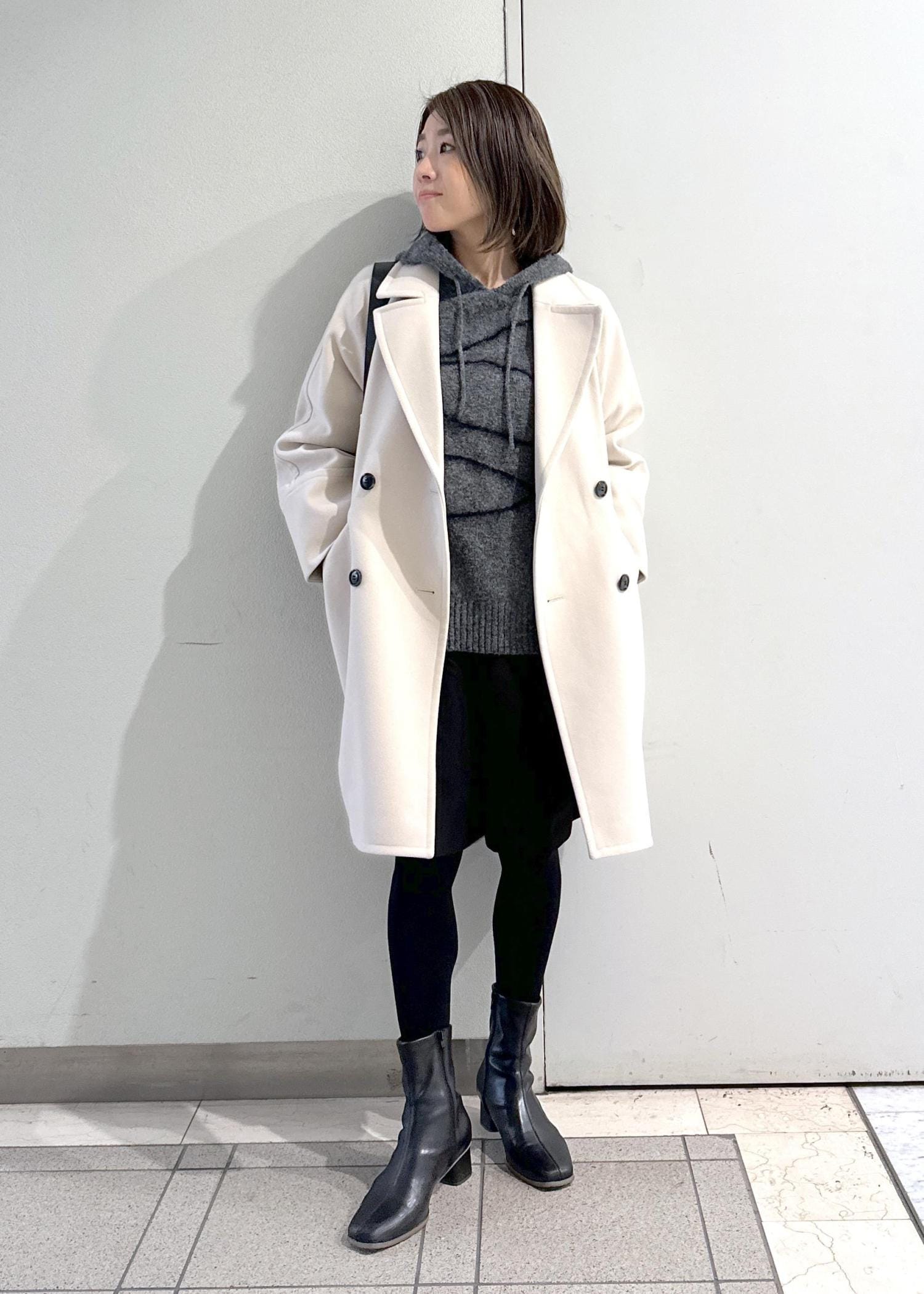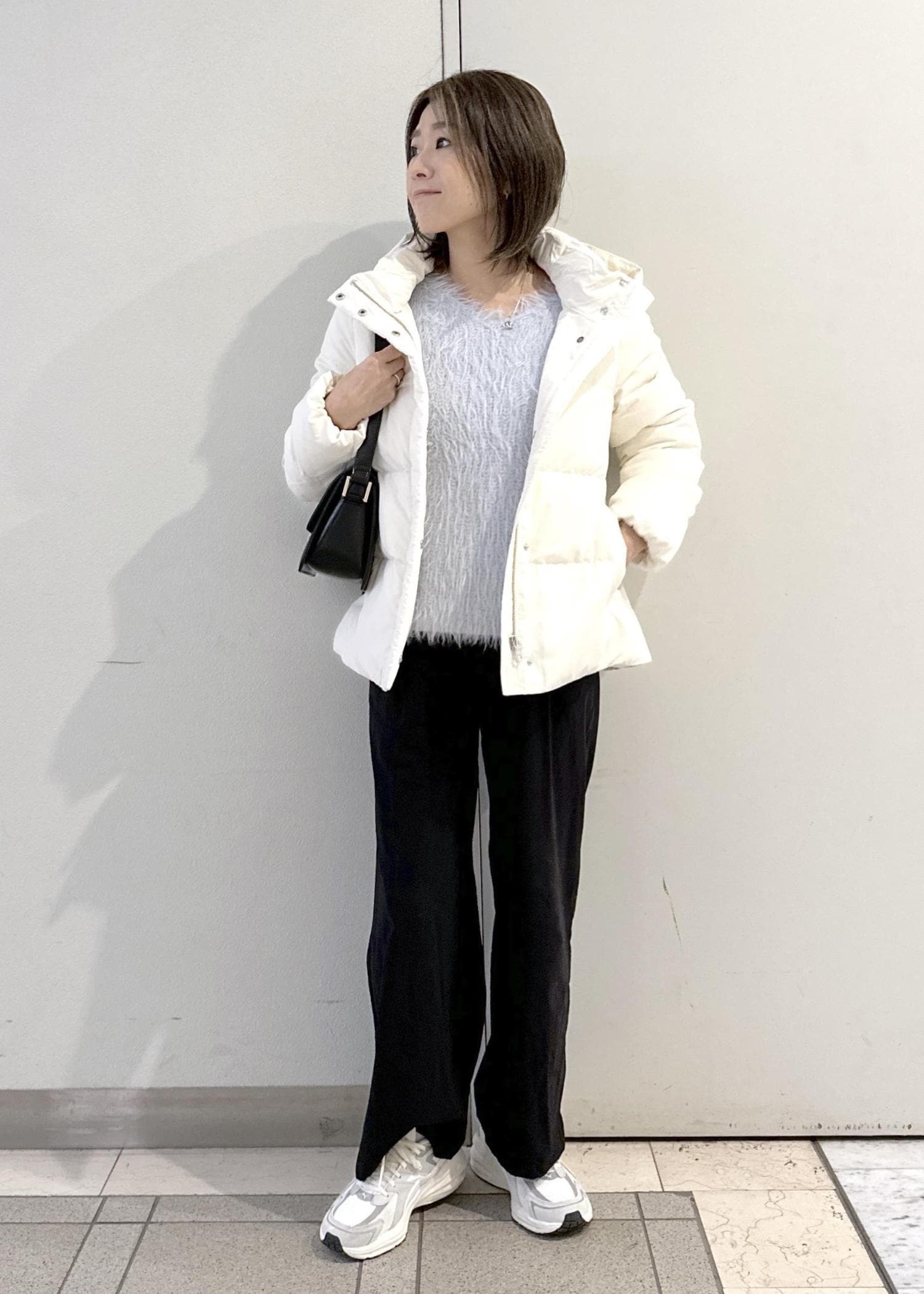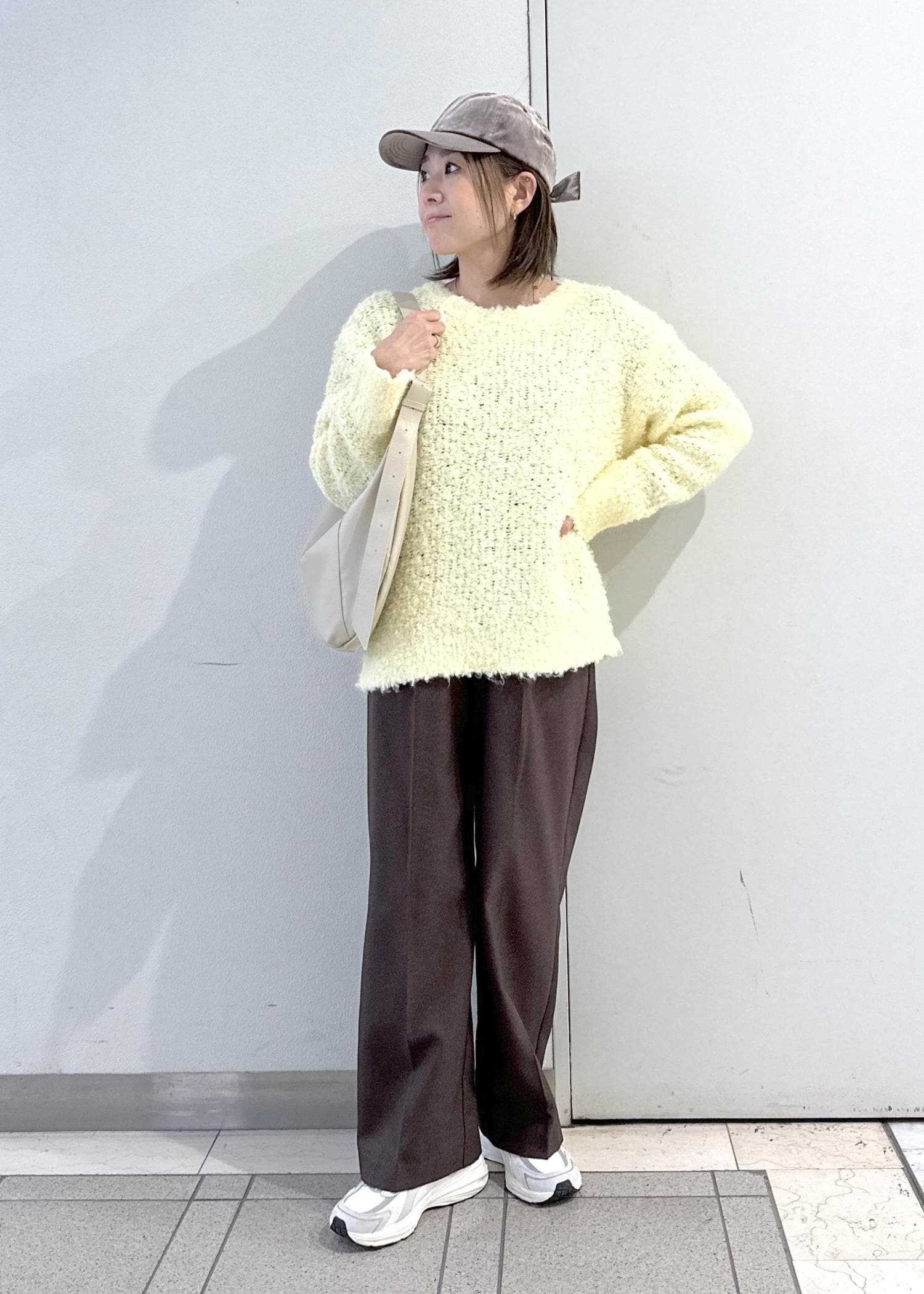 落ち着いた色合いのコーディネートなので、バッグで差し色をプラスしました!