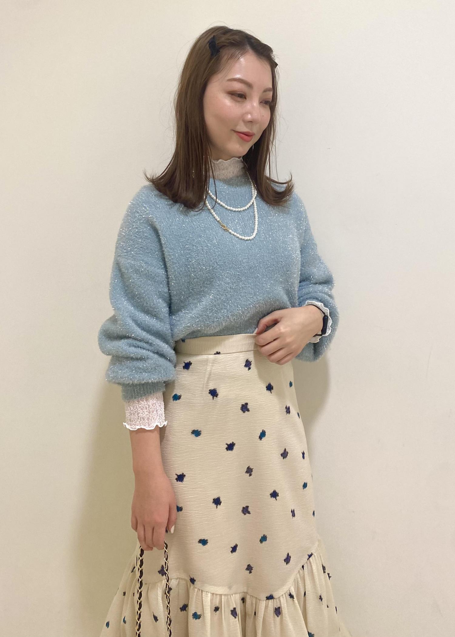 スッキリ見えするバルーンスカート。ラメトップスを合わせてフェミニンコーデに。