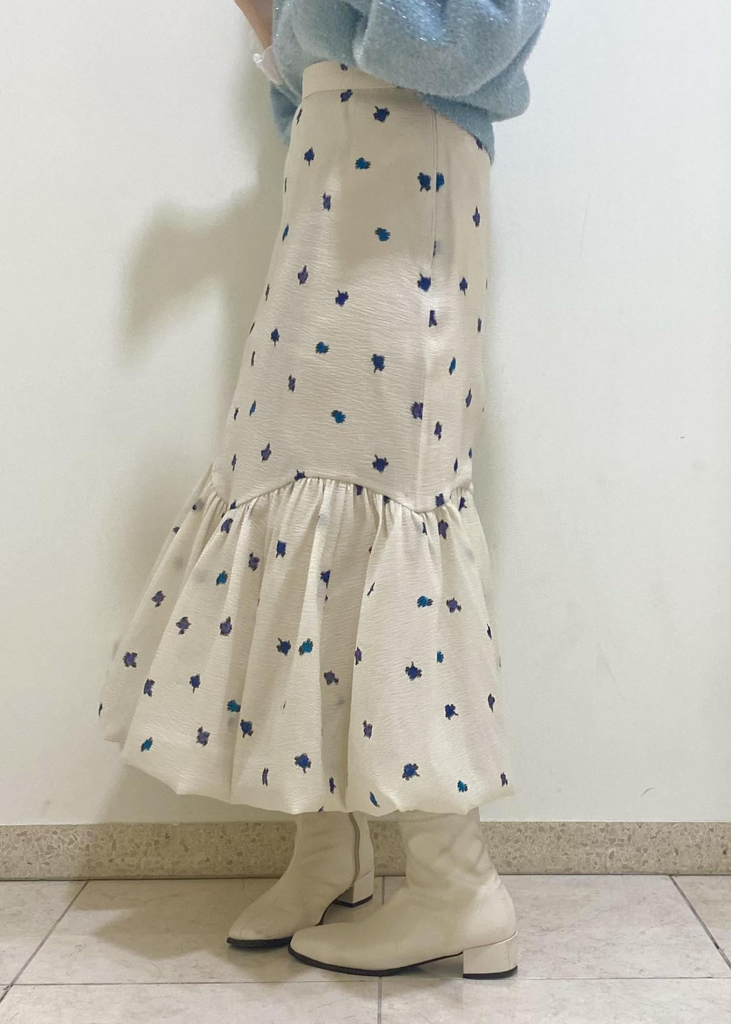 小花柄で可愛らしい印象に。ウエストゴムではないですがインできるほどのゆとりがあります。腰回りは程よくフィットするマーメイドなのでバルーンシルエットながらスッキリした着こなし。若干透け感があるので下着はベージュなどの同系色がおすすめ。
