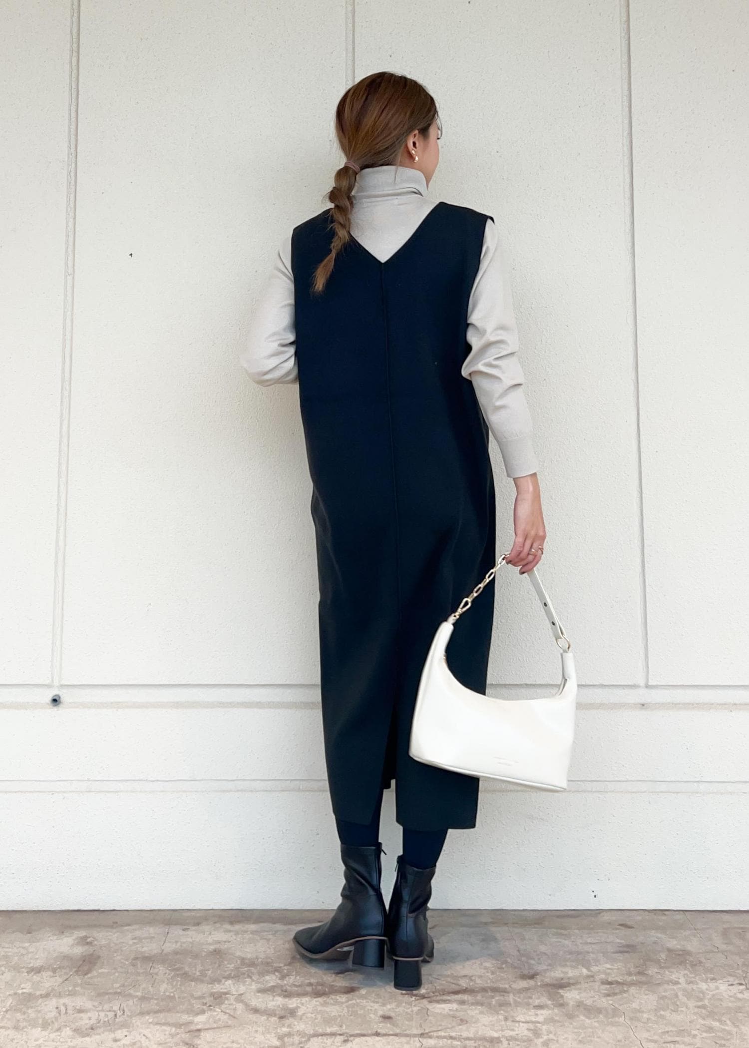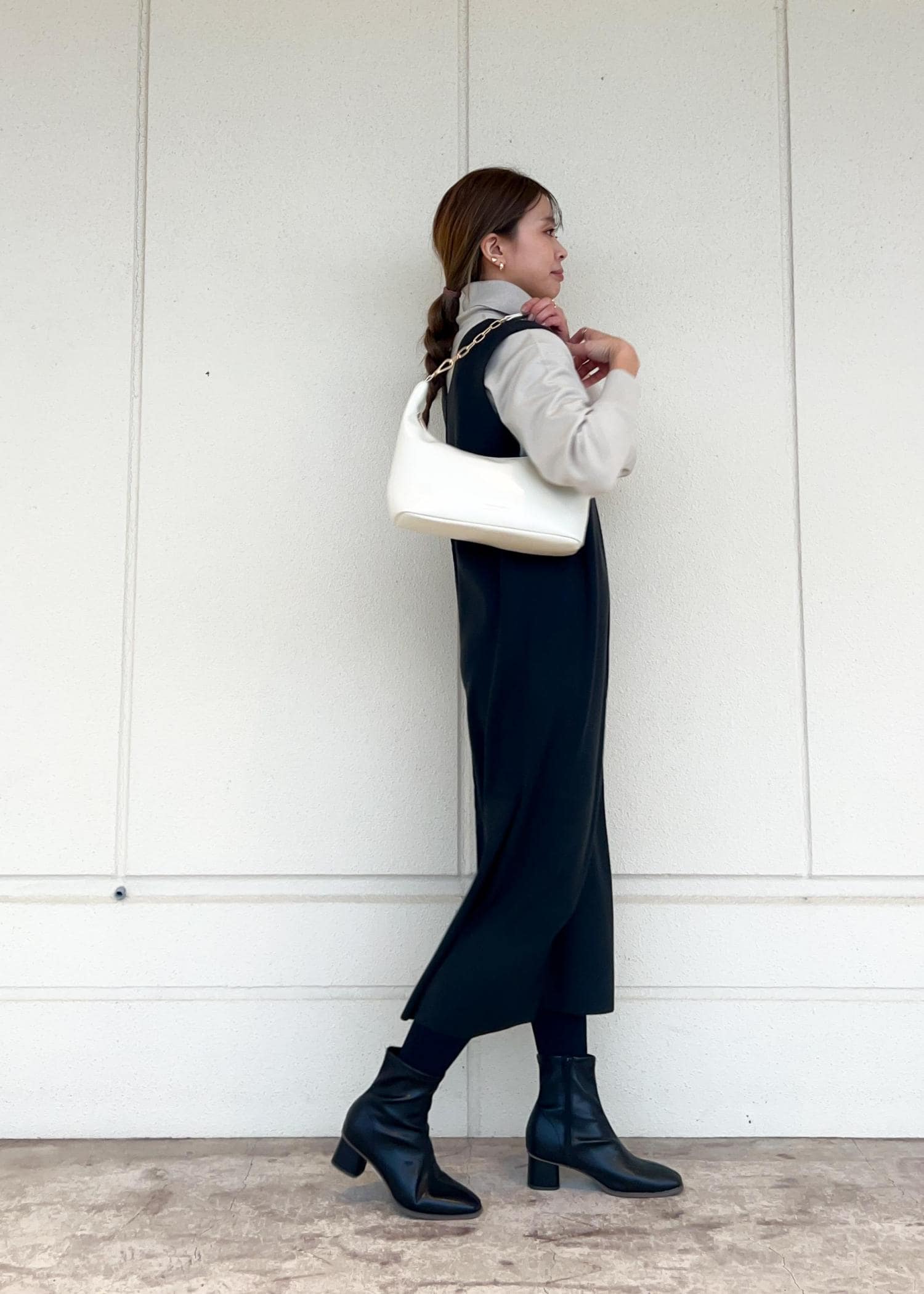人気のニットジャンスカの新色グレーは、黒よりも少し柔らかさのある色み。
