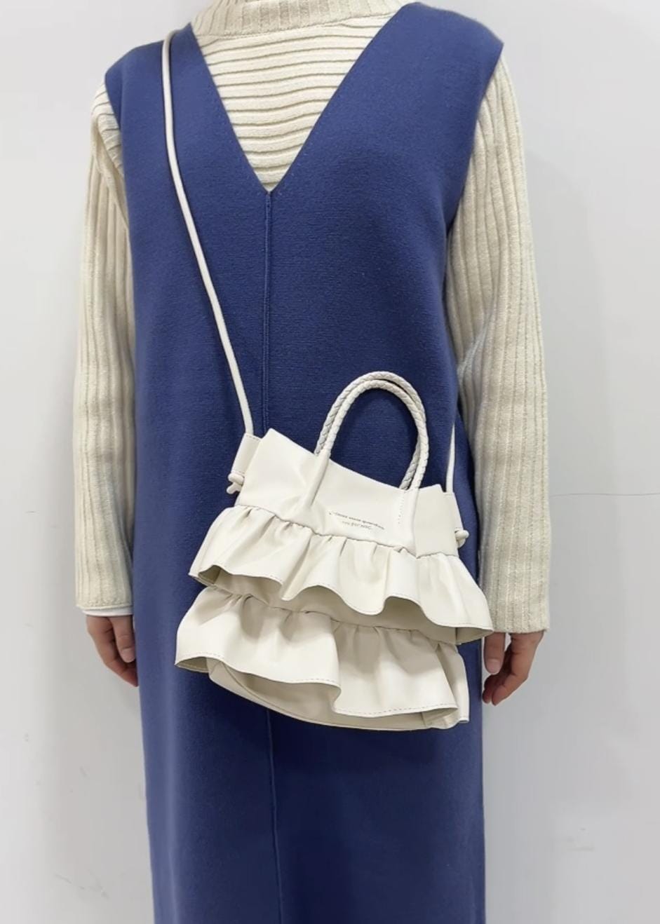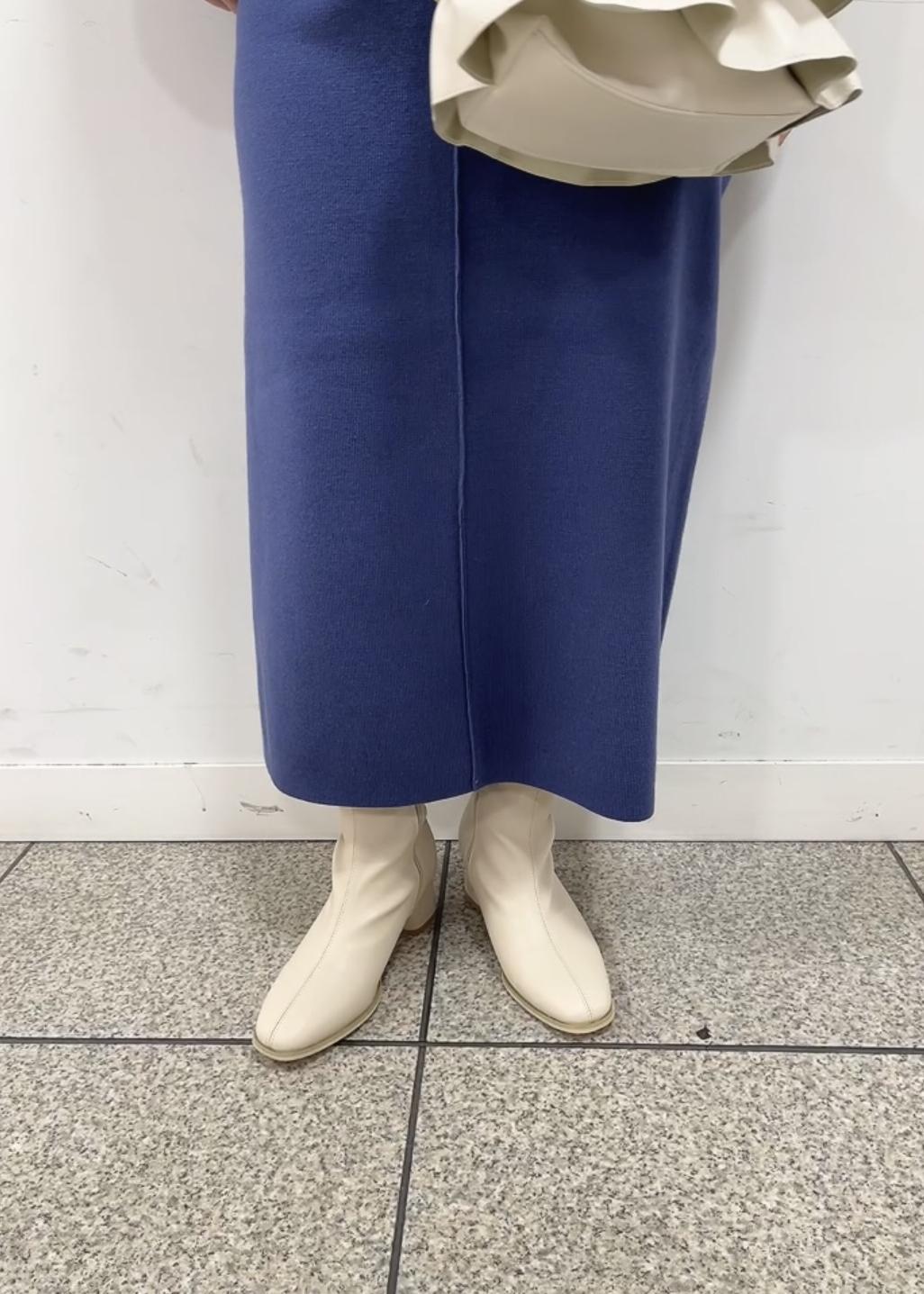 インナーとブーツ、バッグをホワイトにして、よりブルーが映えるコーデにしました。カラー苦手な方も挑戦しやすいブルーニットワンピースにしました。